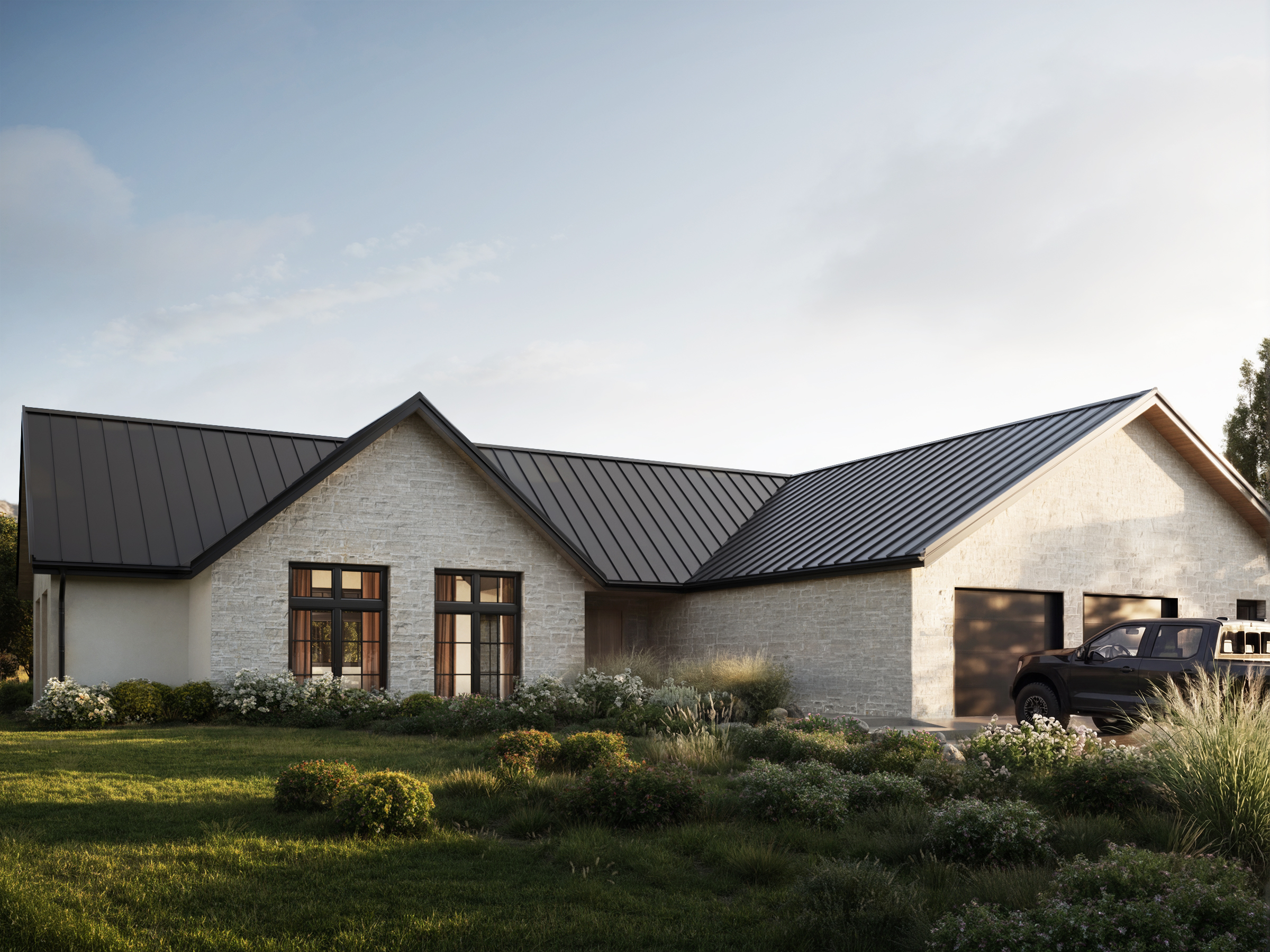 Budynek składa się z kilku połączonych skrzydeł, co pozwoliło na naturalny podział na strefy funkcjonalne: dzienną, prywatną i gospodarczą. Taki układ nadaje bryle lekkości, rozbija jej skalę i sprawia, że dom nie dominuje krajobrazu, lecz płynnie się w niego wpisuje. Skośne dachy, proste formy oraz czytelna geometria budują nowoczesny, ale spokojny charakter architektury.