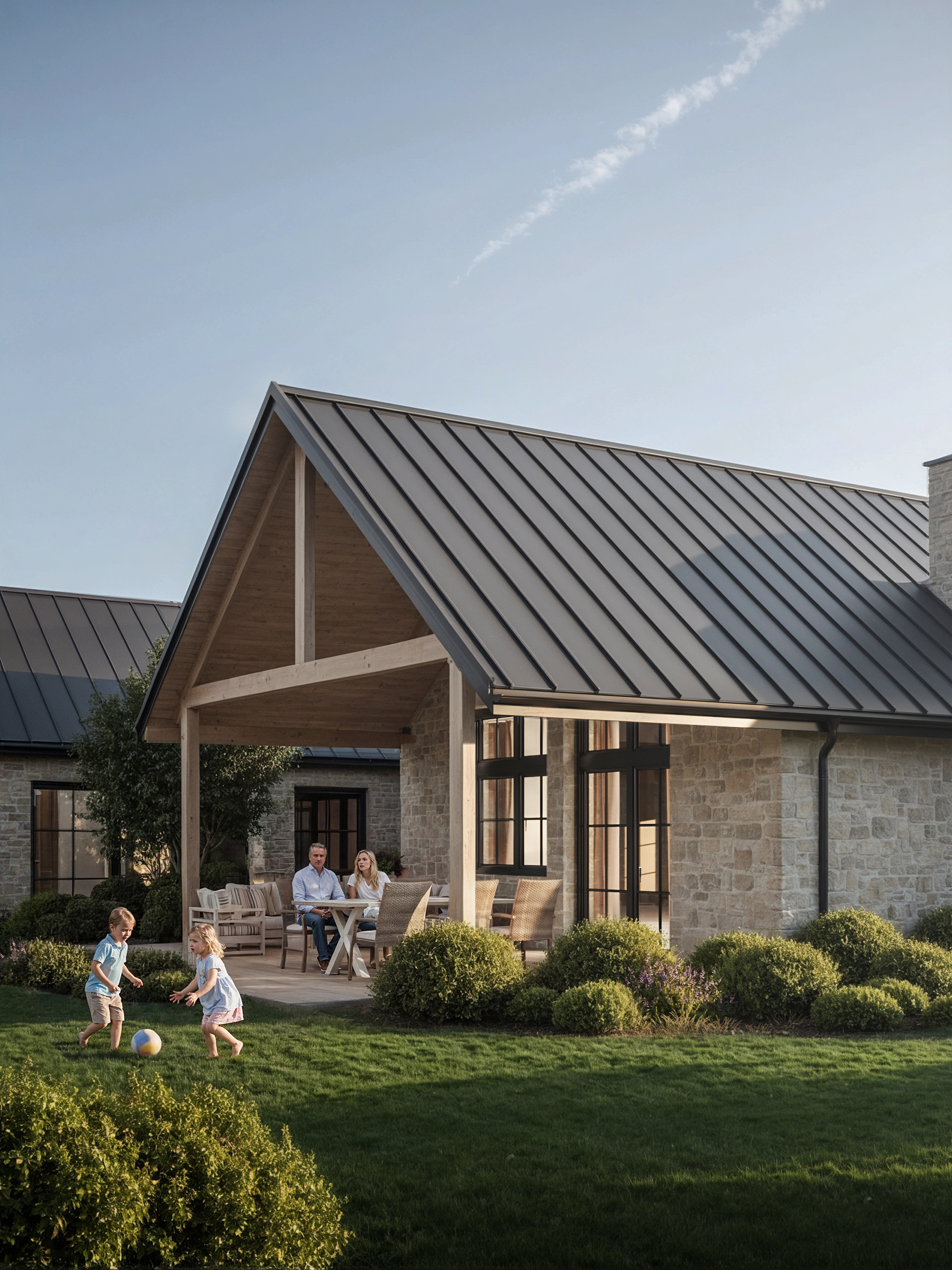Projekt łączy estetykę z funkcjonalnością – przestrzeń domu została zaprojektowana z myślą o codziennym życiu rodzinnym, komforcie użytkowania i elastyczności. Układ skrzydeł sprzyja prywatności, a strefa tarasowa i ogrodowa staje się naturalnym przedłużeniem części dziennej domu.