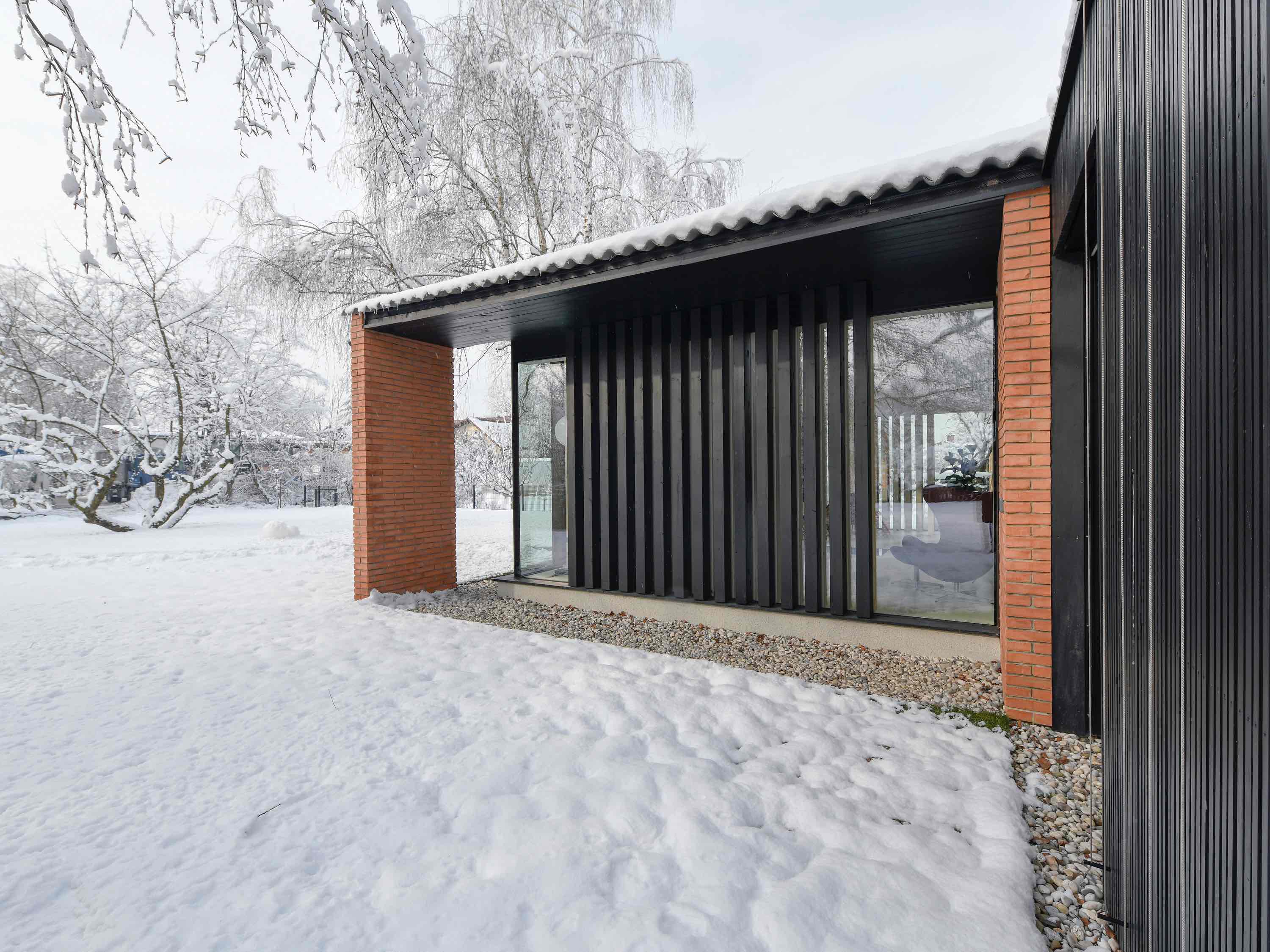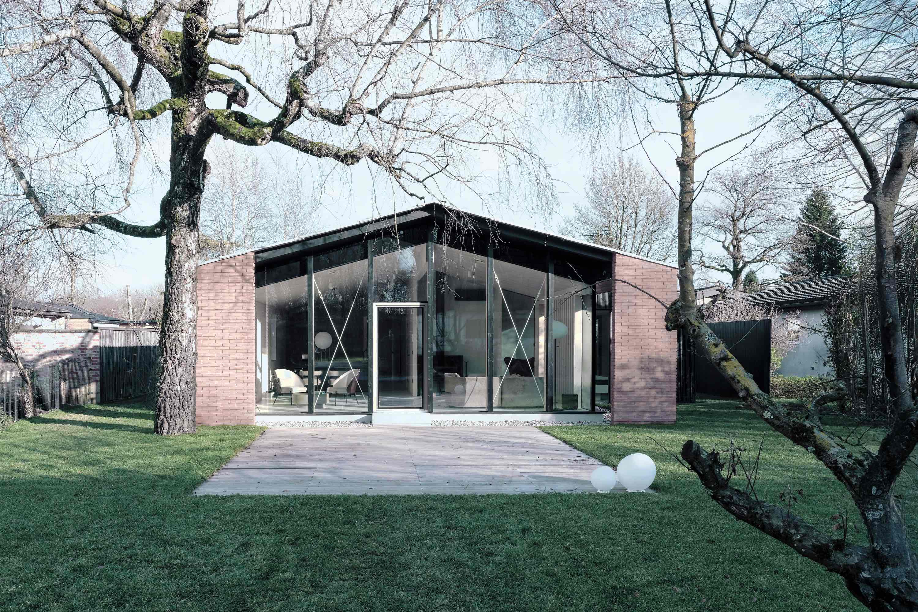 W kierunku parku dodano współczesną rozbudowę o lekkiej, transparentnej formie przypominającej szklarnię. Dwa ceglane słupy – identyczne jak te z dawnej fasady – tworzą wizualny pomost między nowym a dawnym domem. Pod zachowaną brzozą zaprojektowano fundament, który omija system korzeniowy, a wydłużony dach spaja starą i nową część w jedną całość.