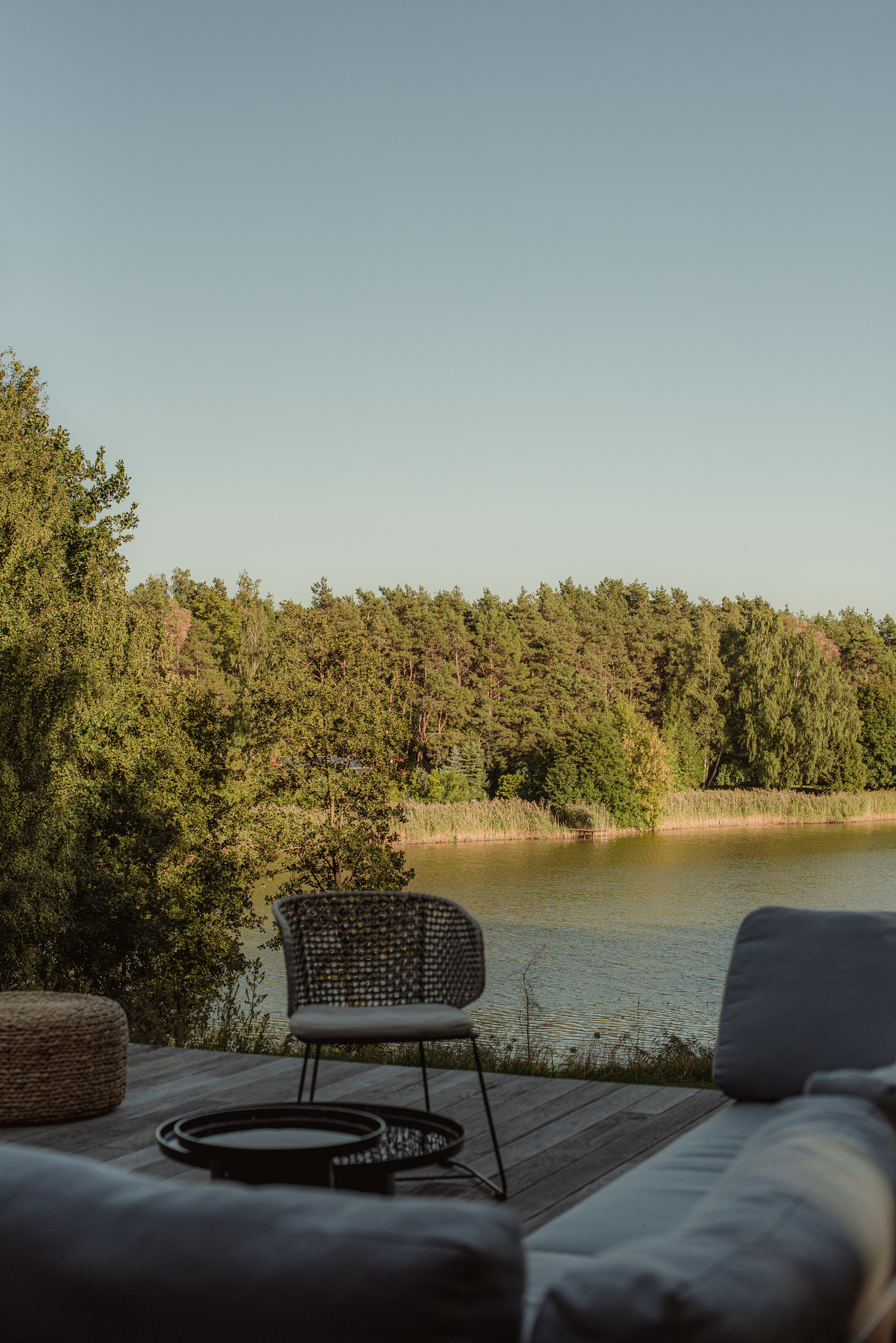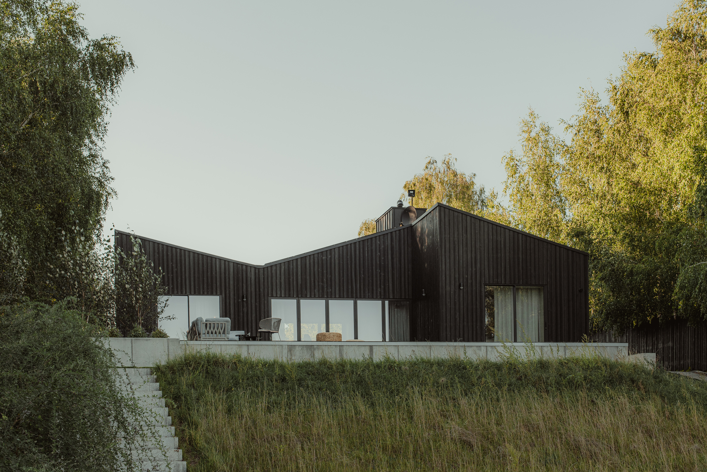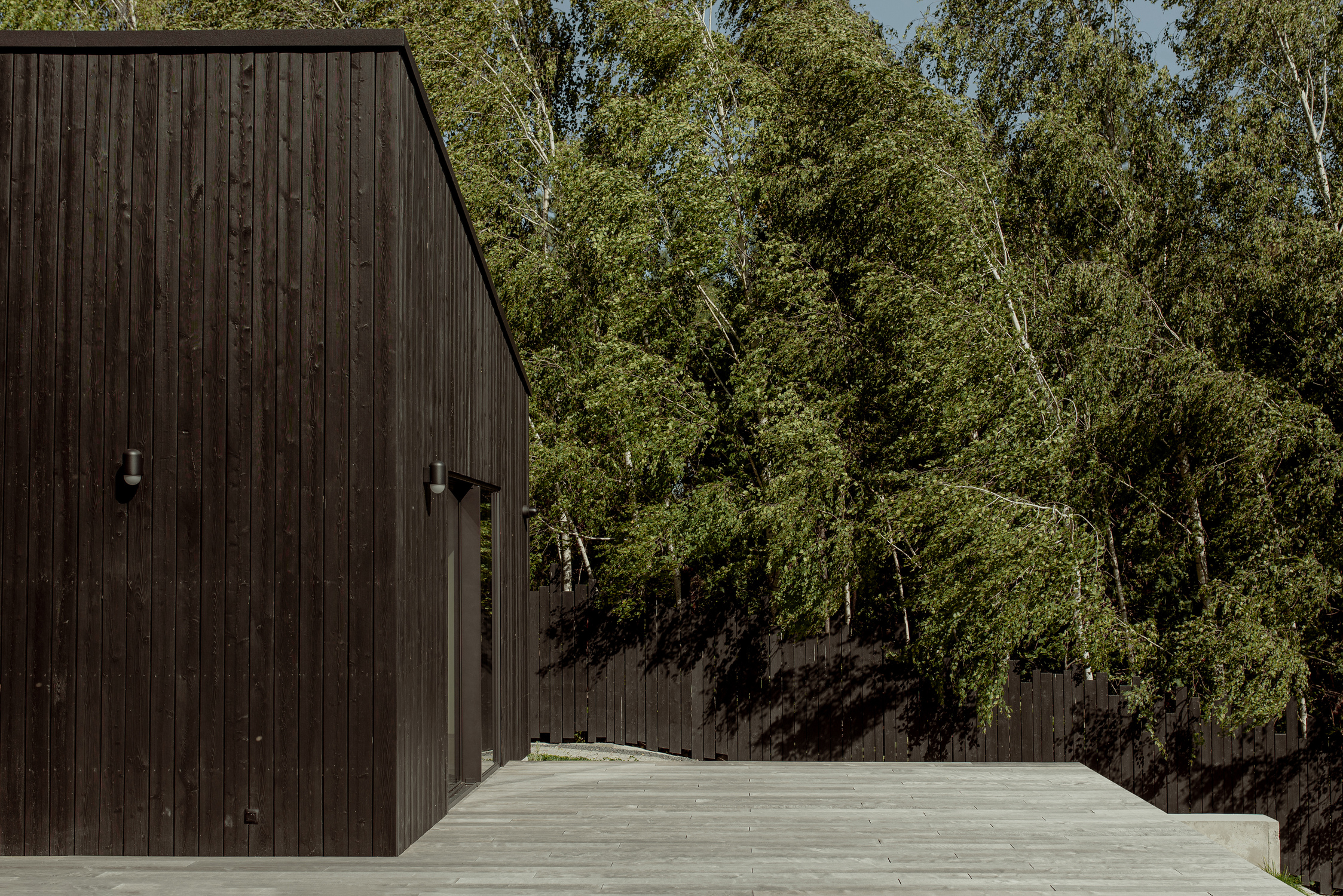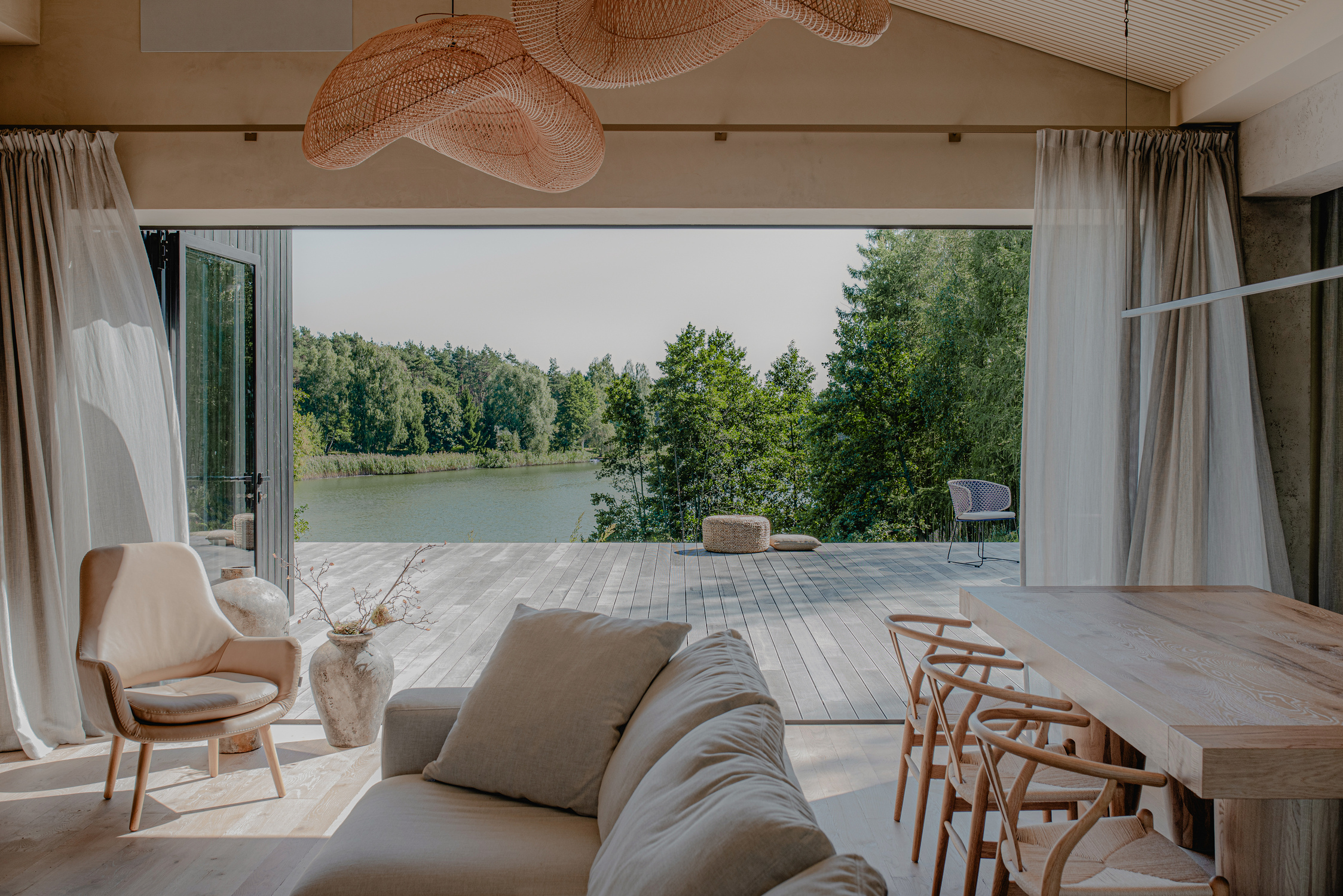 Idea domu polega na kontroli doświadczenia zewnętrza w sposób, który odpowiada stylowi wypoczynku, pogodzie i oczekiwaniom użytkownika. Dzięki przesuwnym ścianom od strony jeziora i zachodniej werandy, salon z jadalnią mogą zostać przekształcone w zadaszone przedłużenie tarasu. Możliwość zamykania każdej ze ścian osobno pozwala na swobodne kreowanie przestrzeni, w przypadku wiatru, chłodu lub chęci wydzielenia przestrzeni. Kominek wbudowany w ścianę akumulacyjną oddzielający strefę sypialnianą od dziennej, poza oczywistym zastosowaniem w zimę, może jednocześnie wydłużyć okres, w którym korzystamy z otwartego salonu na wiosnę i jesień.
