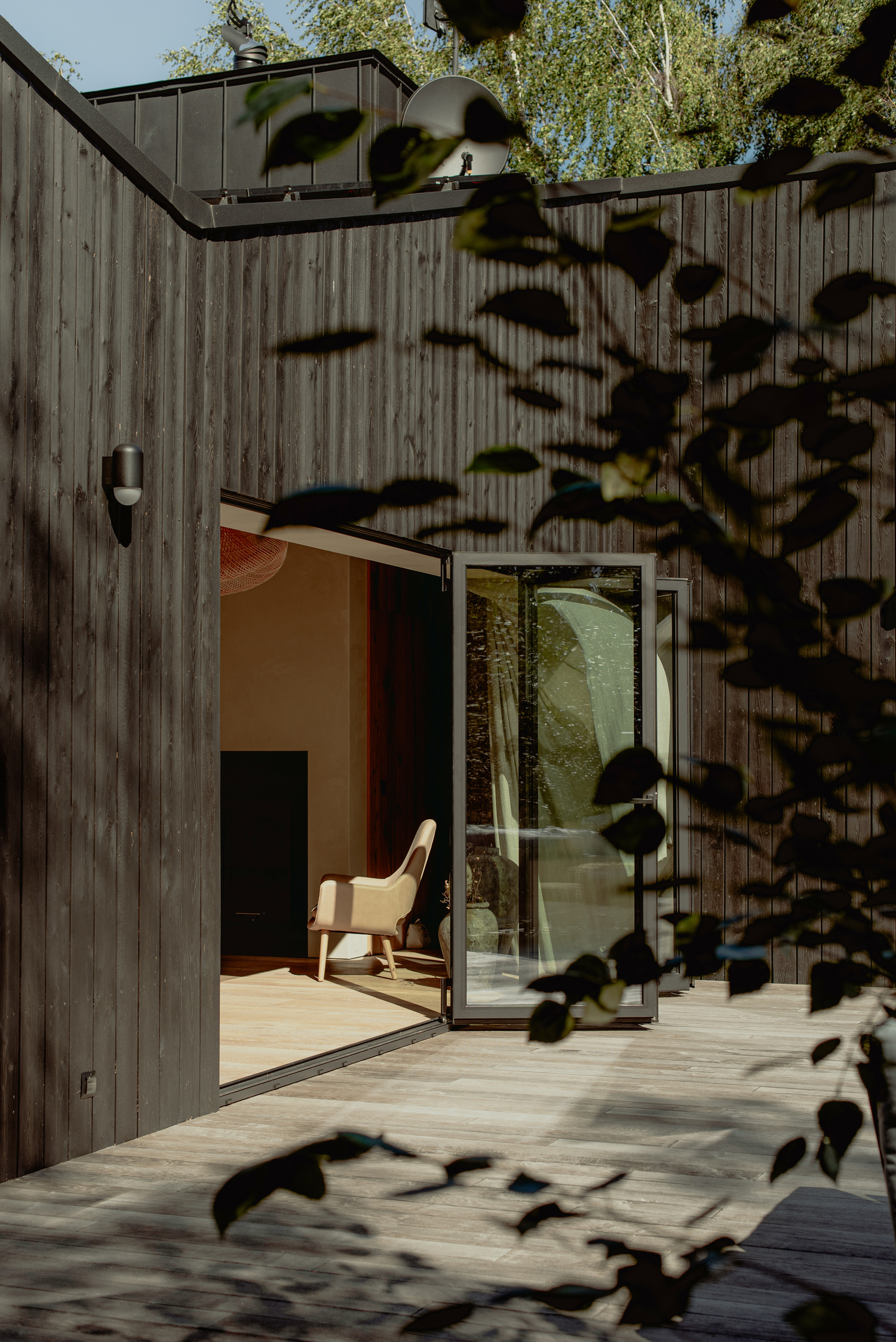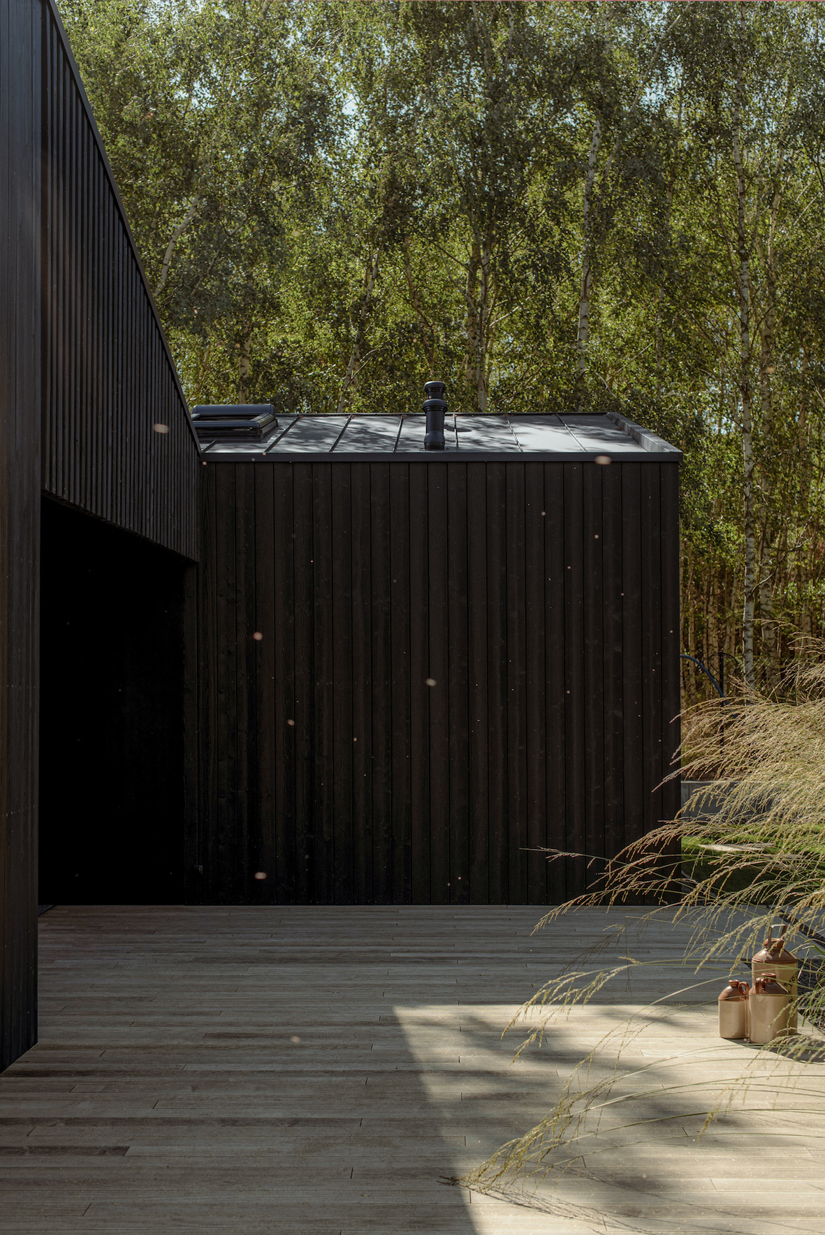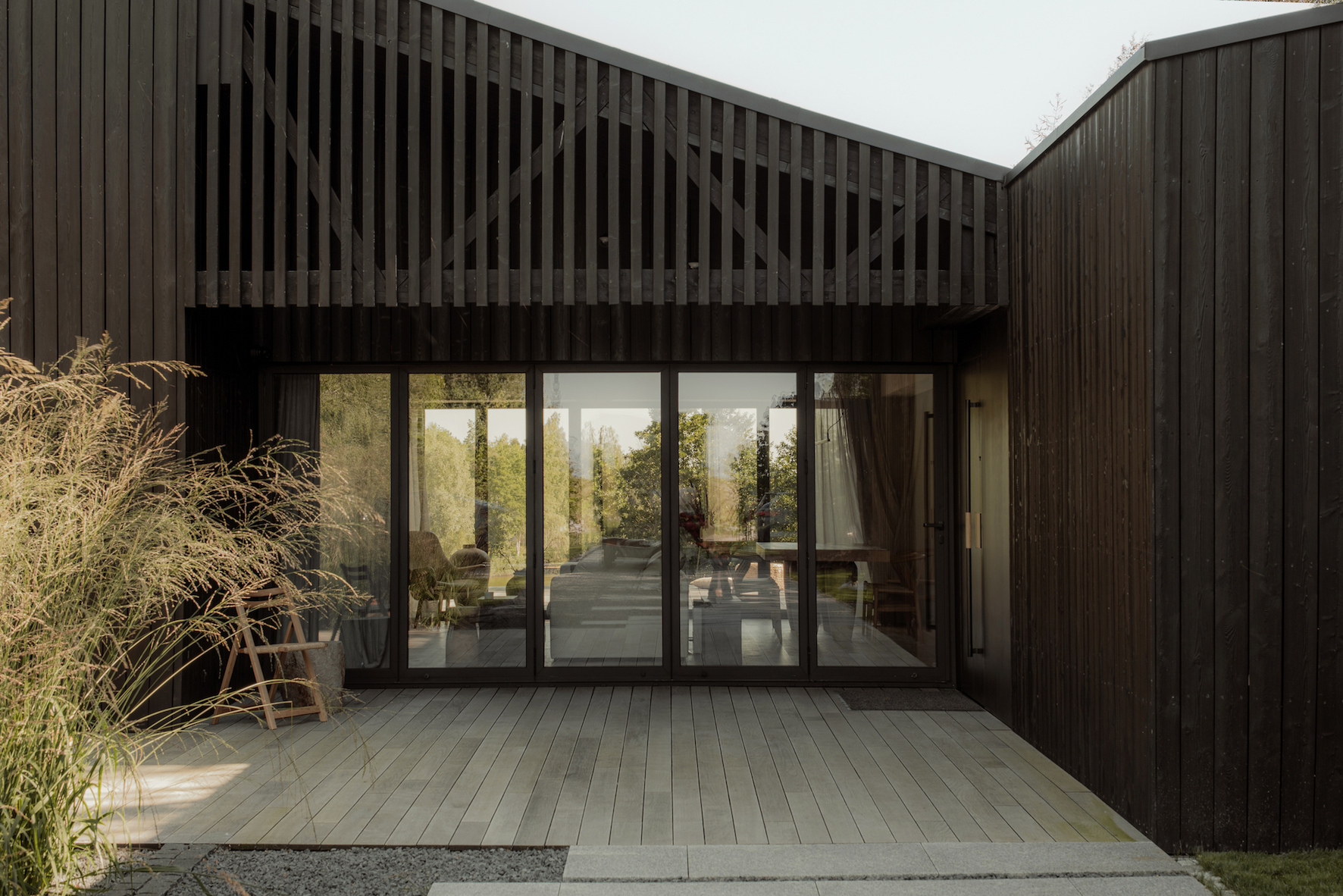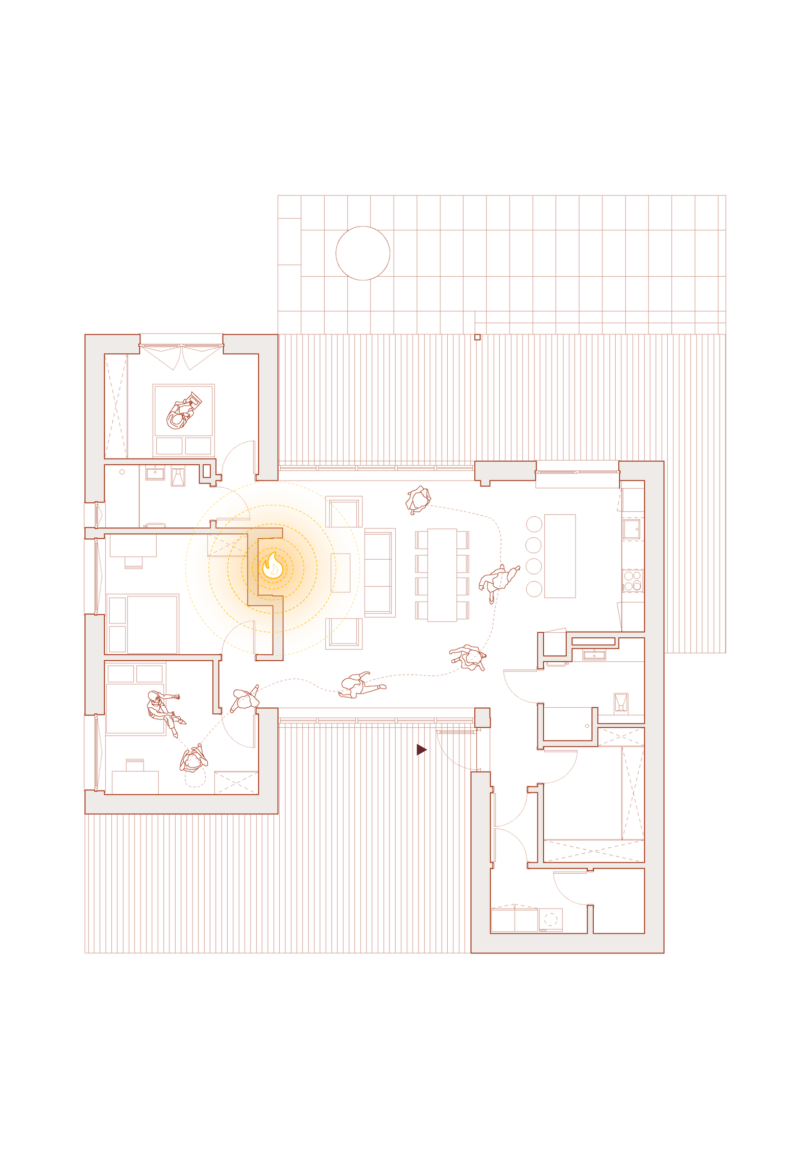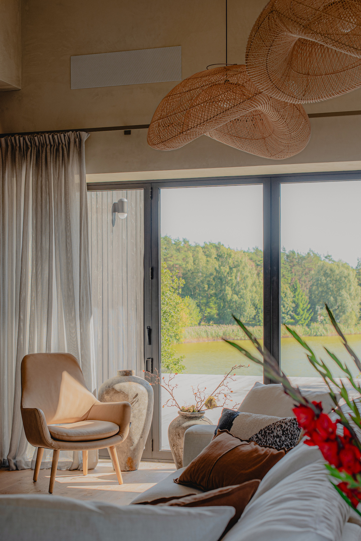 Idea domu polega na kontroli doświadczenia zewnętrza w sposób, który odpowiada stylowi wypoczynku, pogodzie i oczekiwaniom użytkownika. Dzięki przesuwnym ścianom od strony jeziora i zachodniej werandy, salon z jadalnią mogą zostać przekształcone w zadaszone przedłużenie tarasu. Możliwość zamykania każdej ze ścian osobno pozwala na swobodne kreowanie przestrzeni, w przypadku wiatru, chłodu lub chęci wydzielenia przestrzeni. Kominek wbudowany w ścianę akumulacyjną oddzielający strefę sypialnianą od dziennej, poza oczywistym zastosowaniem w zimę, może jednocześnie wydłużyć okres, w którym korzystamy z otwartego salonu na wiosnę i jesień.