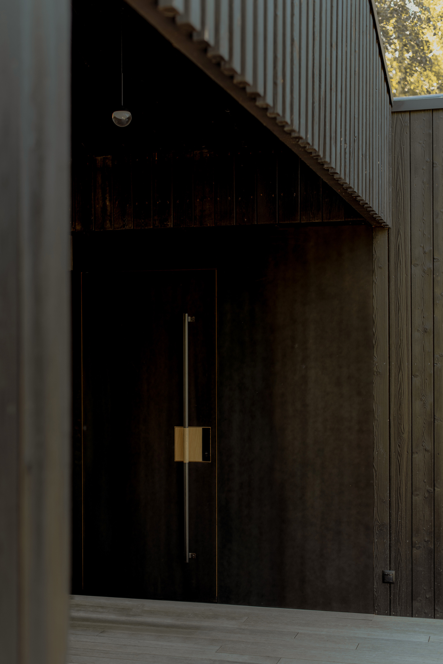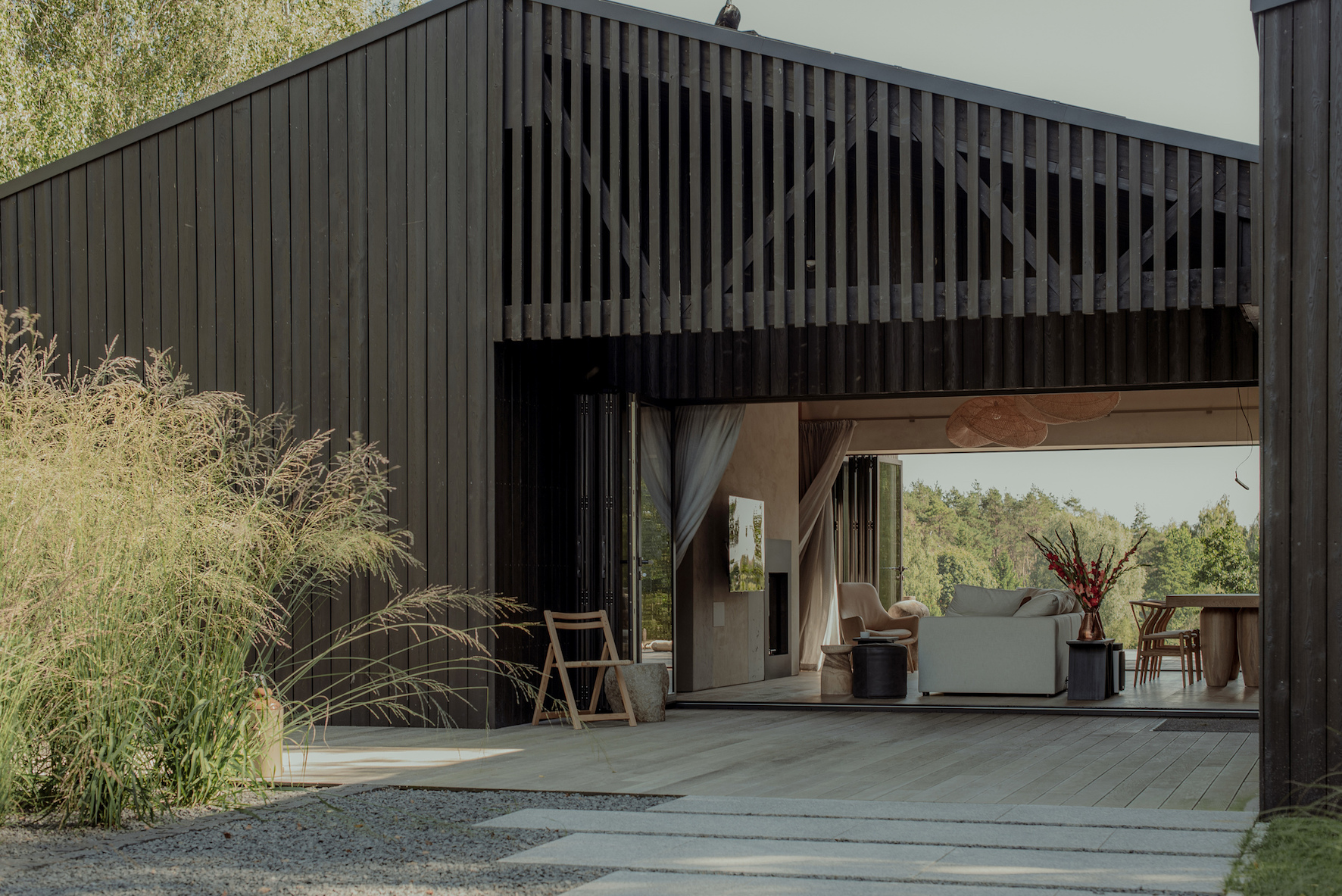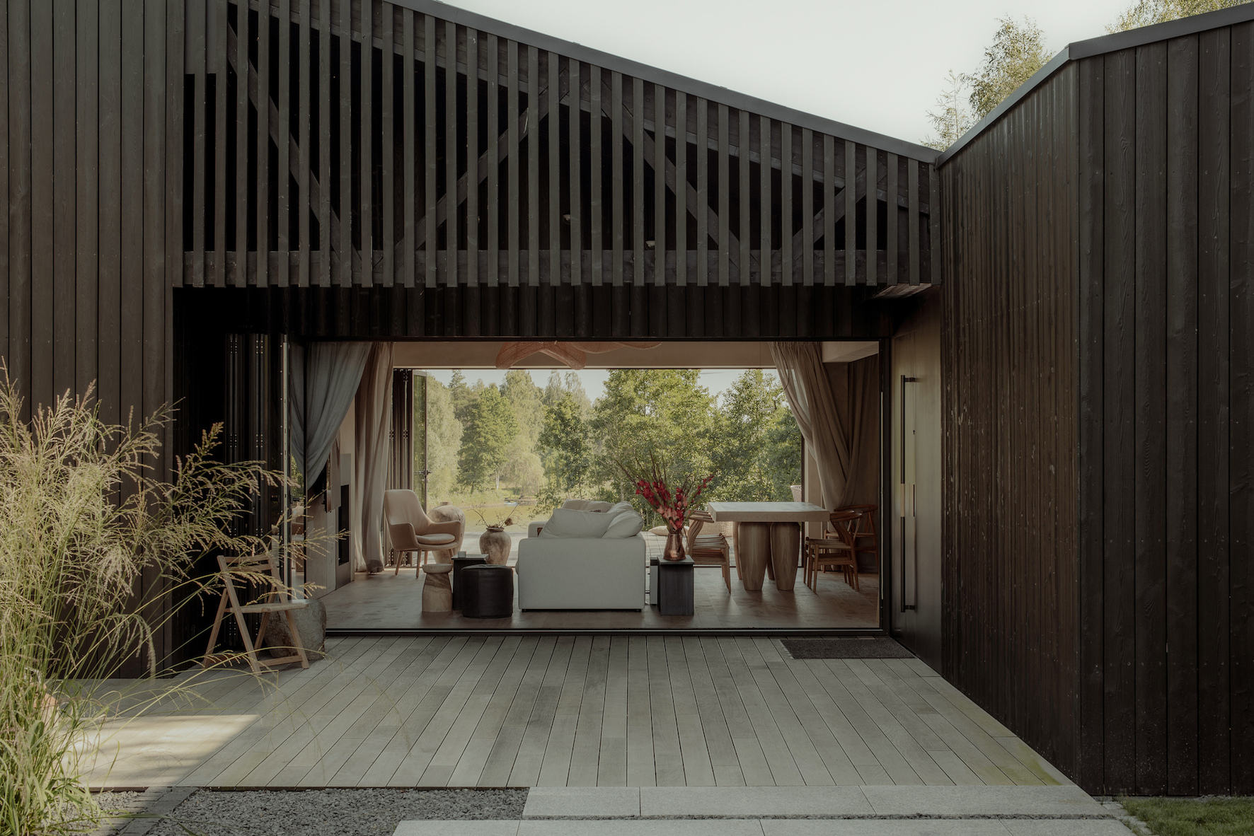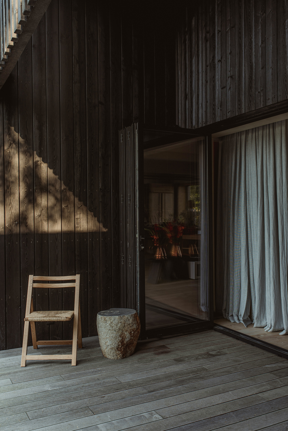 Idea domu polega na kontroli doświadczenia zewnętrza w sposób, który odpowiada stylowi wypoczynku, pogodzie i oczekiwaniom użytkownika. Dzięki przesuwnym ścianom od strony jeziora i zachodniej werandy, salon z jadalnią mogą zostać przekształcone w zadaszone przedłużenie tarasu. Możliwość zamykania każdej ze ścian osobno pozwala na swobodne kreowanie przestrzeni, w przypadku wiatru, chłodu lub chęci wydzielenia przestrzeni. Kominek wbudowany w ścianę akumulacyjną oddzielający strefę sypialnianą od dziennej, poza oczywistym zastosowaniem w zimę, może jednocześnie wydłużyć okres, w którym korzystamy z otwartego salonu na wiosnę i jesień.