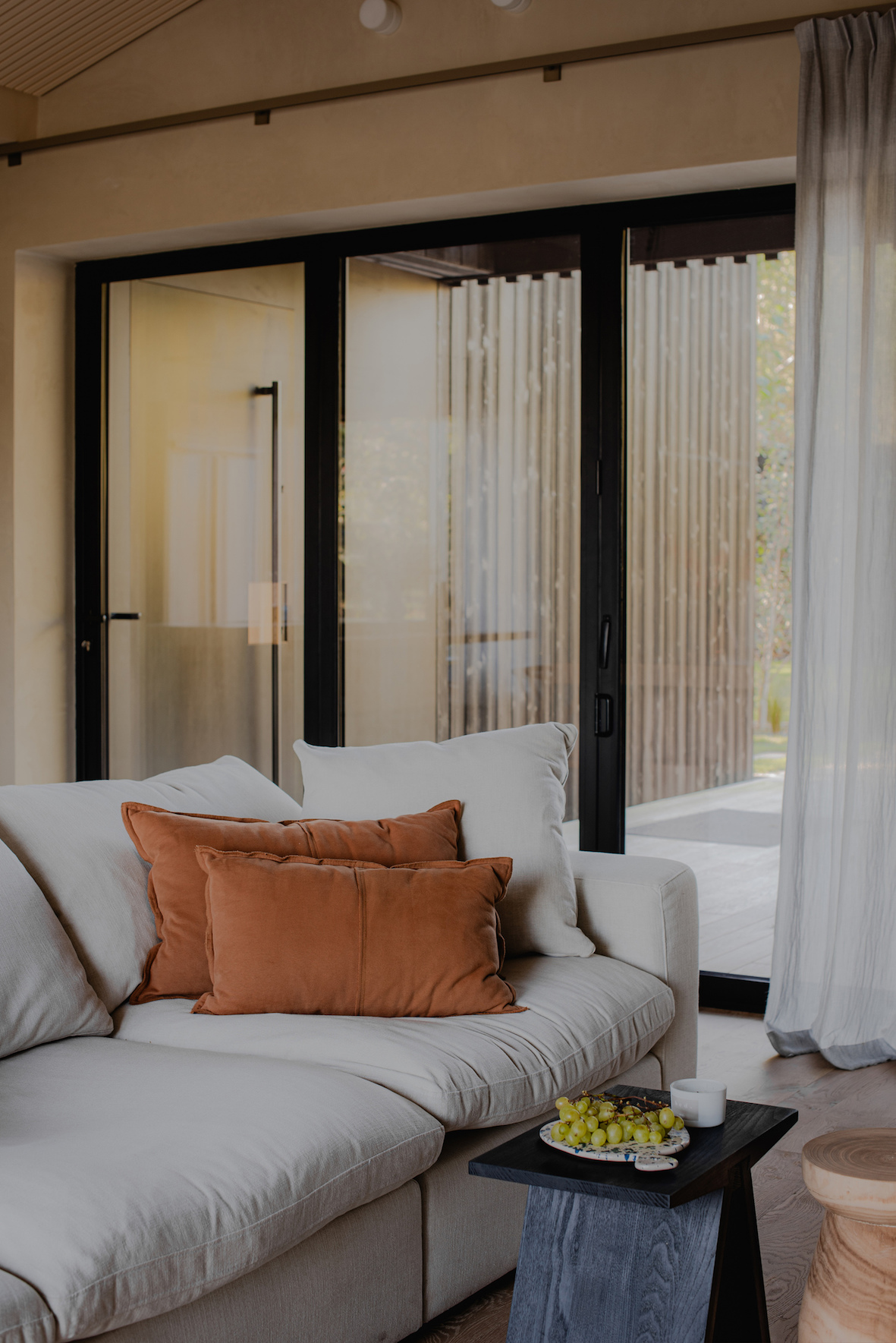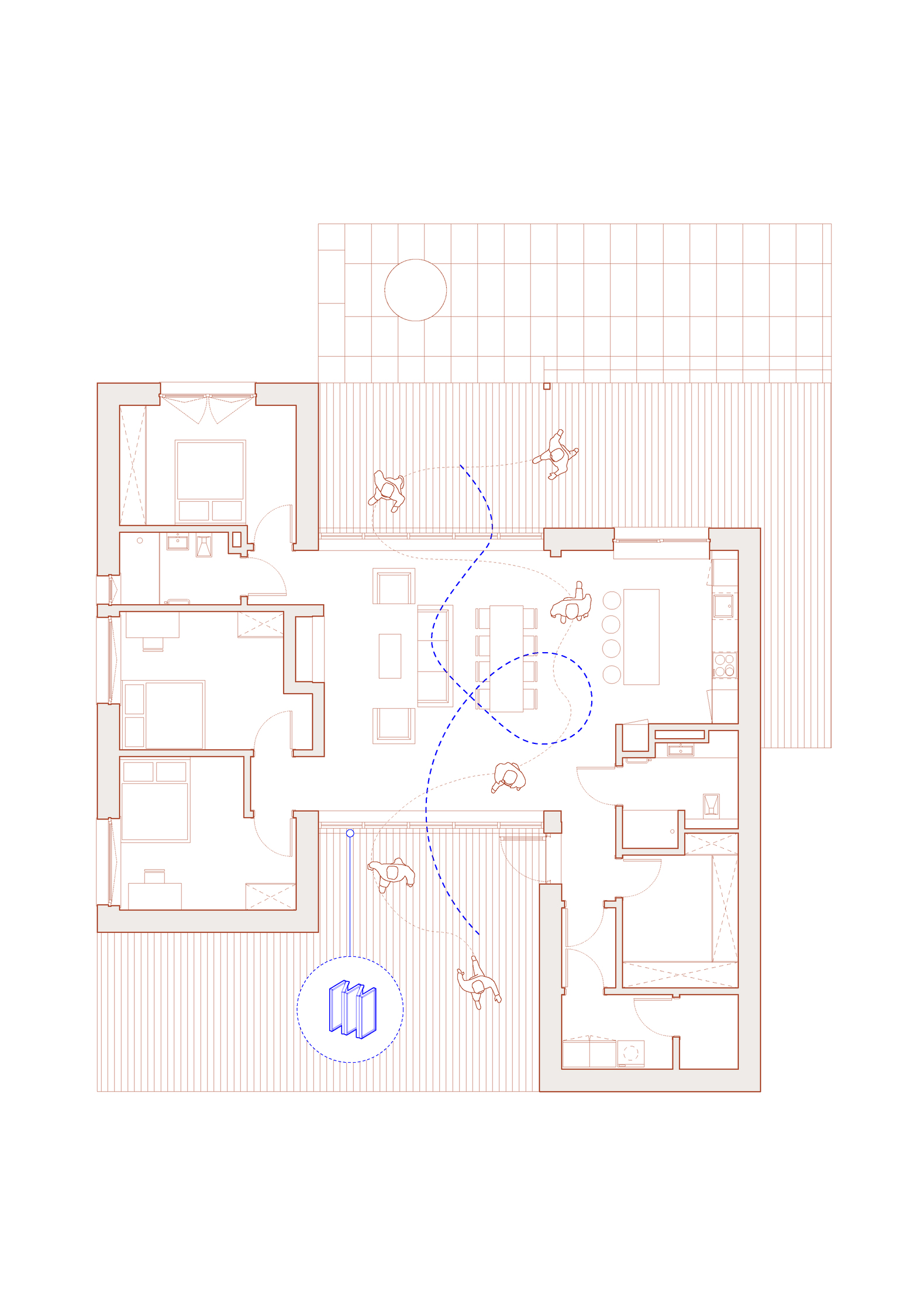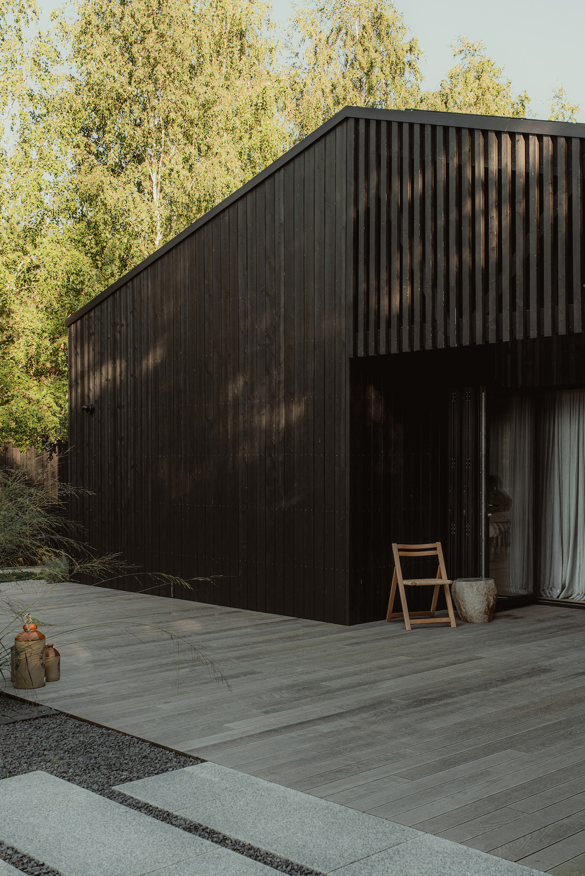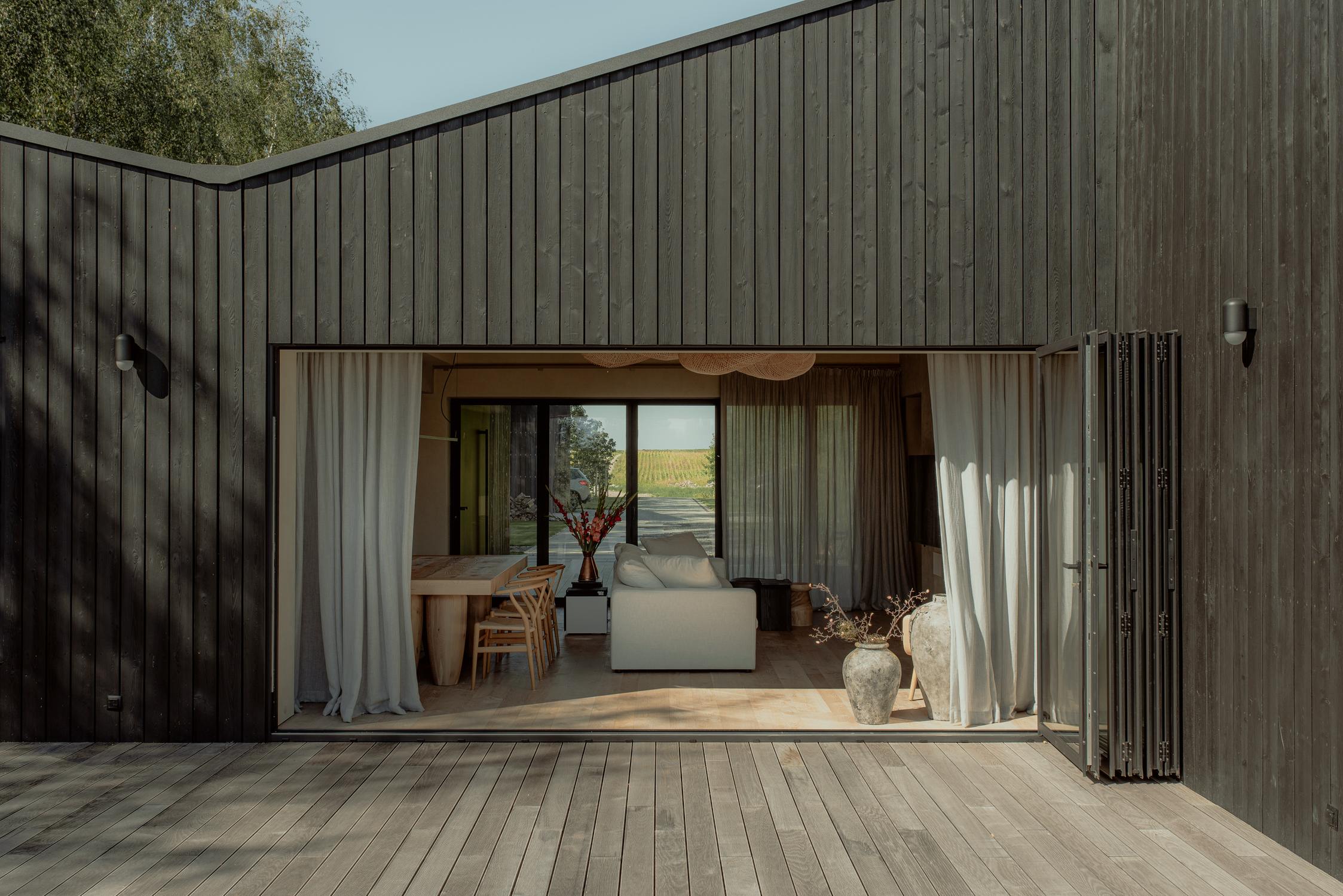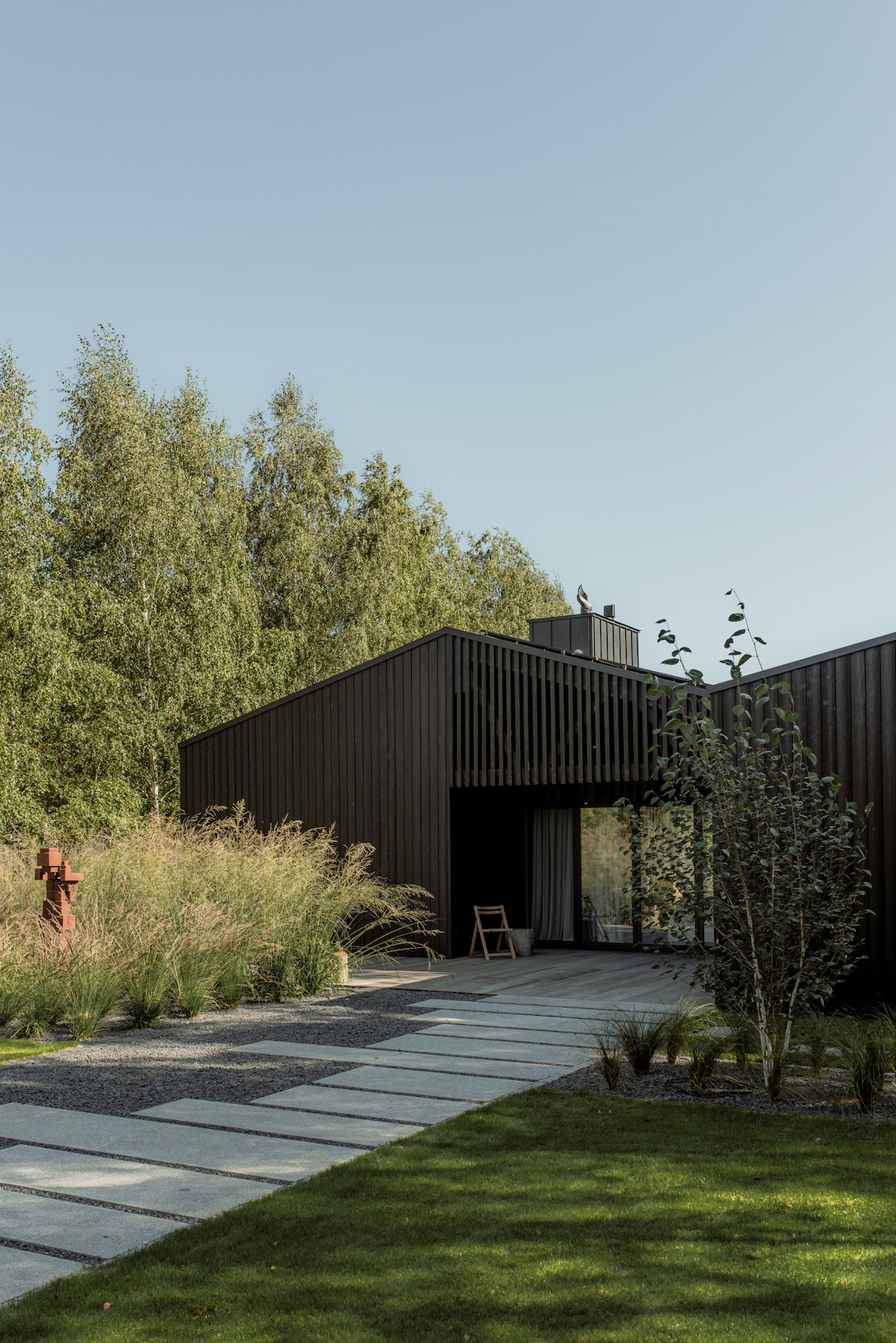 Idea domu polega na kontroli doświadczenia zewnętrza w sposób, który odpowiada stylowi wypoczynku, pogodzie i oczekiwaniom użytkownika. Dzięki przesuwnym ścianom od strony jeziora i zachodniej werandy, salon z jadalnią mogą zostać przekształcone w zadaszone przedłużenie tarasu. Możliwość zamykania każdej ze ścian osobno pozwala na swobodne kreowanie przestrzeni, w przypadku wiatru, chłodu lub chęci wydzielenia przestrzeni. Kominek wbudowany w ścianę akumulacyjną oddzielający strefę sypialnianą od dziennej, poza oczywistym zastosowaniem w zimę, może jednocześnie wydłużyć okres, w którym korzystamy z otwartego salonu na wiosnę i jesień.
