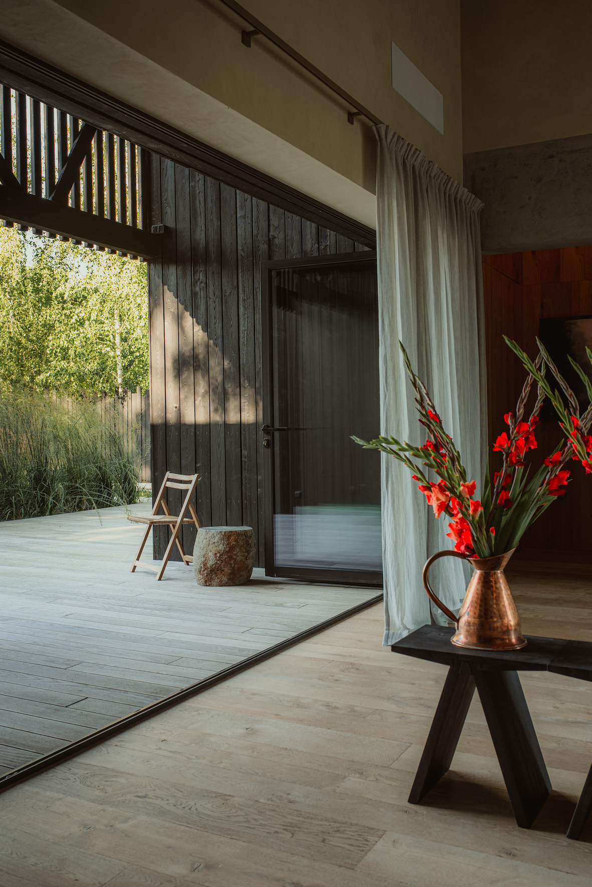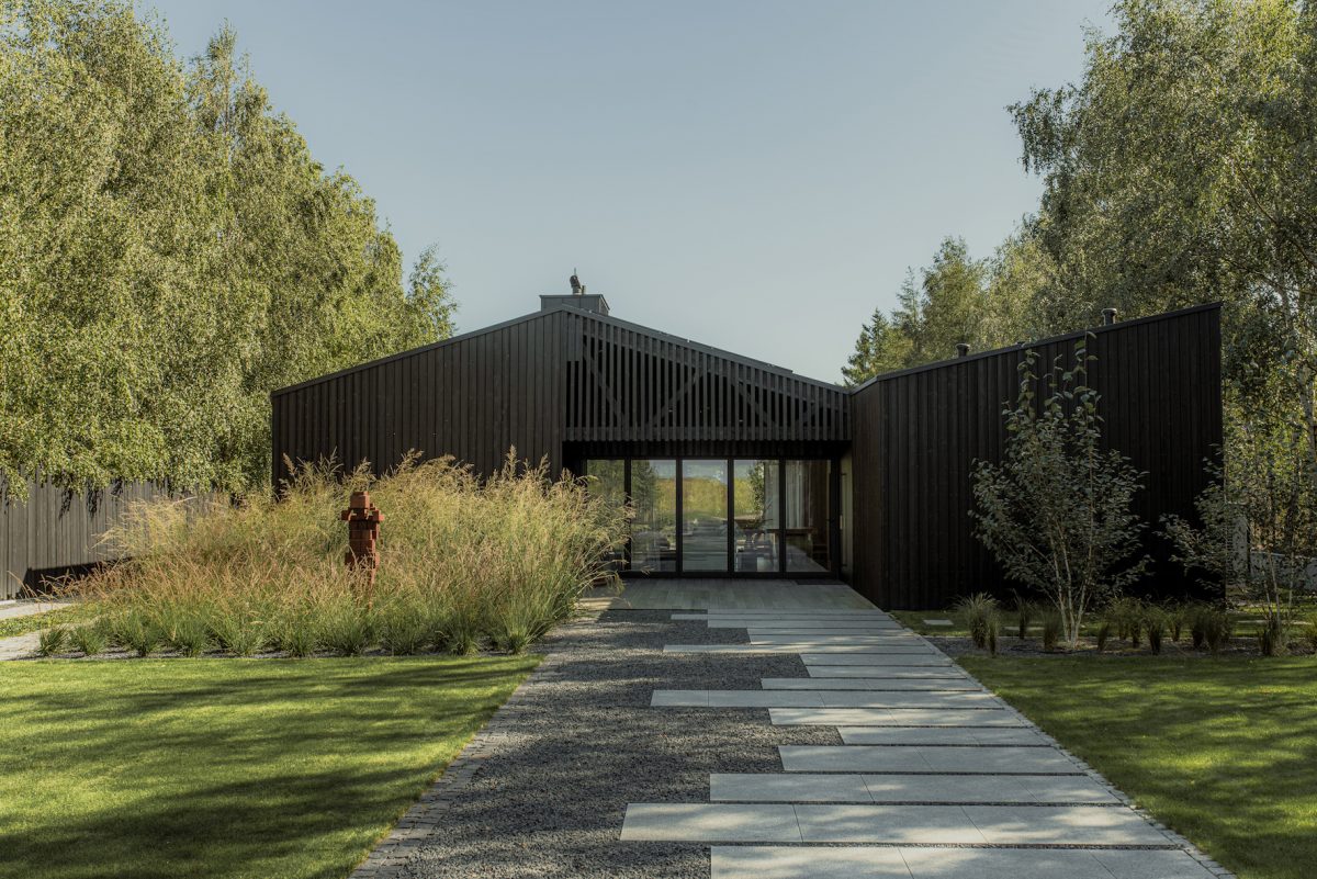 Wizualnie, chcieliśmy połączyć nowoczesną i surową bryłę z ciepłymi barwami i naturalnymi materiałami wnętrza. Z jednej strony, chcieliśmy uzyskać wrażenie nowoczesnego domu o otwartym planie i nieograniczonych możliwościach aranżacyjnych, z drugiej – przestrzeń pod 'wspólną strzechą’ w której wrażenie sielskości potęgowane jest przez nieco rustykalne wykończenia, kominek na środku otwartego salonu i przestronna jadalnia, stanowiąca organizacyjne centrum nie tylko domu, ale obu tarasów i całego zagospodarowania.