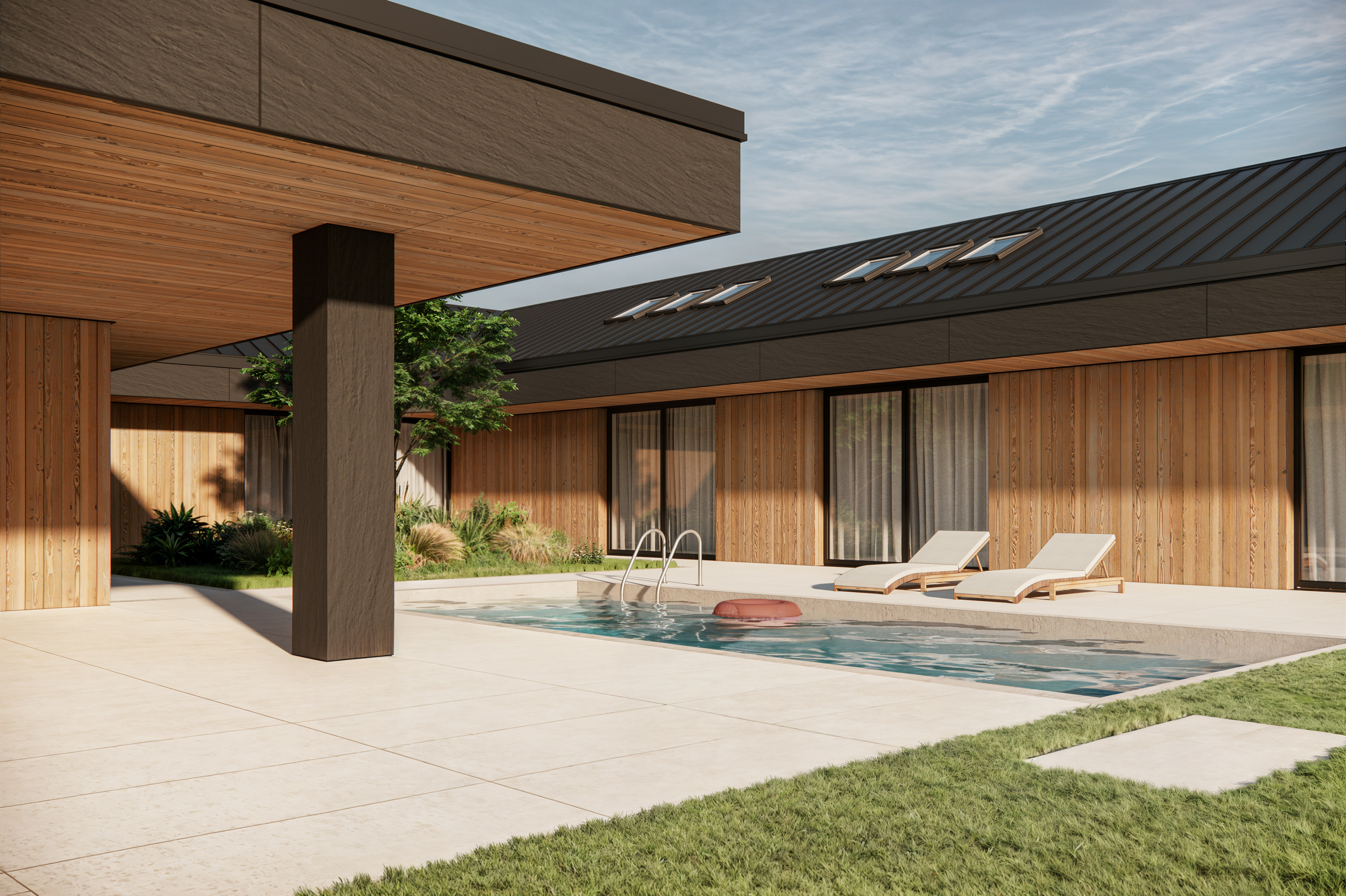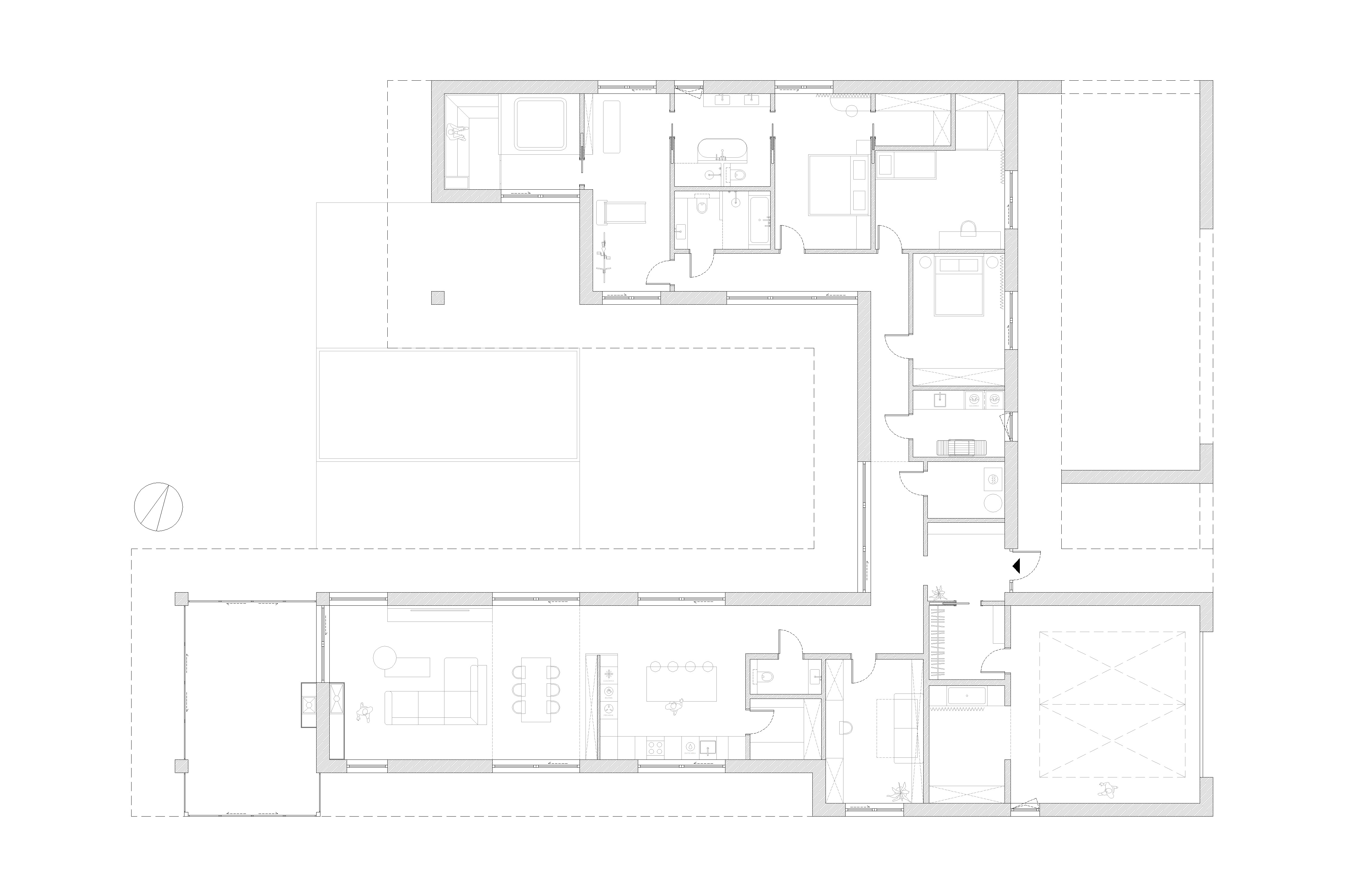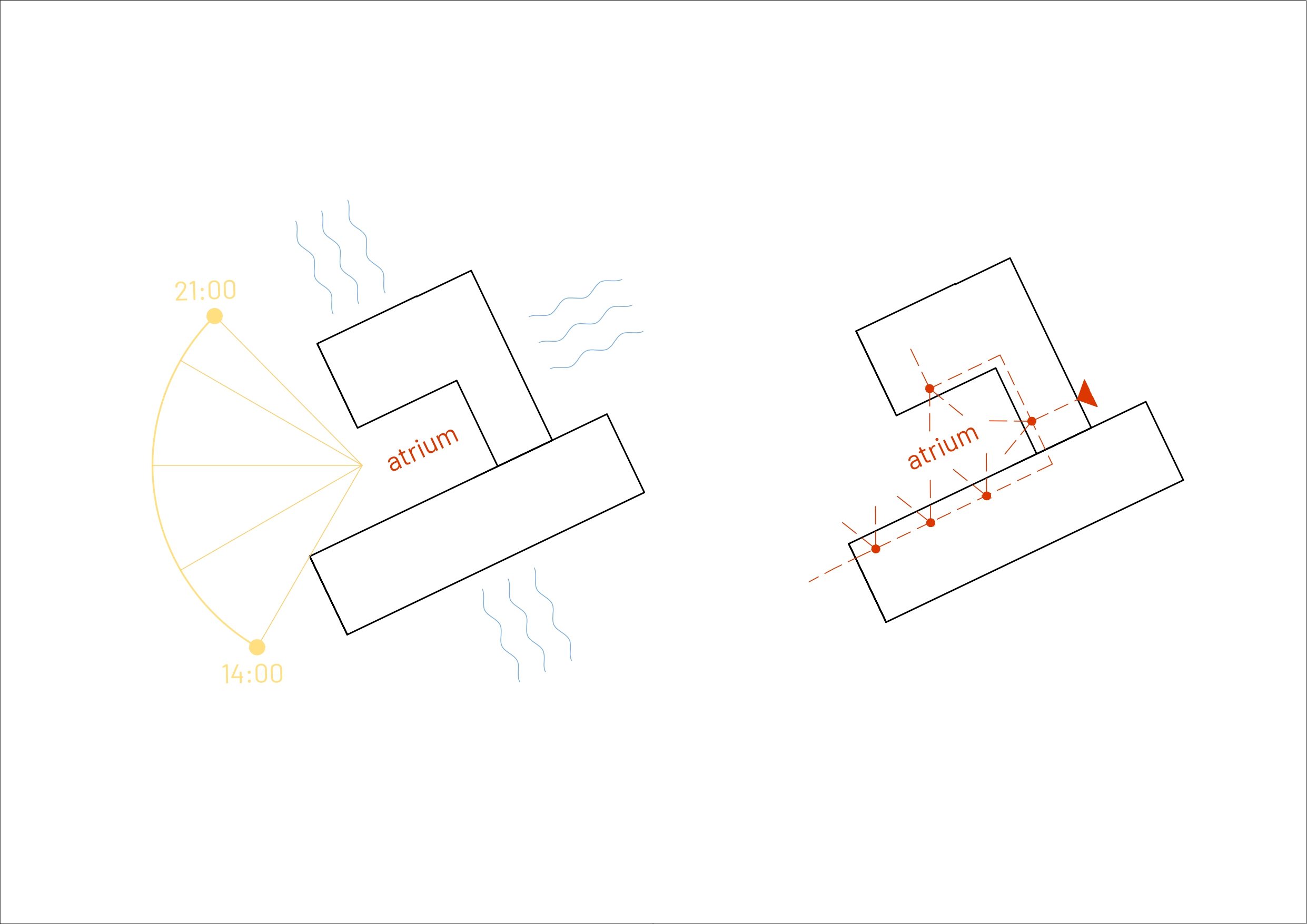 Rozwiązaniem projektowym stała się nietypowa koncepcja domu pół-atrialnego. Nietypowość wynika z obecności dwóch przestrzeni pół-atrialnych o odmiennych charakterach funkcjonalnych. Pierwsze z nich, półpubliczne, znajduje się od frontu i prowadzi użytkowników do wejścia głównego. Stanowi ono przestrzeń buforową, zapewniającą prywatność wnętrz od strony ulicy, a jednocześnie wprowadza zieleń w bezpośrednie sąsiedztwo strefy wejściowej. Drugie, w pełni prywatne, integruje ze sobą wewnętrzną część dzienną, sypialnie oraz zewnętrzną strefę rekreacji z basenem. Dzięki temu strefa ta staje się naturalnym przedłużeniem wnętrza domu, oferując mieszkańcom komfortową przestrzeń wypoczynku z widokiem na zachód. Wyraźnie wydzielone części domu łączy zarówno korytarz przyległy do atrium, jak - w przypadku cieplejszych miesięcy - sama przestrzeń atrium, która może pełnić rolę rozszerzonej komunikacji.