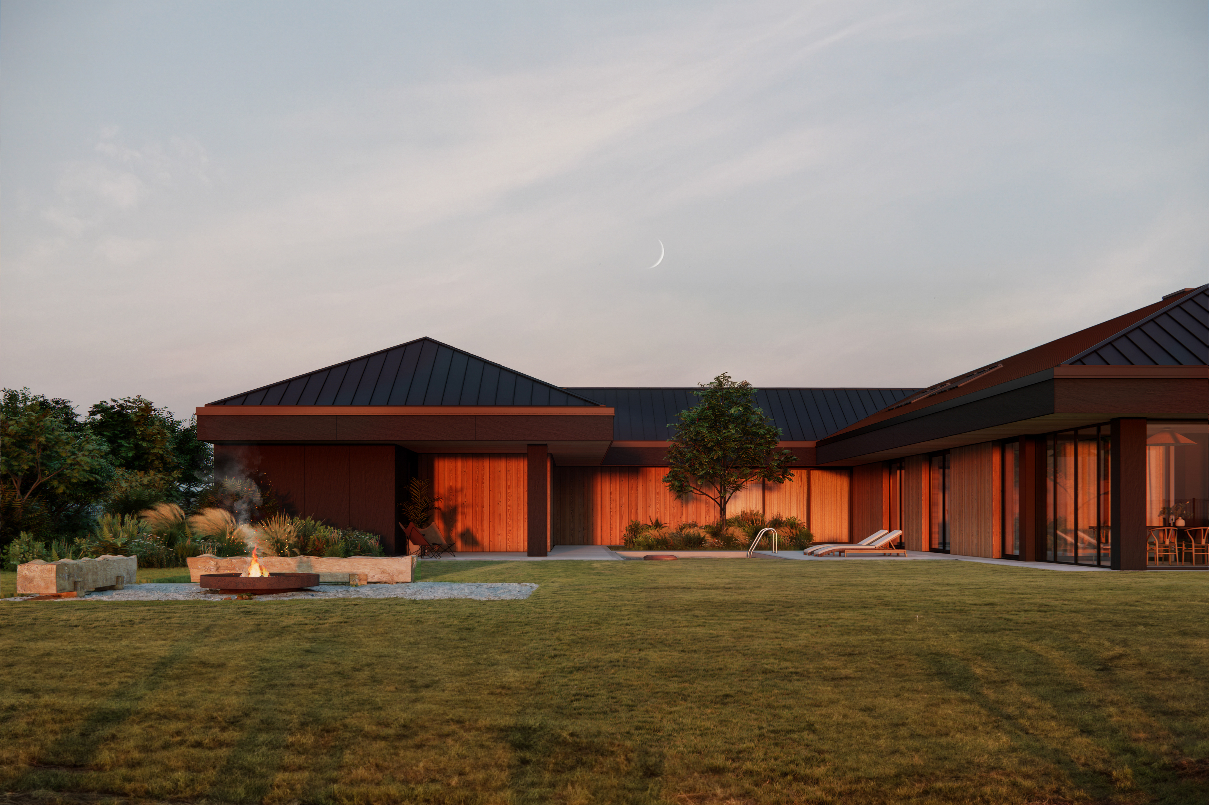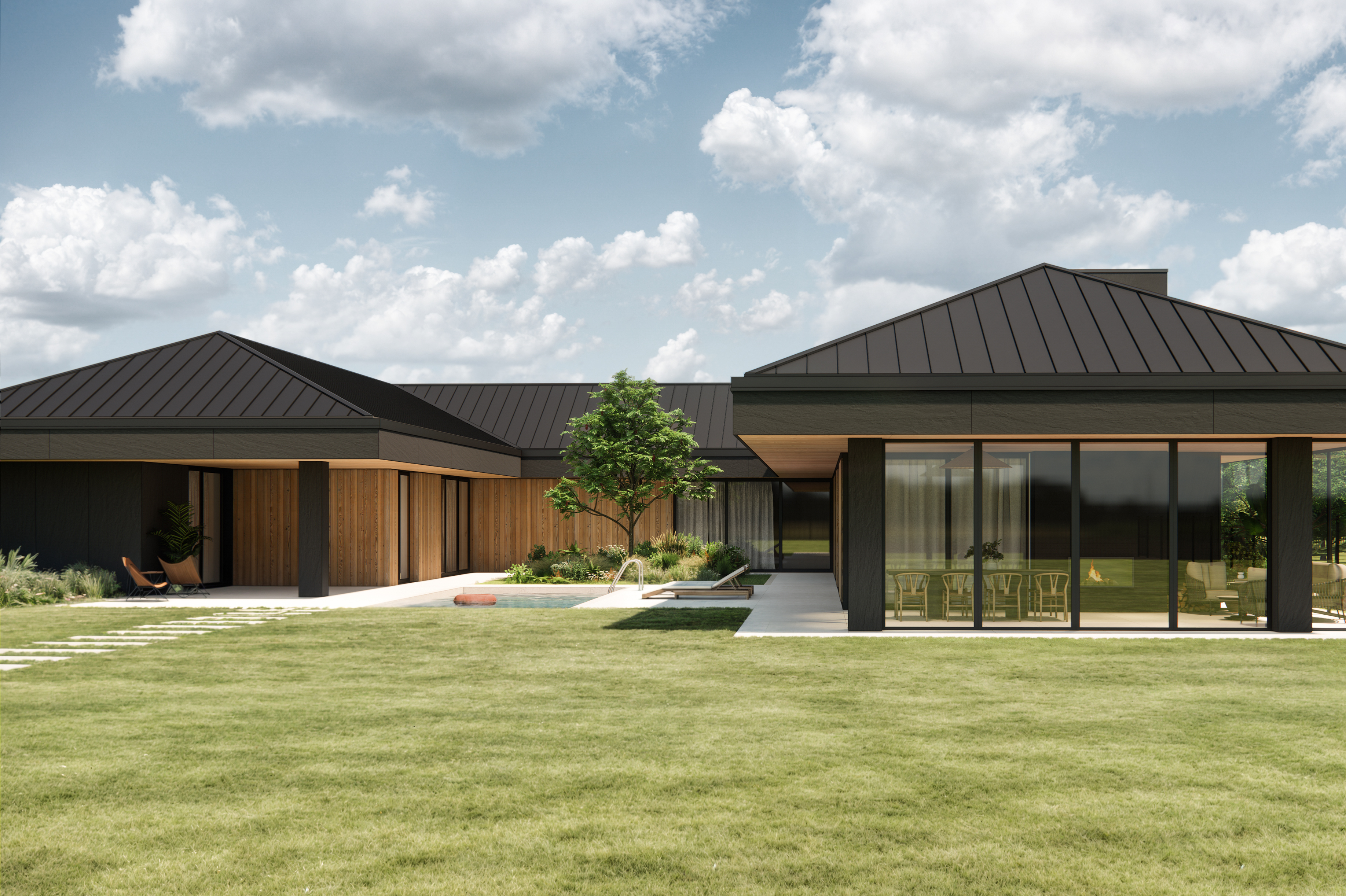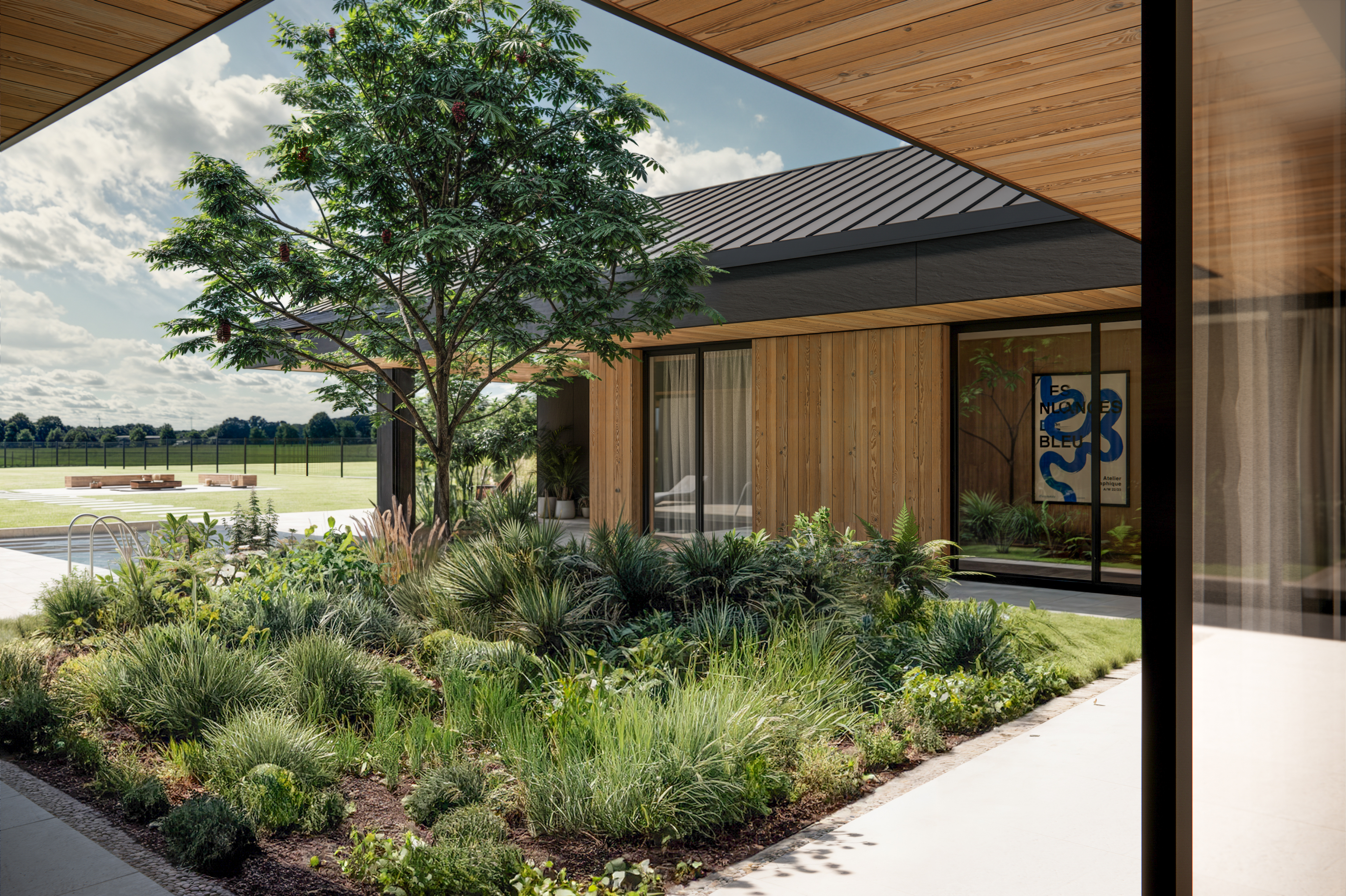 Rozwiązaniem projektowym stała się nietypowa koncepcja domu pół-atrialnego. Nietypowość wynika z obecności dwóch przestrzeni pół-atrialnych o odmiennych charakterach funkcjonalnych. Pierwsze z nich, półpubliczne, znajduje się od frontu i prowadzi użytkowników do wejścia głównego. Stanowi ono przestrzeń buforową, zapewniającą prywatność wnętrz od strony ulicy, a jednocześnie wprowadza zieleń w bezpośrednie sąsiedztwo strefy wejściowej. Drugie, w pełni prywatne, integruje ze sobą wewnętrzną część dzienną, sypialnie oraz zewnętrzną strefę rekreacji z basenem. Dzięki temu strefa ta staje się naturalnym przedłużeniem wnętrza domu, oferując mieszkańcom komfortową przestrzeń wypoczynku z widokiem na zachód. Wyraźnie wydzielone części domu łączy zarówno korytarz przyległy do atrium, jak - w przypadku cieplejszych miesięcy - sama przestrzeń atrium, która może pełnić rolę rozszerzonej komunikacji.