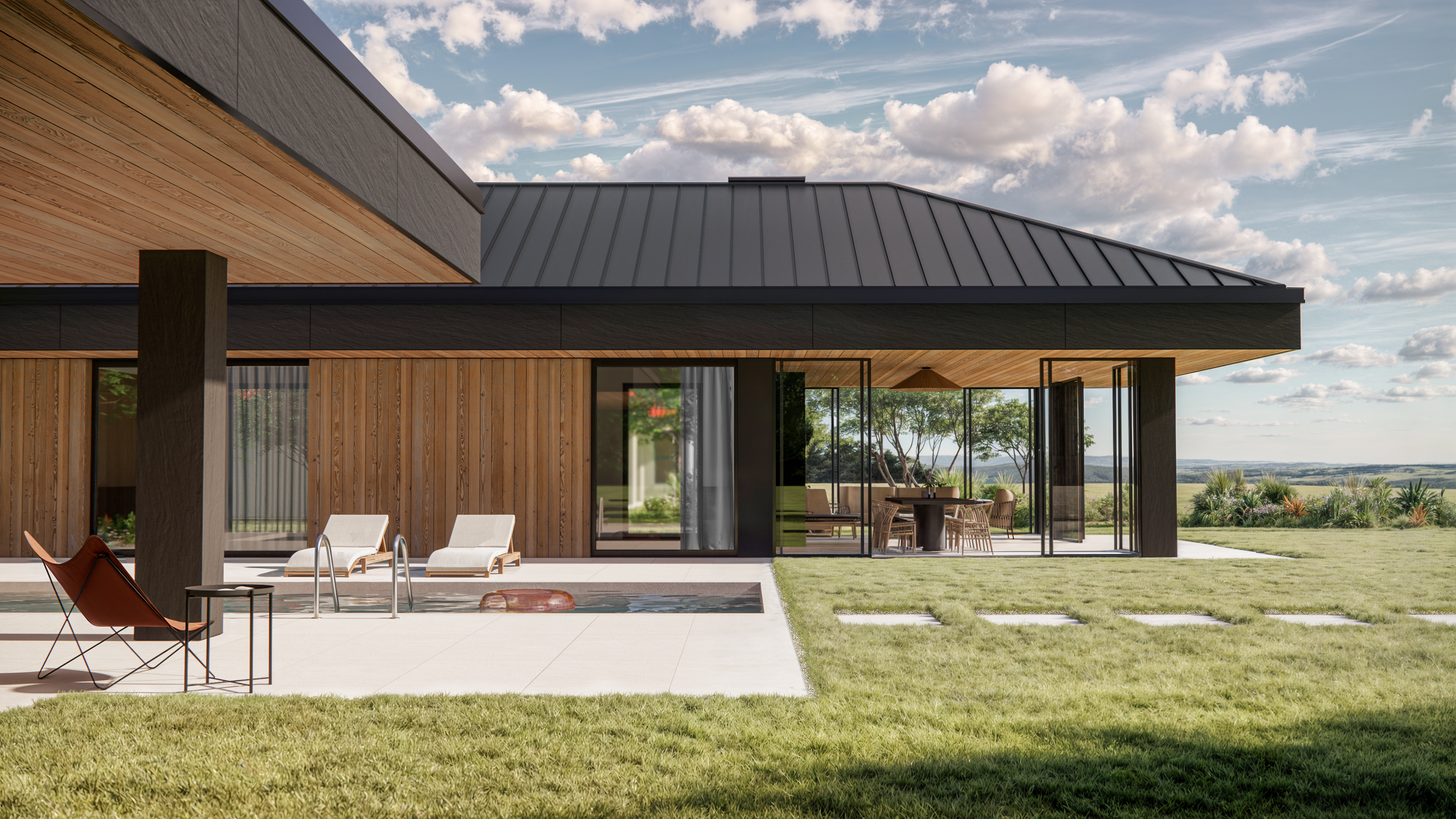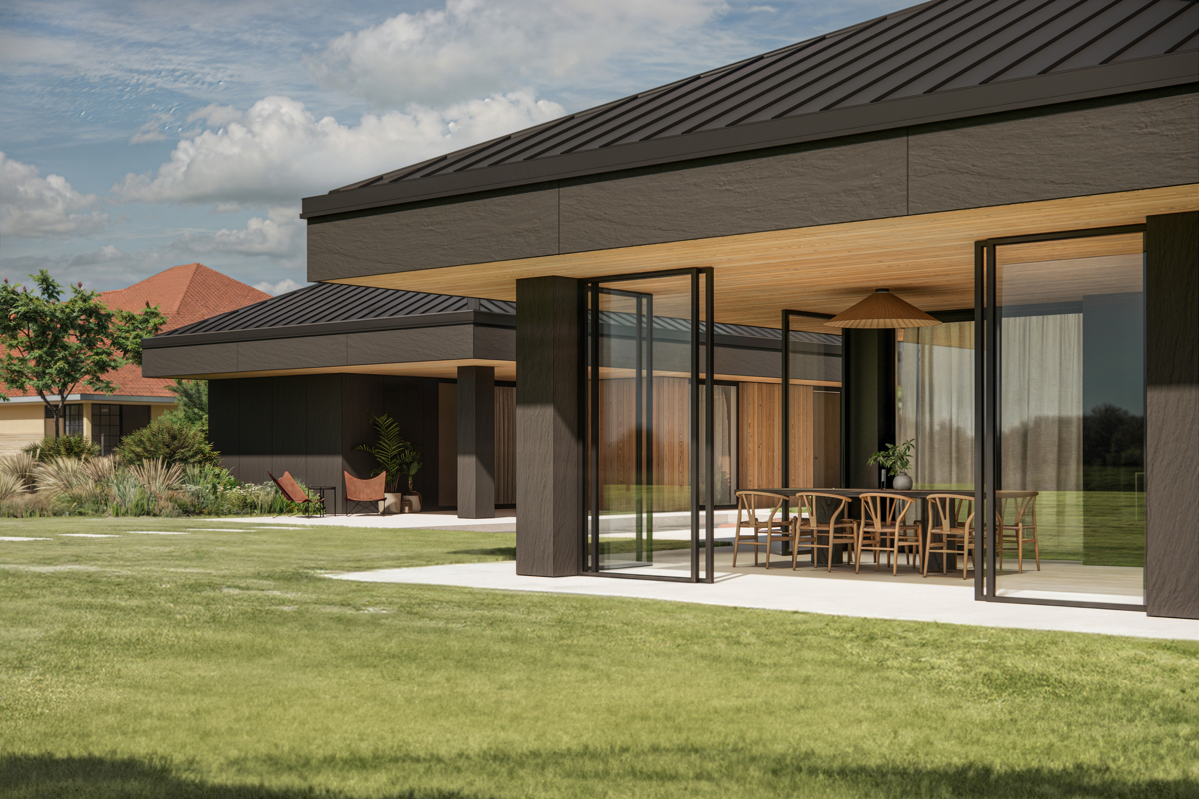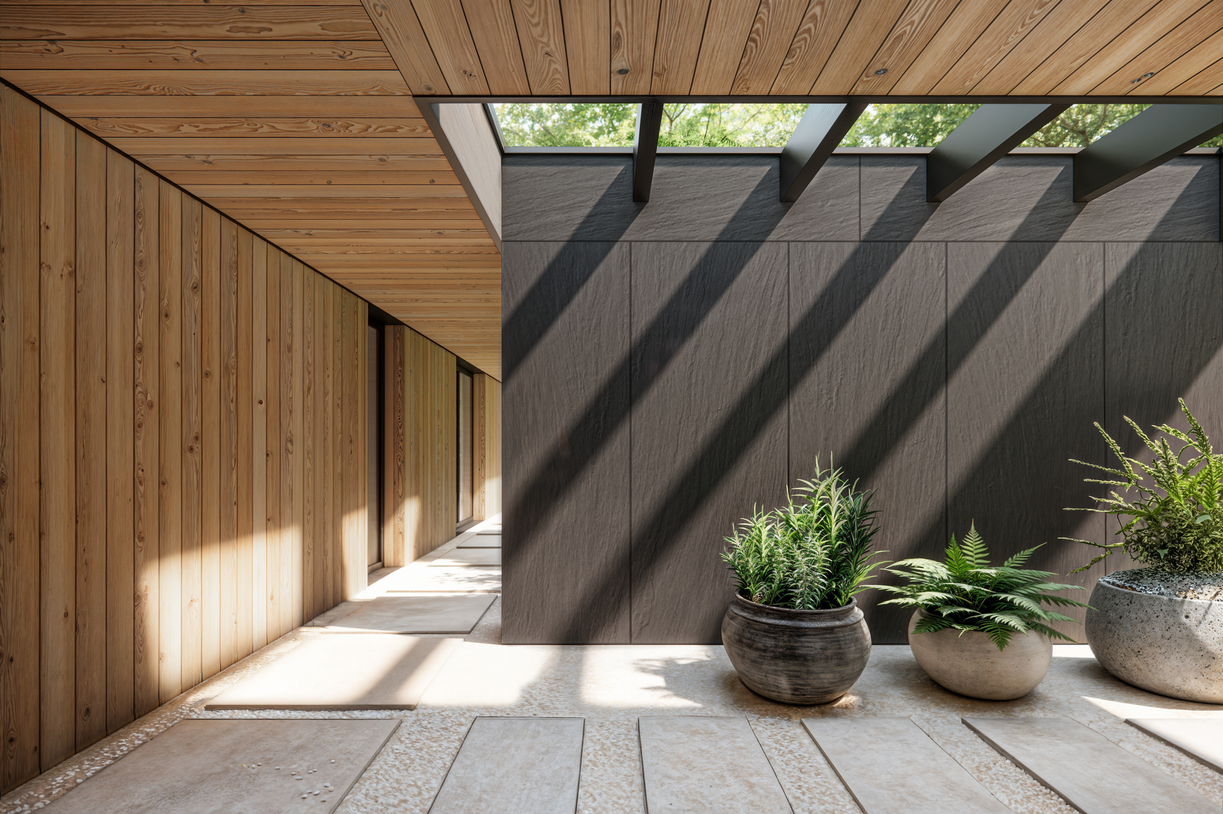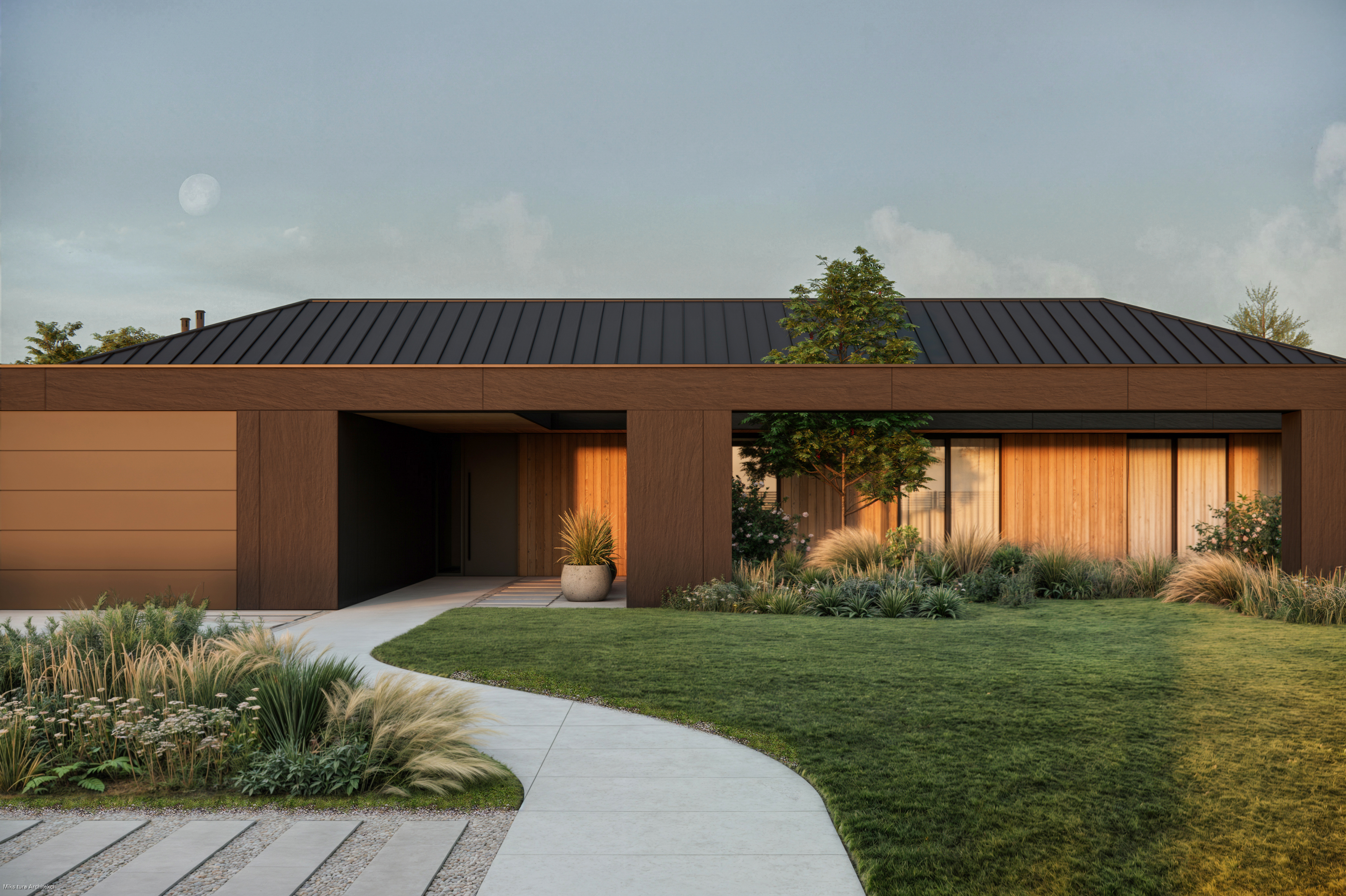 Formę architektoniczną wyróżniają charakterystyczne dachy czterospadowe, subtelnie nawiązujące do zabudowy sąsiednich domów. Materiałowa kompozycja elewacji opiera się na skontrastowaniu surowej, strukturalnej płytki ceramicznej, która dominuje na zewnątrz, z ciepłem drewna zastosowanego w strefach chronionych przed warunkami atmosferycznymi przez głęboki okap.