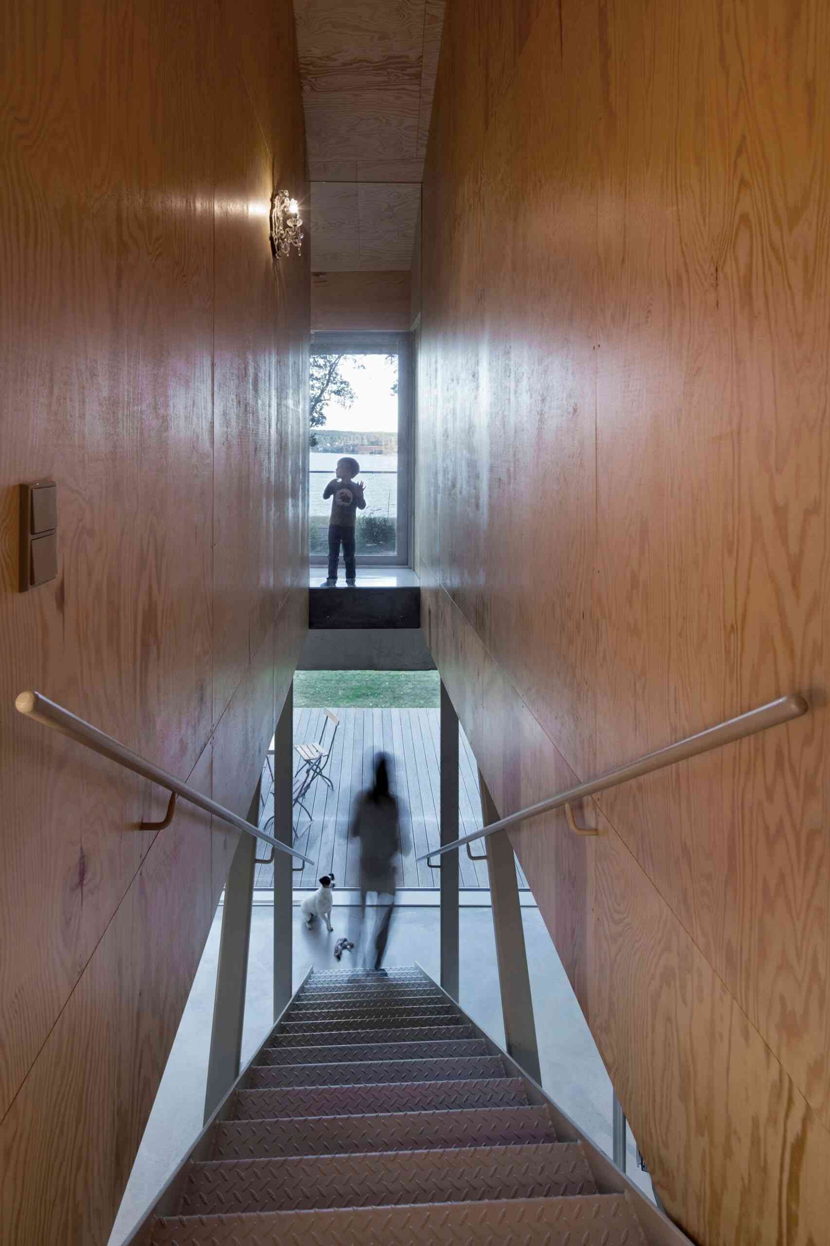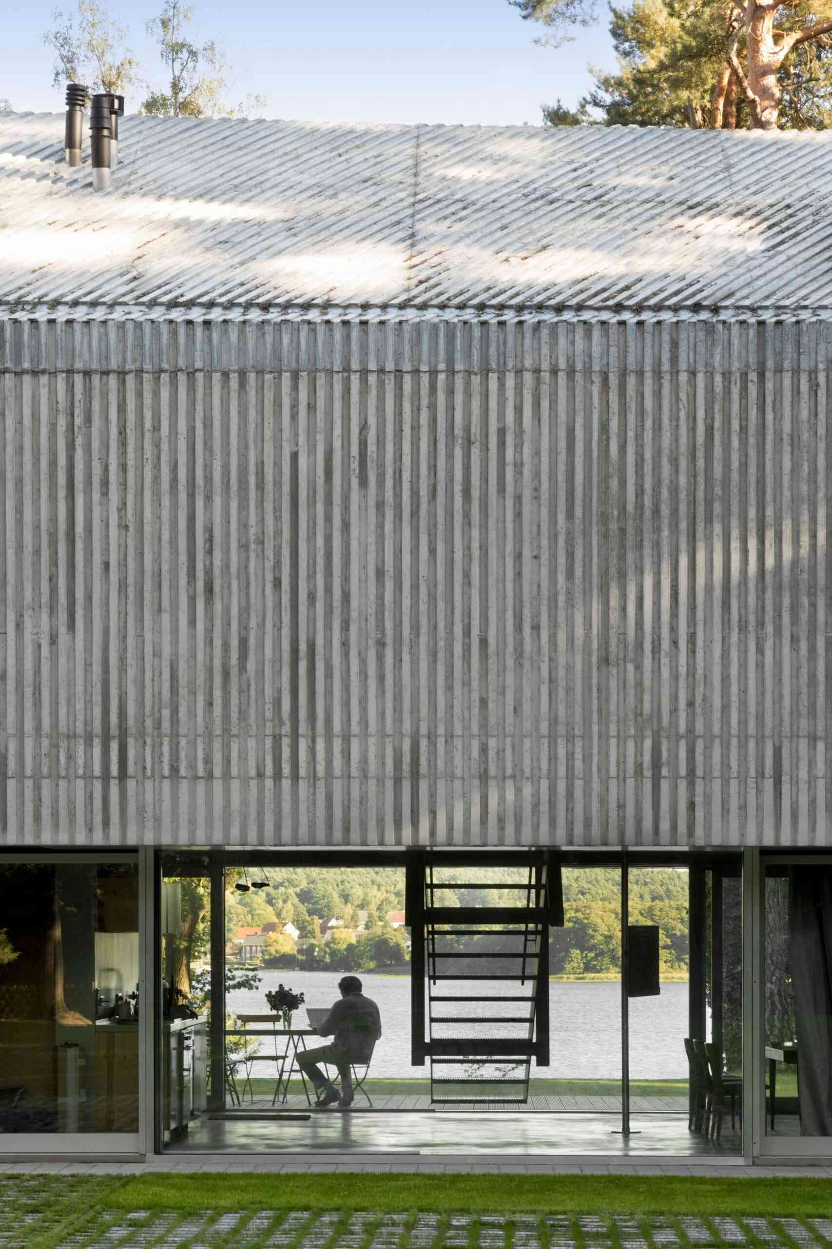Nowoczesna stodoła, łącznie z dachem, wykonana jest jako samonośna konstrukcja z wzmocnionego betonu. Jej zewnętrzną powierzchnię wyprofilowano pasami po szalunku, które nadają bryle charakteru i rytmu. Okna są integralnym elementem konstrukcji, ulokowane w taki sposób, aby wnętrza naturalnie łączyły się z otaczającym krajobrazem. Niewielki kąt na prostokątnym planie sprawia, że dom nie jest klasyczną dwuspadową stodołą, a bryła staje się bardziej dynamiczna i przestrzenna, szczególnie na górnym piętrze, gdzie ściany i sufity pokryto sklejką, tworząc przytulną, domową atmosferę.