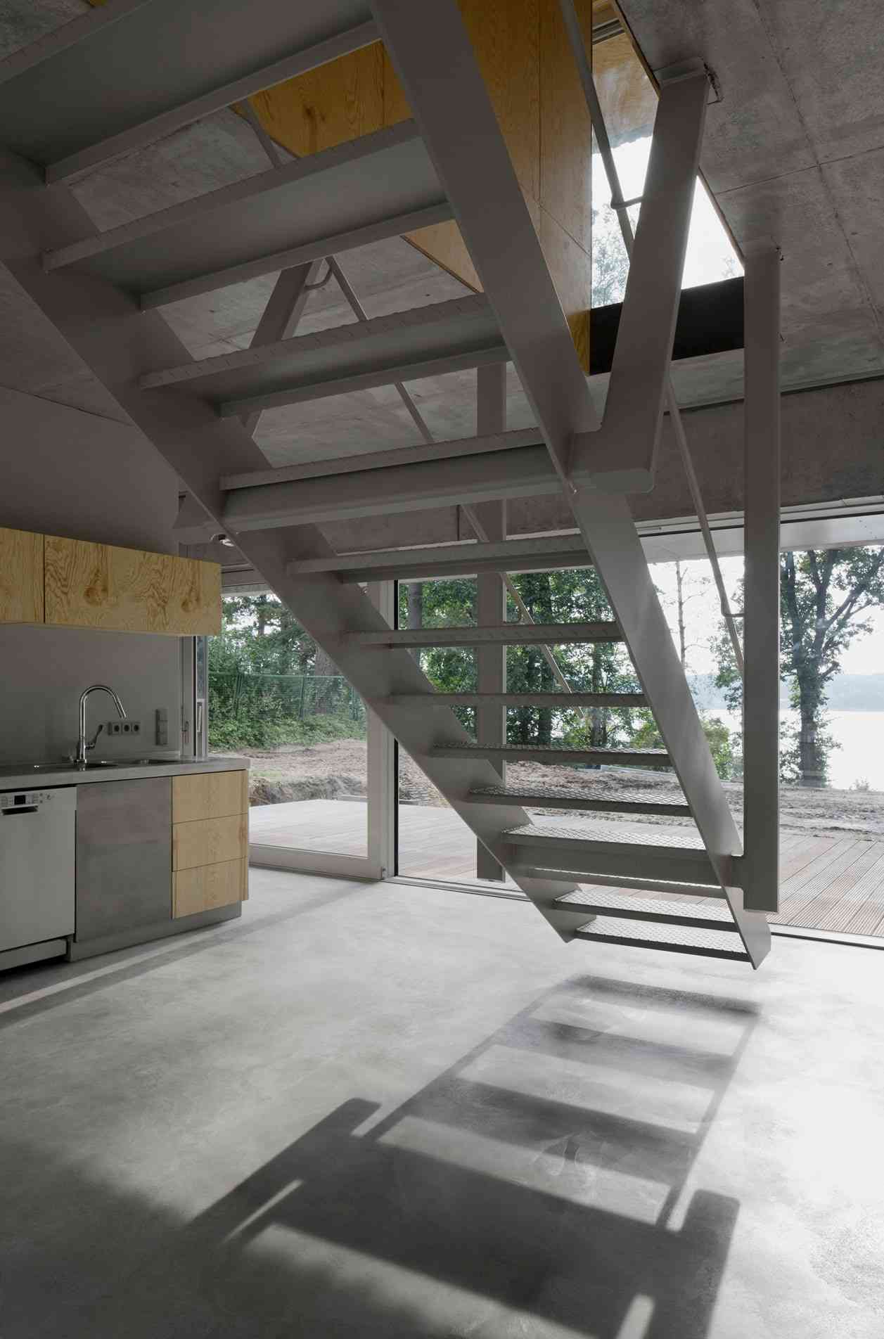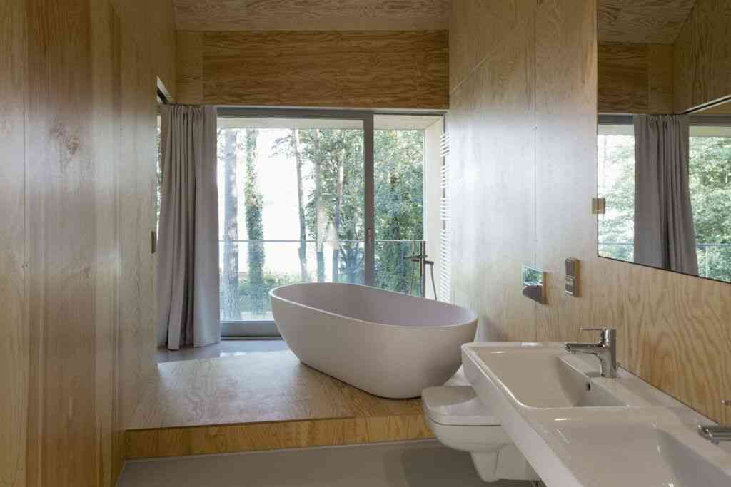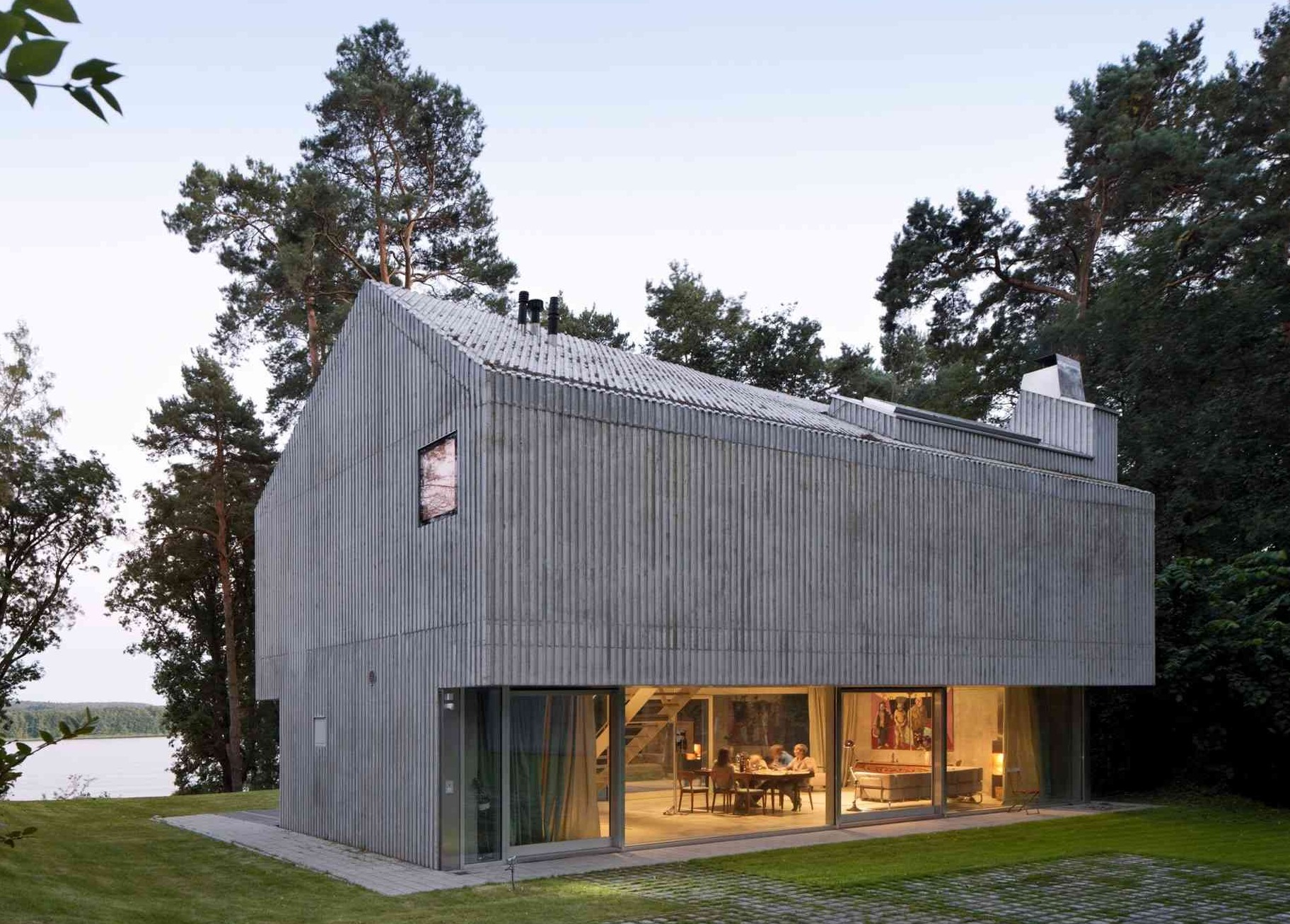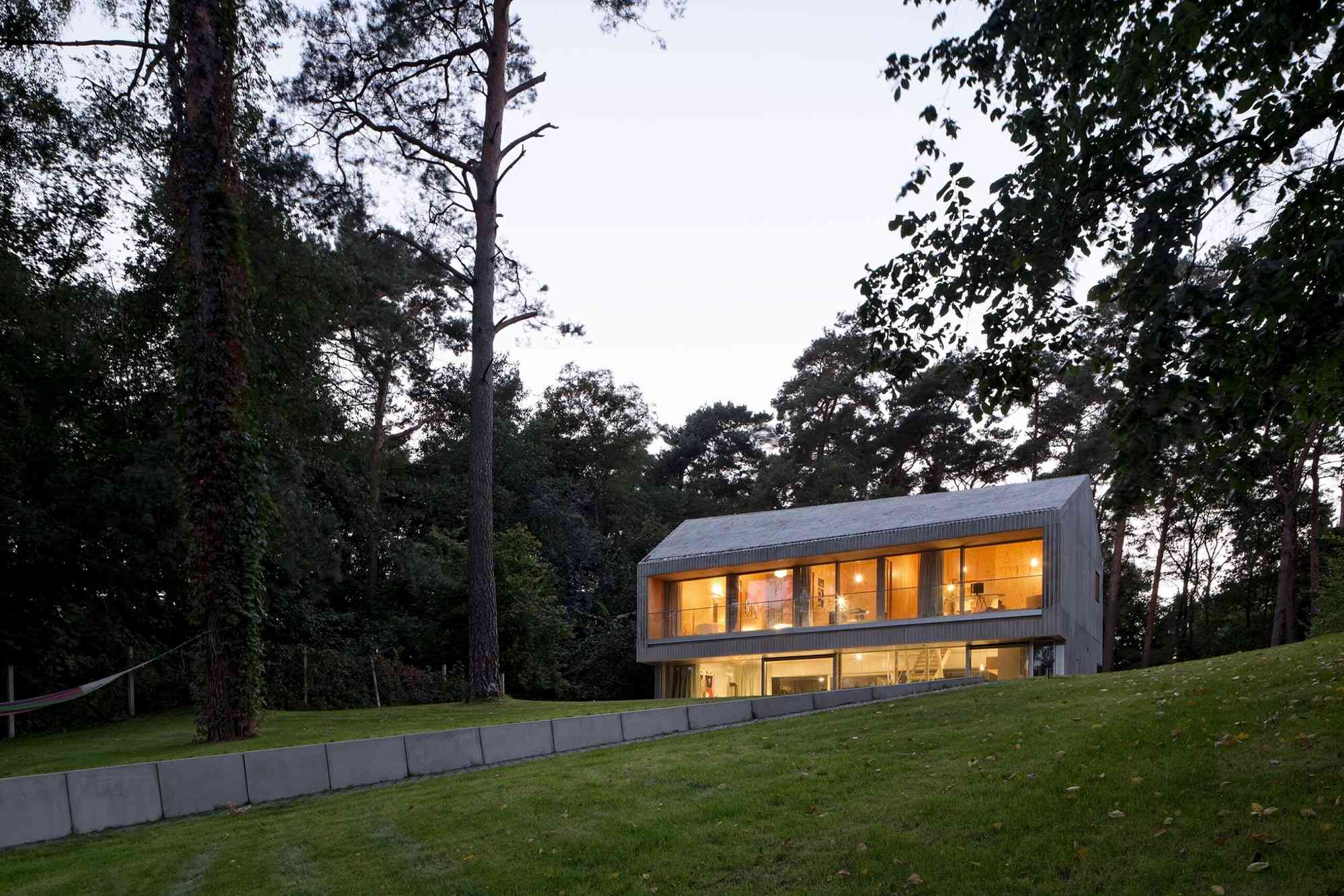 70 kilometrów od Berlina, na malowniczej działce tuż nad jeziorem Scharmützelsee, stoi weekendowy dom zaprojektowany tak, by można w nim było mieszkać znacznie dłużej. Nieruchomość należy do okręgu miasta Bad Saarow i jest ostatnią działką budowlaną w lokalnym planie zagospodarowania przestrzennego. Dom posadowiono na najwyższym punkcie działki, 9 metrów nad poziomem wody, co zapewnia zapierające dech w piersiach widoki na jezioro i jego okolicę. Od tyłu graniczy ze skrajem lasu, a jedynym sąsiadem jest pobliska posesja, co gwarantuje prywatność i poczucie spokoju.
