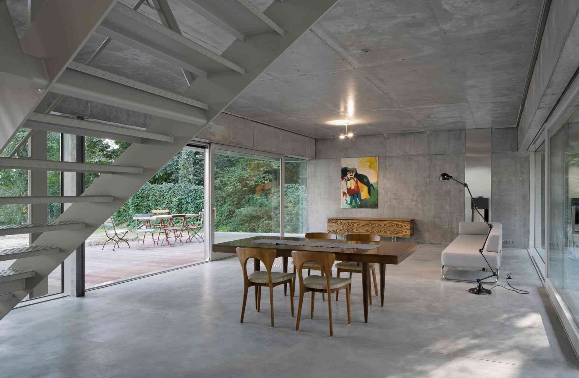 Parter domu pozbawiony jest ścian nośnych, dzięki czemu powstała otwarta przestrzeń z przeszkleniami po obu stronach, łącząca wnętrze z naturalnym otoczeniem. Dominują tu odsłonięte betonowe powierzchnie, które nadają wnętrzu surowego charakteru, a jednocześnie pozwalają na elastyczne aranżacje w zależności od sezonu i potrzeb mieszkańców. Nowoczesna stodoła harmonijnie łączy minimalistyczną architekturę z bliskością natury, zapewniając zarówno funkcjonalność, jak i wyjątkowe doznania wizualne.