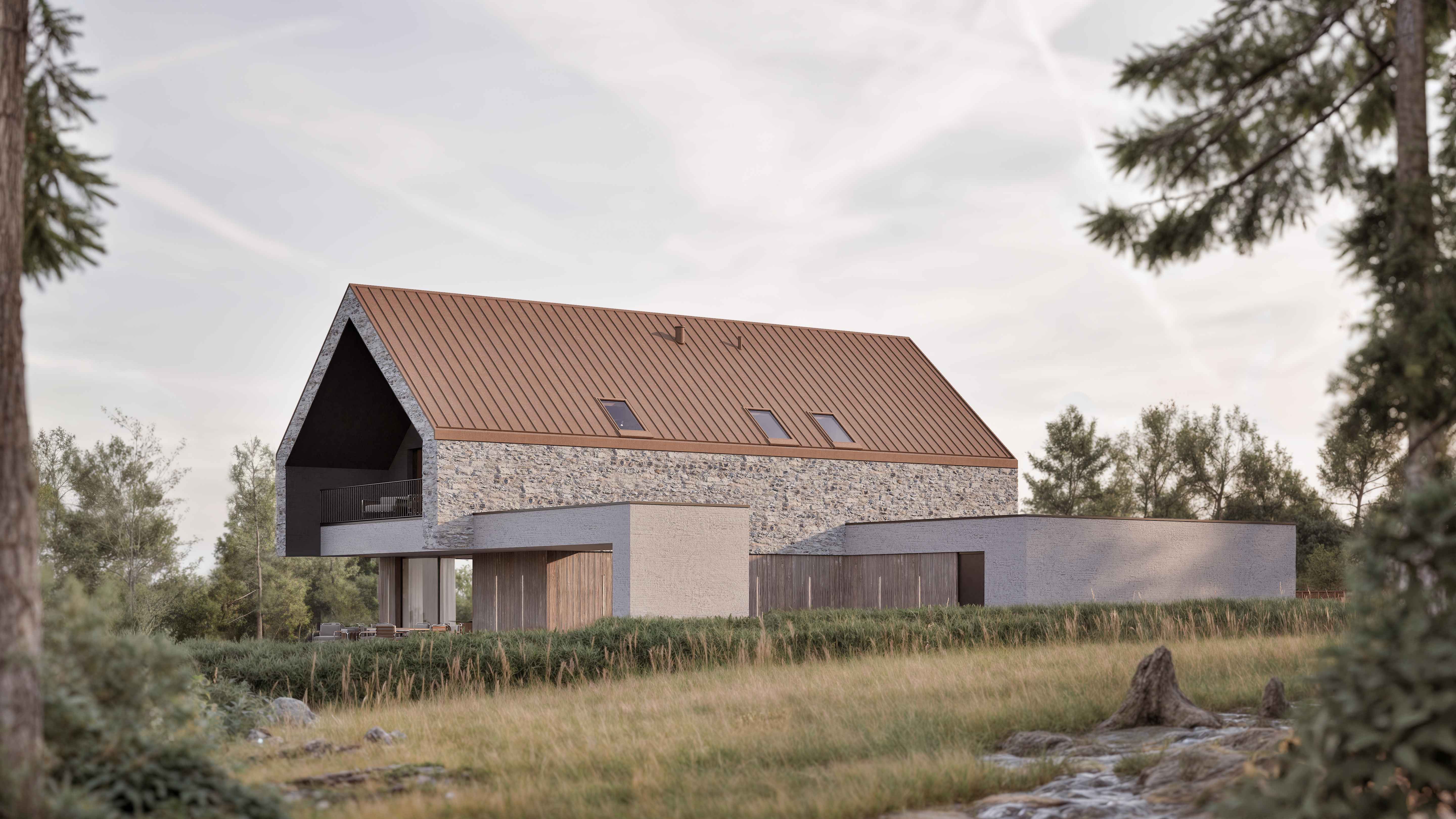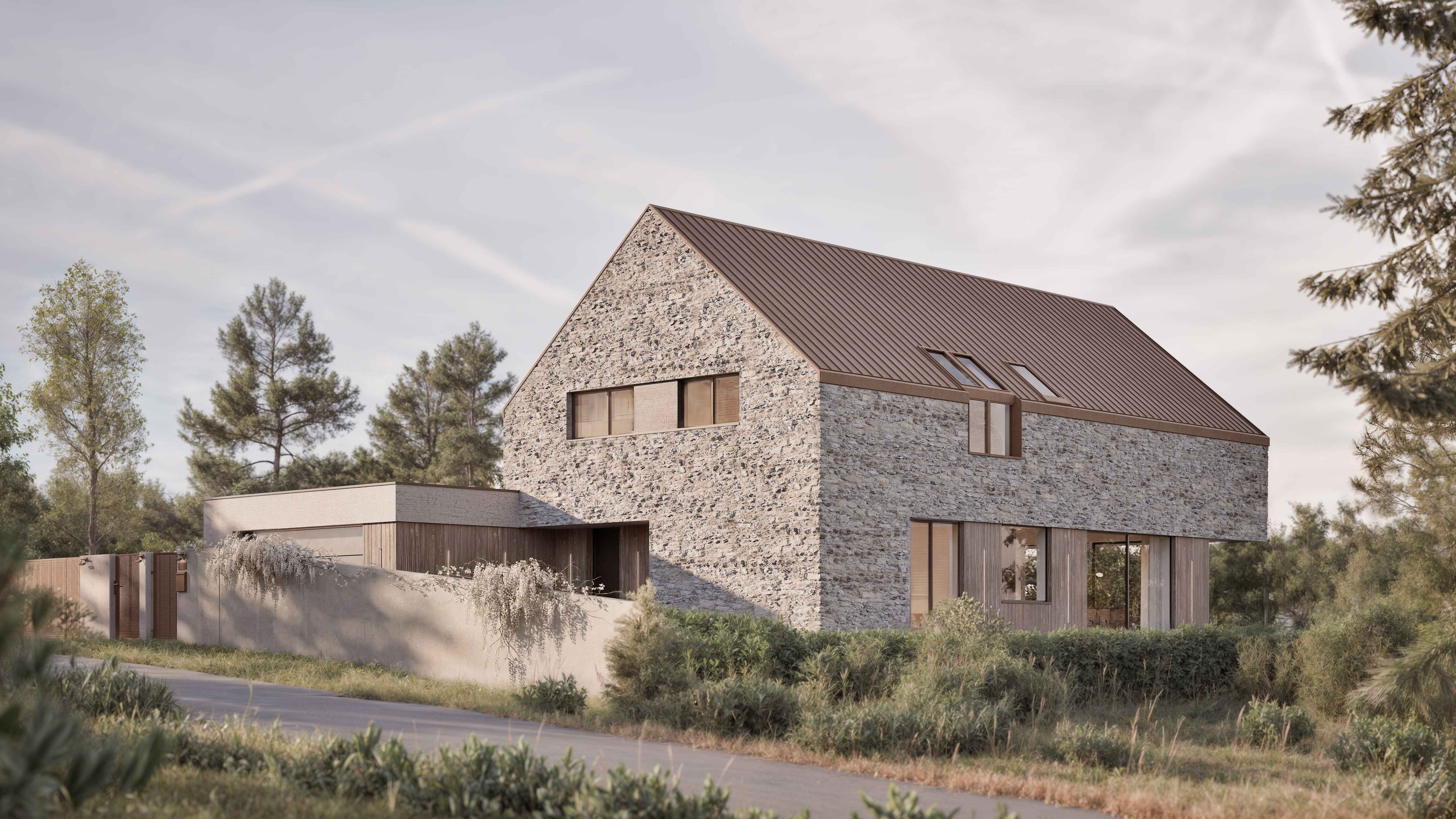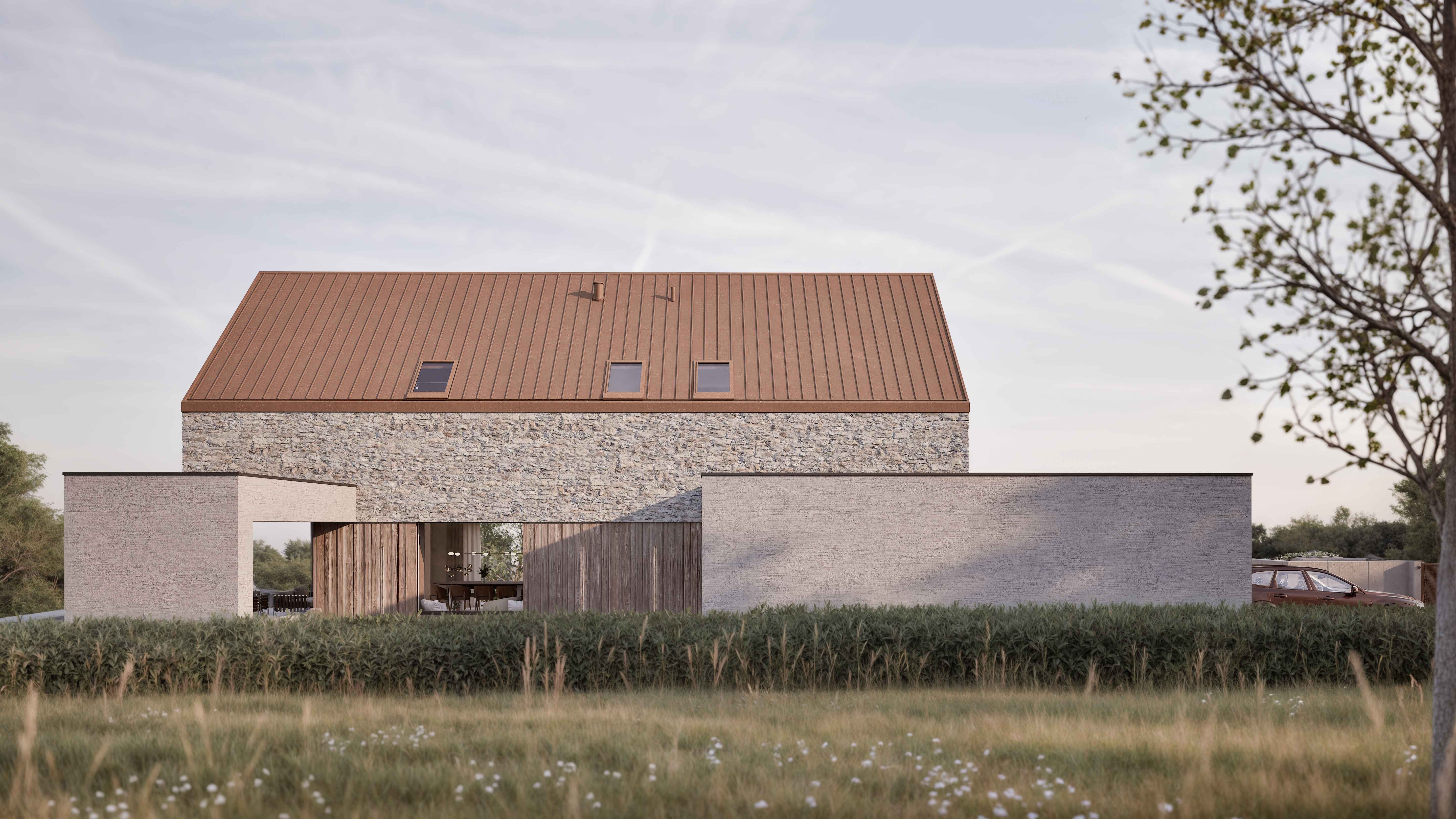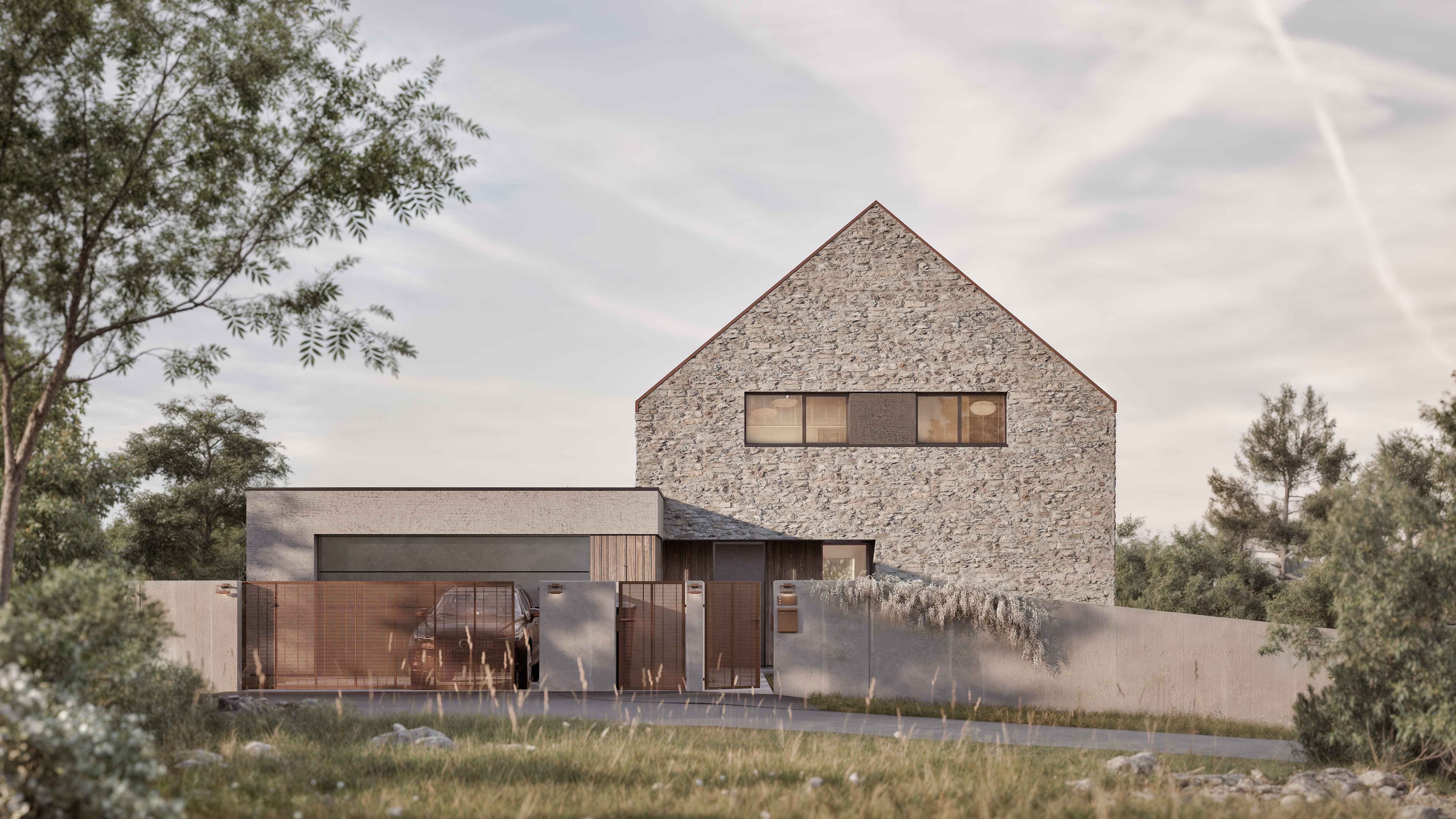 Projekt domu zlokalizowanego w podkrakowskiej miejscowości Zelków. Działka usytuowana na lekkim stoku, widokowo otwierająca się na pobliskie dolinki. To właśnie okolica jury krakowsko-częstochowskiej stanowiła pretekst to zastosowania na elewacji kamienia wapiennego, spajającego ten dom z tak wyrazistym kontekstem. Ciepłe, rude odcienie pozostałych elementów wykończenia i detali mają dodatkowo nadawać całości naturalnego charakteru przy okazji przywodząc na myśl skojarzenia z krajami południa.