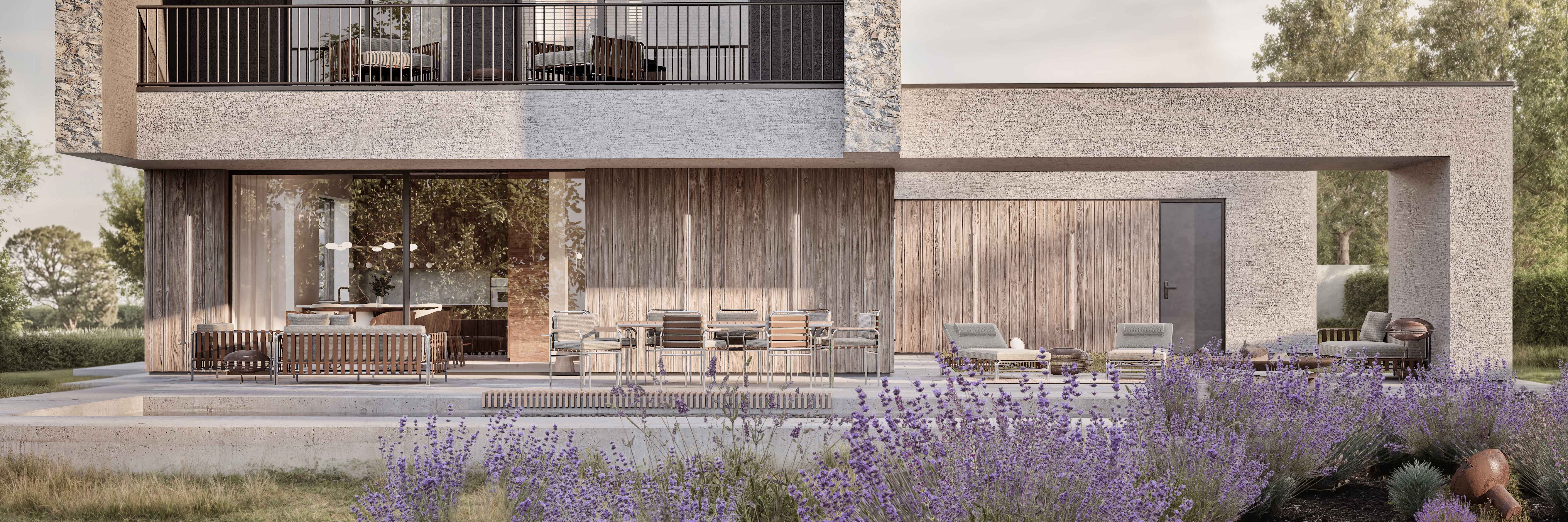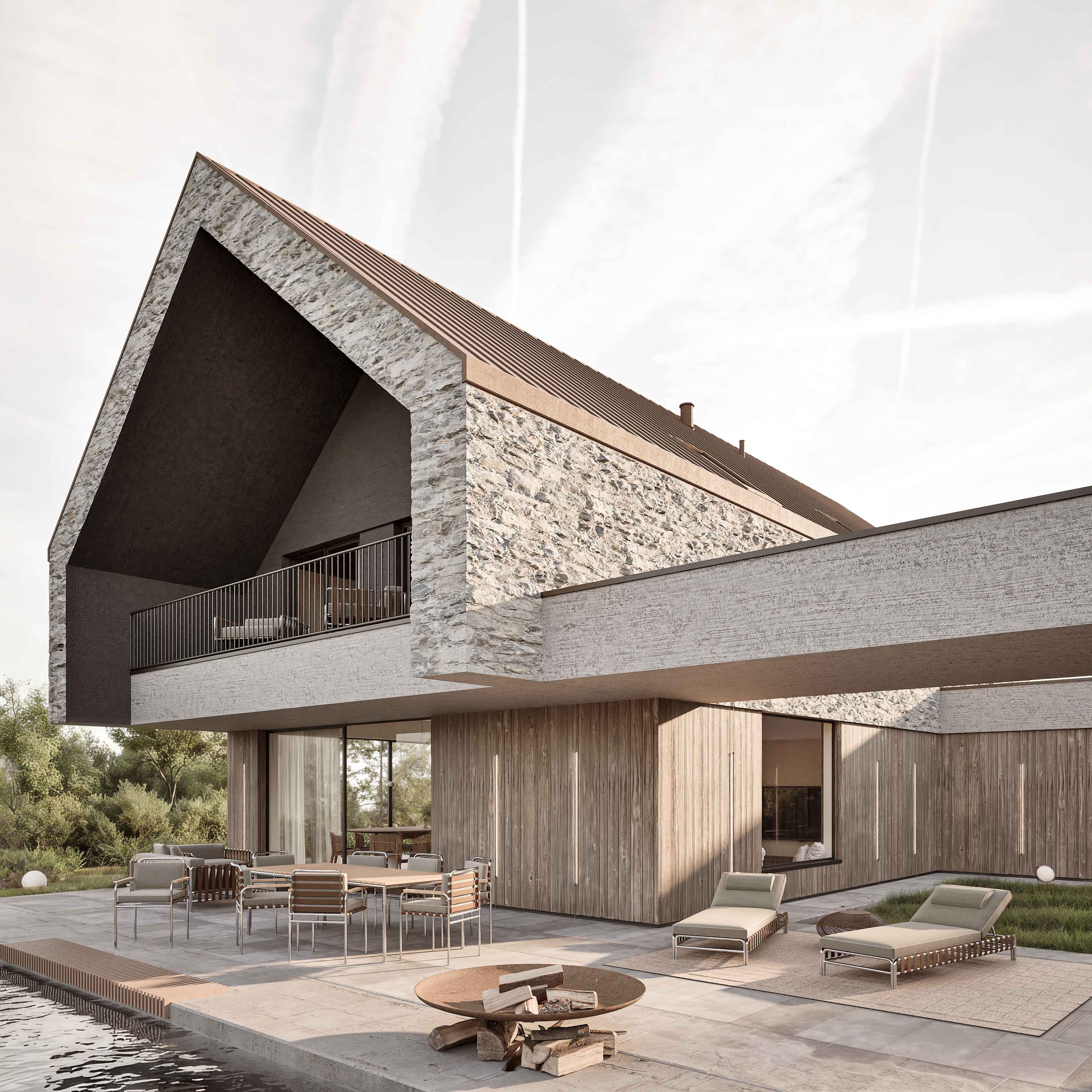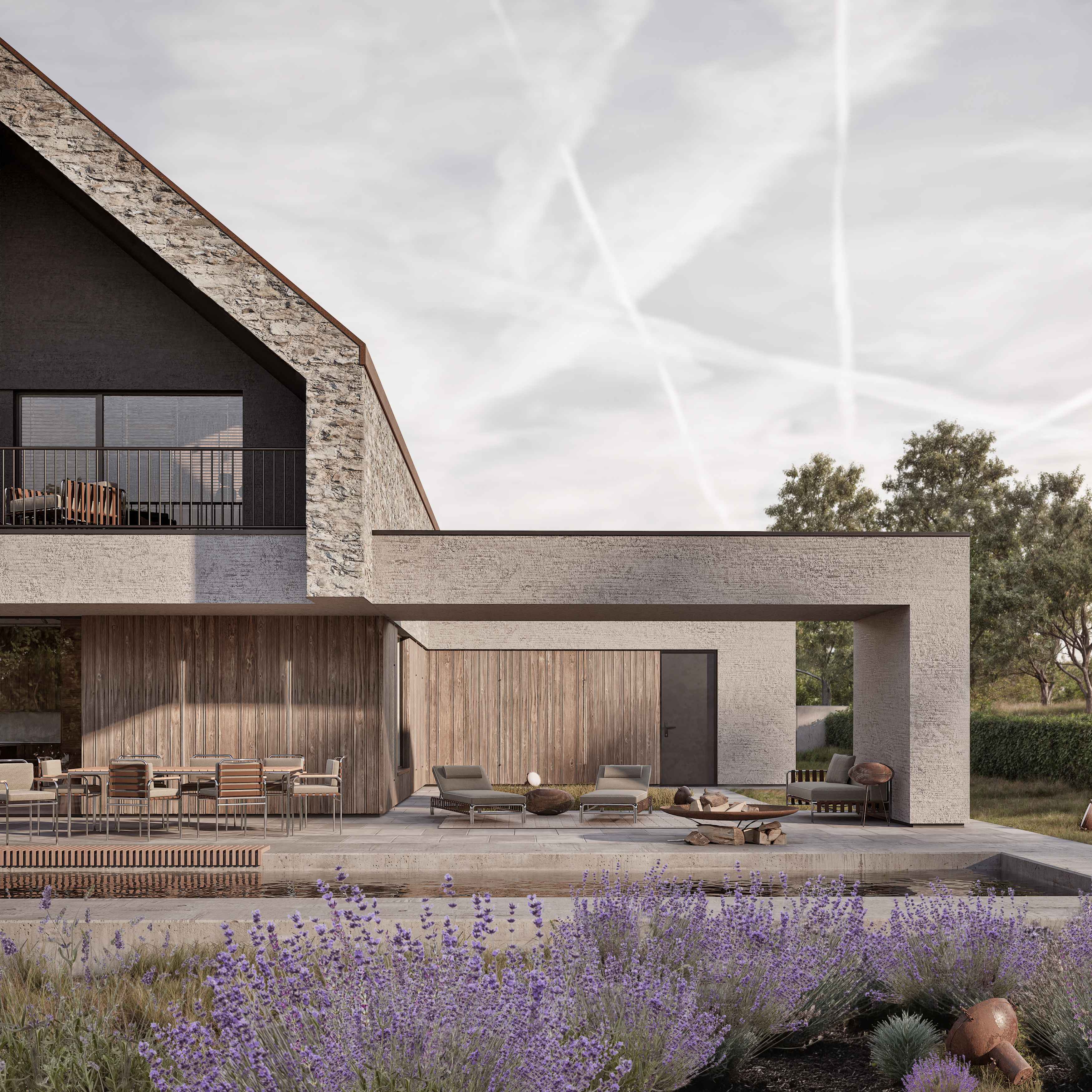 Charakterystycznym elementem jest wyraziste „skrzydło” osłaniające zewnętrzną strefę wypoczynkową, tworząc idealne miejsce do codziennego relaksu na świeżym powietrzy podczas jogi, fitnessu czy wypoczynku w basenie. Jego forma, mimo że odrębna, stanowi równocześnie kontynuację zasadniczych części reszty budynku.