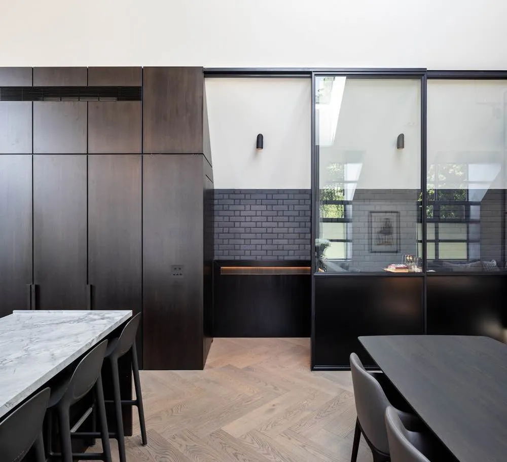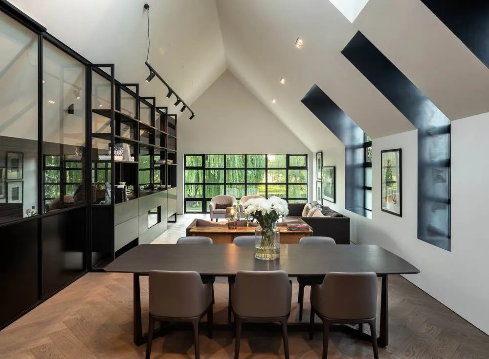 Projekt operuje wyraźną dwoistością materiałową. Industrialne wykończenia – stal, cegła i ciężkie okładziny – zestawiono z bardziej miękkimi, mieszkalnymi elementami wnętrz. To napięcie pomiędzy surowością a komfortem nadaje przestrzeniom głębi i równowagi, łagodząc ciężar bryły.