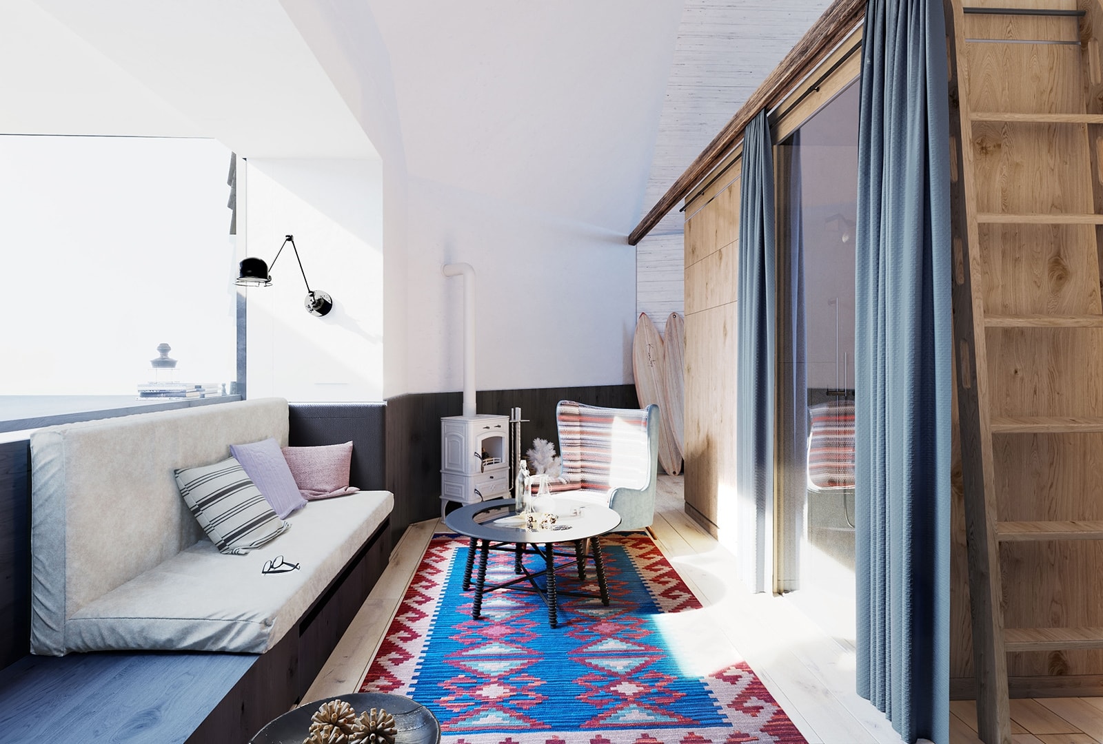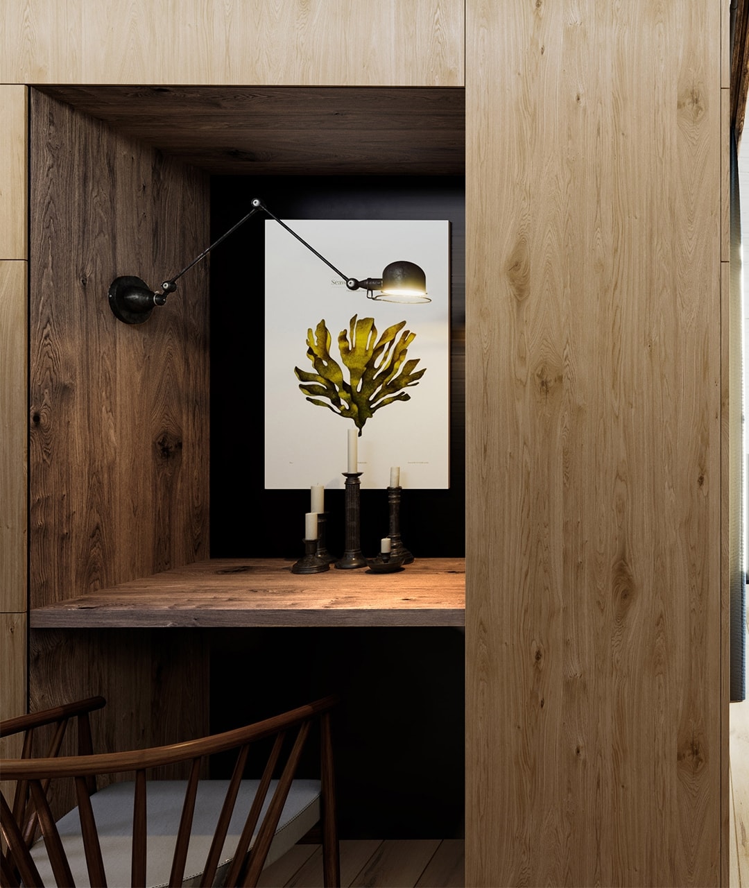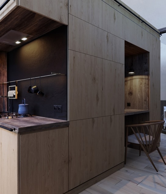 Mimo kompaktowych rozmiarów – 54 m² powierzchni użytkowej – układ wnętrza jest przemyślany i elastyczny. Centralnym punktem jest prostopadłościenny „rdzeń”, w którym umieszczono kuchnię, łazienkę, miejsce do pracy i strefy przechowywania. Nad nim, na antresoli, zaprojektowano przestrzeń sypialnianą. Dzięki temu każdy metr kwadratowy pełni określoną funkcję, a całość pozostaje wygodna i otwarta.