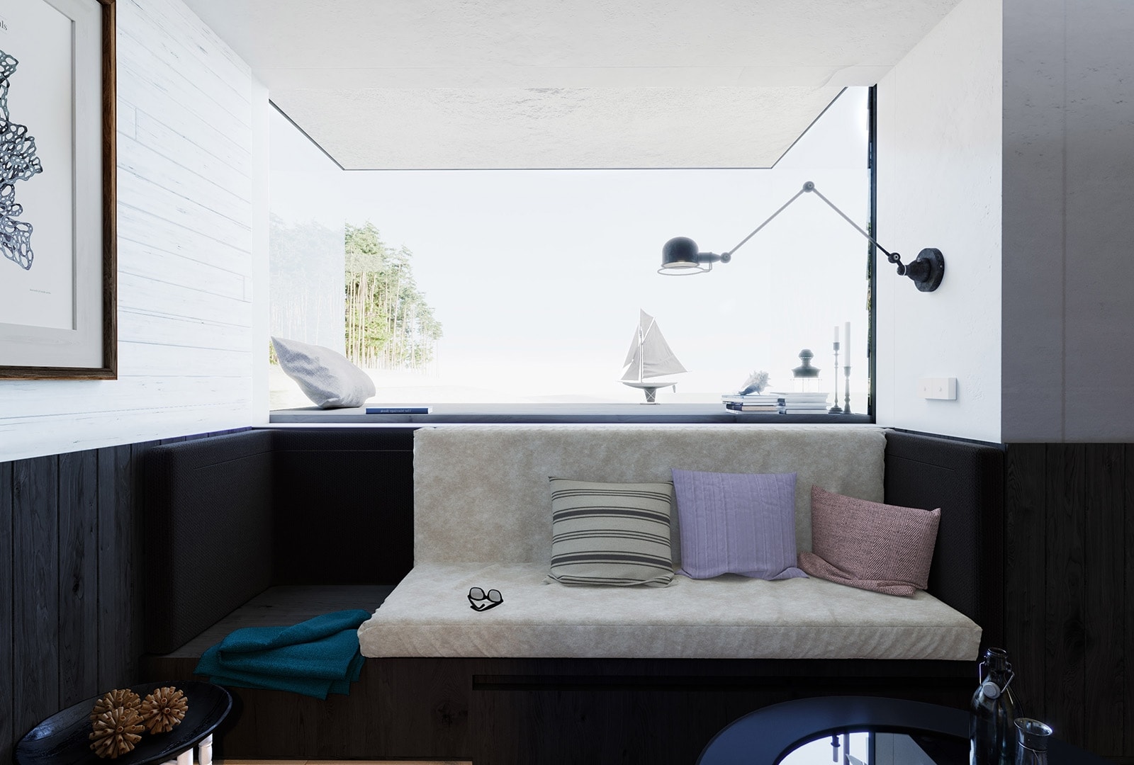 Wnętrza utrzymano w duchu prostoty i elegancji. Dominują naturalne materiały – drewno, szkło, surowe faktury – które budują autentyczny, nadmorski klimat. Dom nie potrzebuje zbędnych dekoracji, bo jego największą ozdobą jest panorama morza rozpościerająca się w każdym oknie.