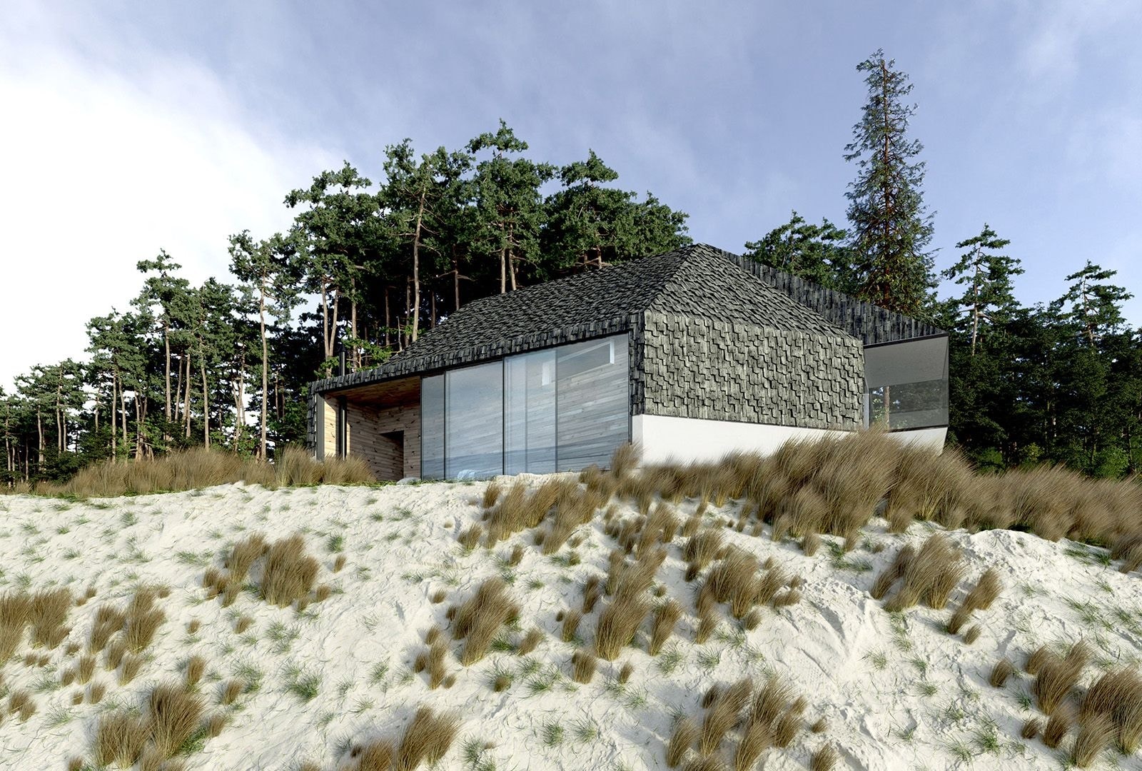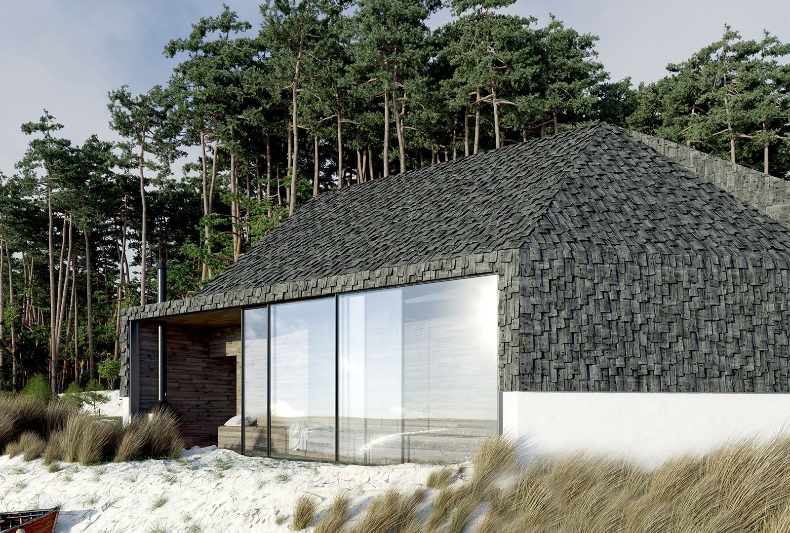 Projektanci postawili na minimalistyczną bryłę, której forma nie dominuje nad otoczeniem, lecz staje się jego integralną częścią. Czysta geometria, naturalne materiały i duże przeszklenia sprawiają, że dom otwiera się na pejzaż, a morze niemal zagląda do wnętrza. Zamiast rywalizować z naturą, budynek podkreśla jej obecność – tworząc przestrzeń zanurzoną w świetle, wietrze i falach Bałtyku.