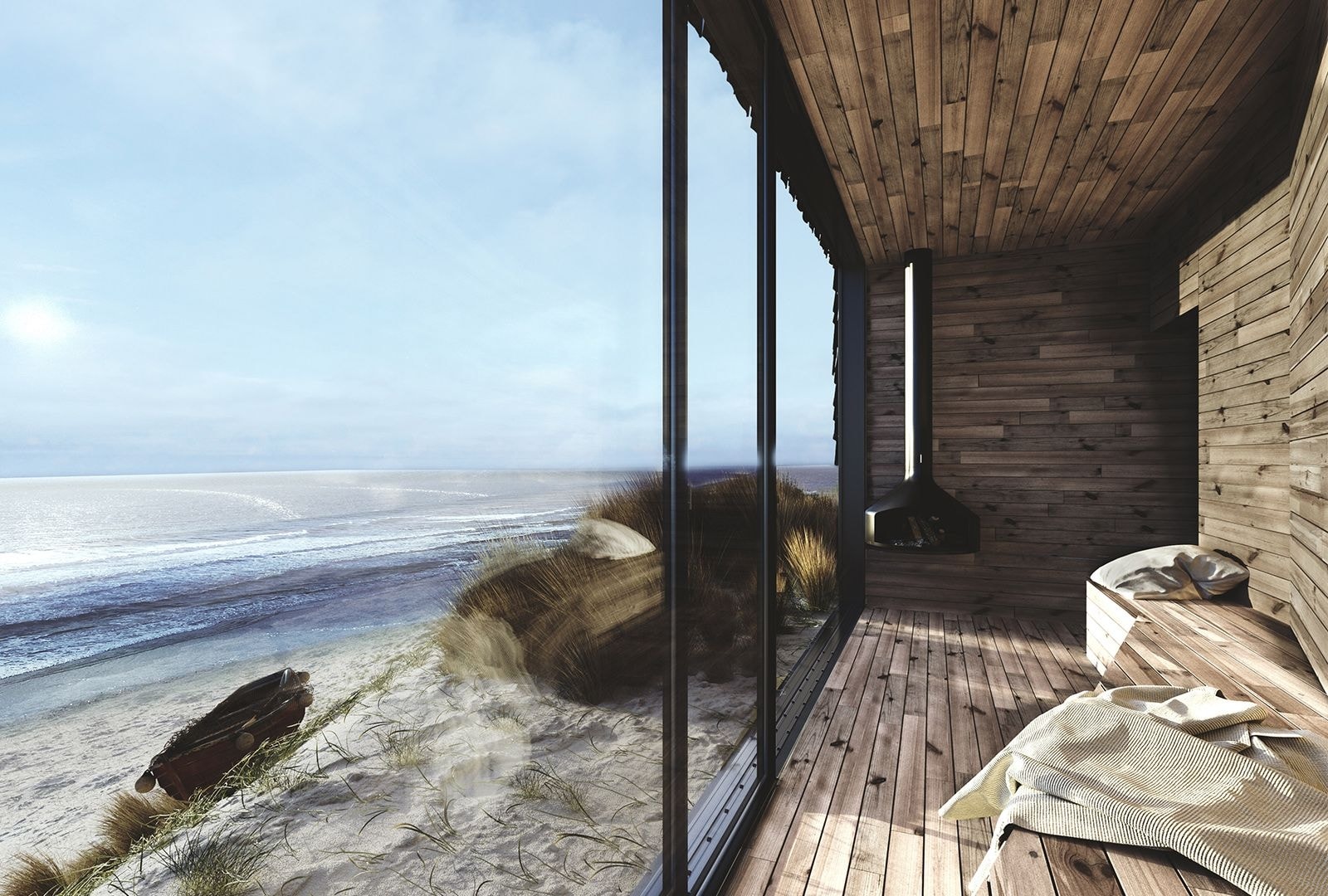 Dom oferuje również strefę dzienną z jadalnią i częścią wypoczynkową, a także przeszklony wykusz wychodzący na morze. Taras zewnętrzny – zintegrowany z kominkiem i drewnianą ławą – pozwala na spędzanie czasu blisko plaży, w naturalnym krajobrazie.