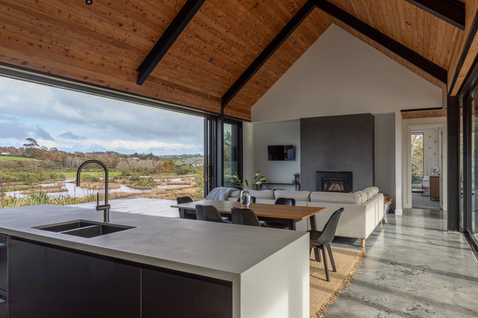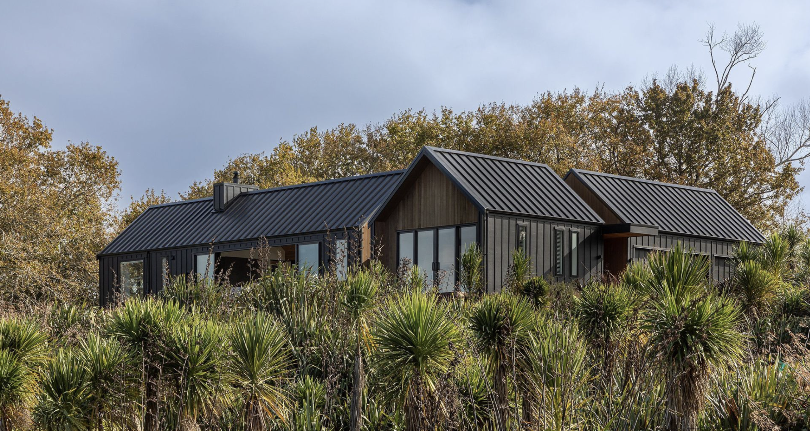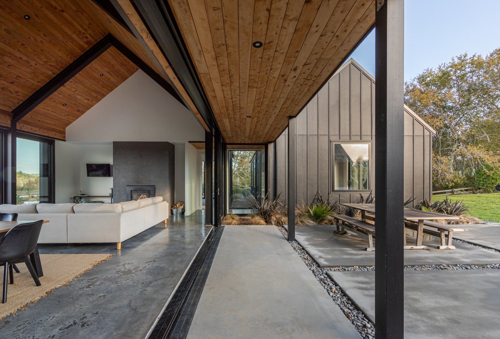 Bryła domu składa się z prostych form z dwuspadowymi dachami, połączonych niższym zadaszeniem. Taka kompozycja pozwoliła stworzyć zarówno przestrzenie otwarte na krajobraz, jak i bardziej kameralne zakątki sprzyjające codziennemu życiu rodziny. Elewacje otwarto dużymi przeszkleniami, które nie tylko zapewniają dopływ światła dziennego i naturalną wentylację, lecz także kadrują malownicze widoki na ogrody i mokradła.
