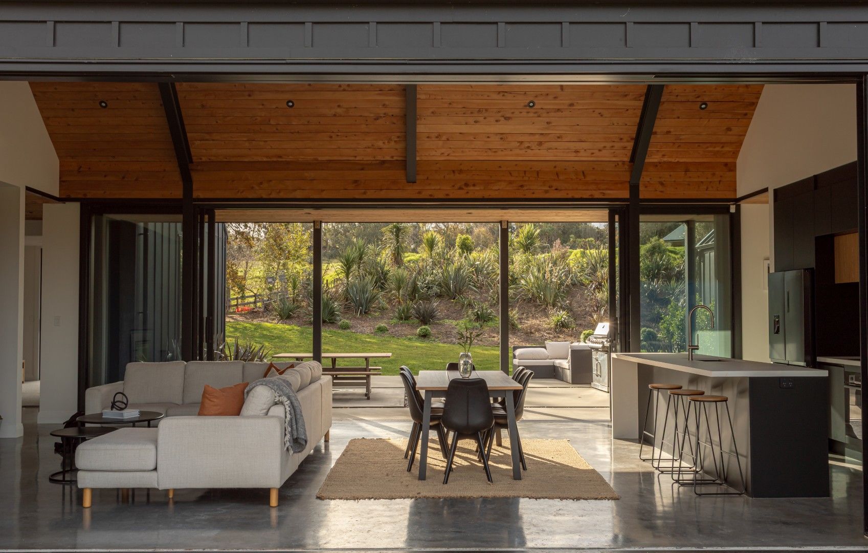 Wnętrze domu utrzymane zostało w minimalistycznym stylu. Architekci postawili na prostotę i funkcjonalność, tworząc przestrzeń, która wspiera praktyczny rytm życia rodzinnego. Jasne, otwarte pomieszczenia ułatwiają codzienną organizację, a jednocześnie pozwalają mieszkańcom w pełni korzystać z otaczającej przyrody, widocznej przez panoramiczne przeszklenia.
