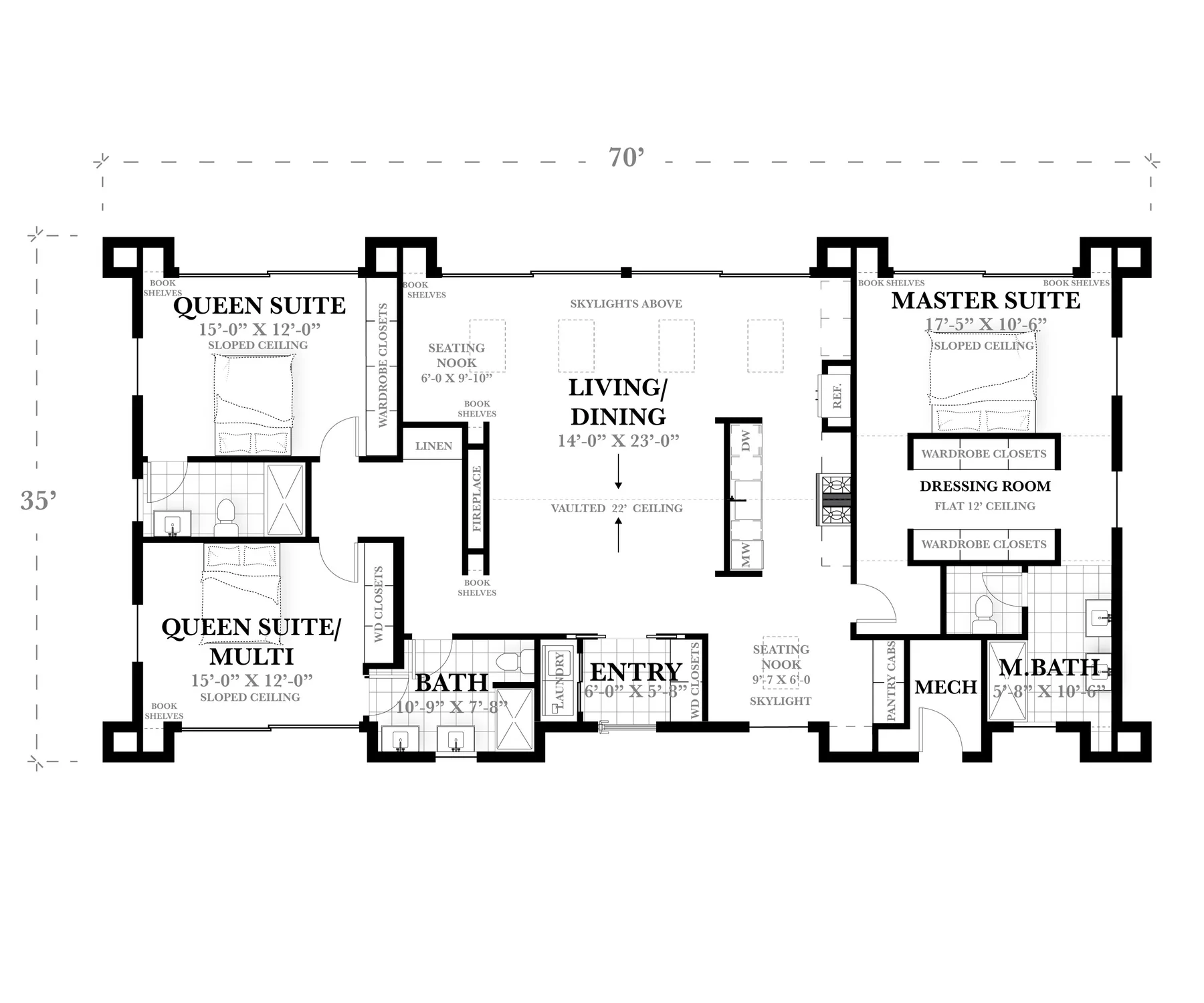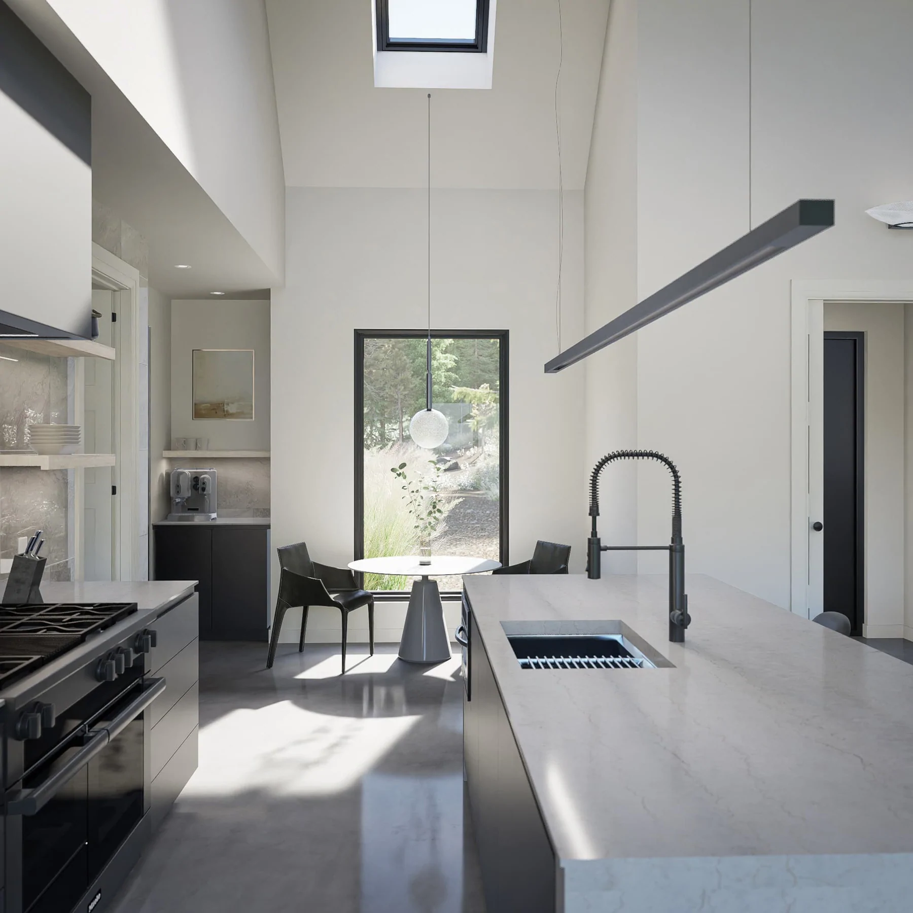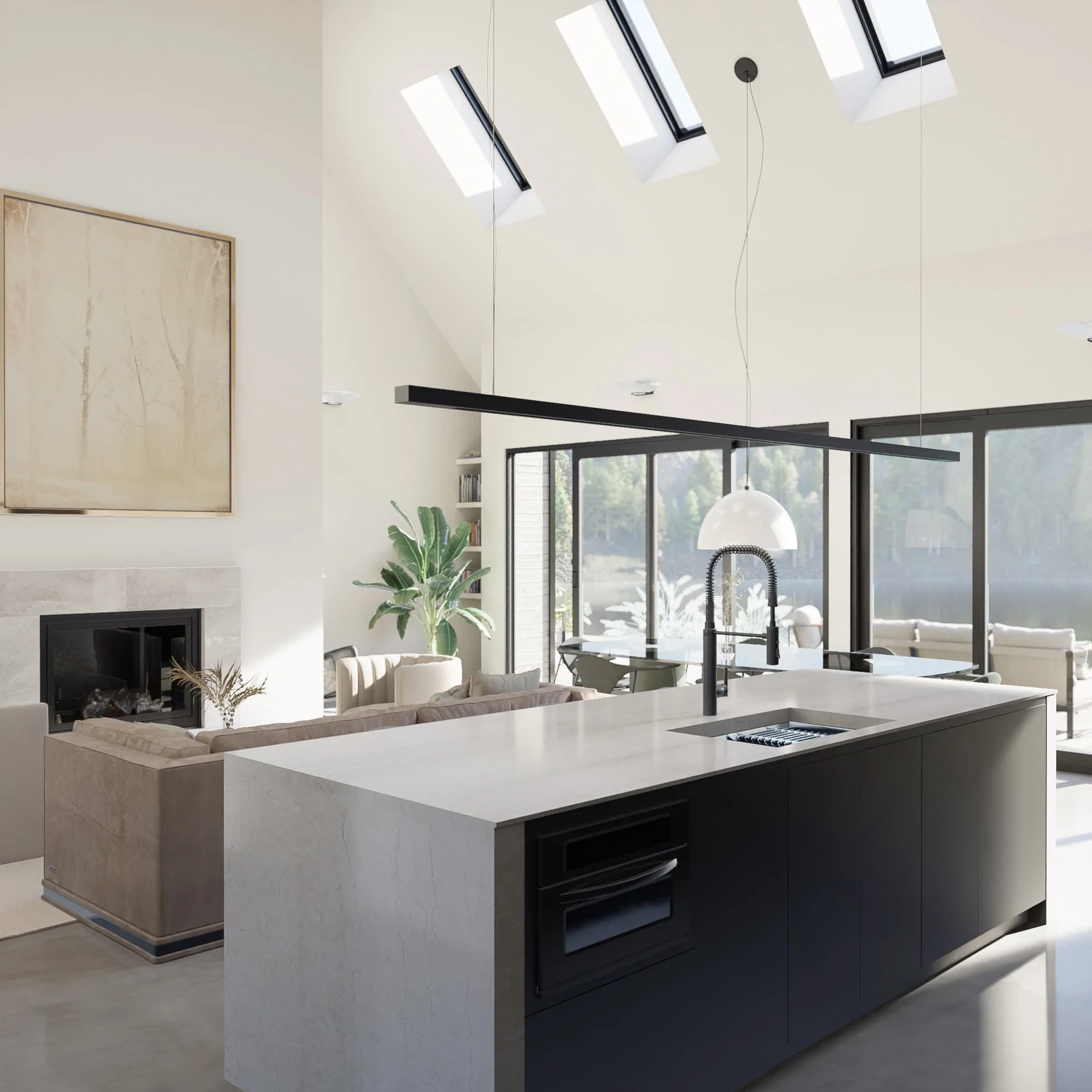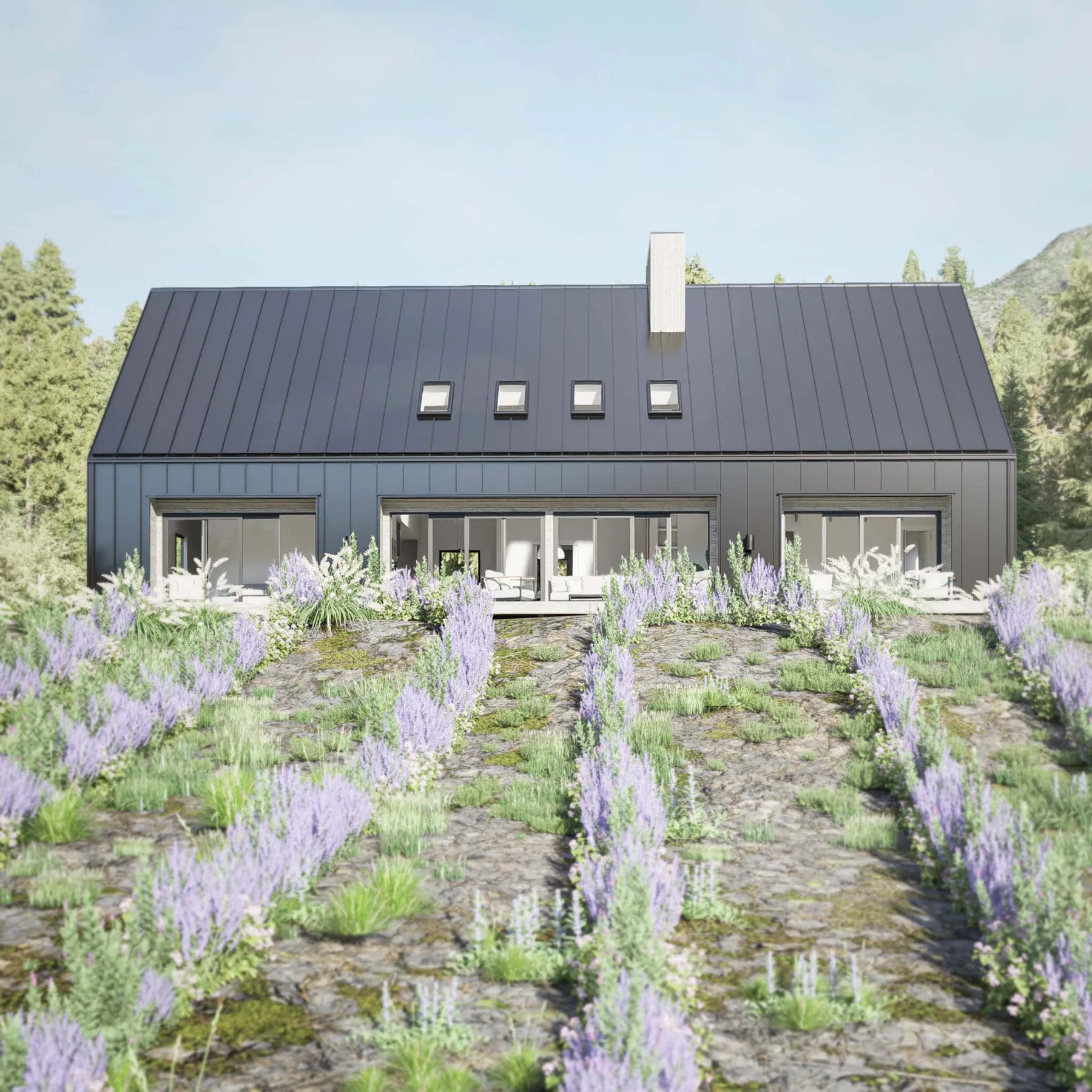 Inspiracją dla projektu była architektura Islandii – surowa, ale jednocześnie ciepła i funkcjonalna. Z zewnątrz dom zachwyca czystą linią, a wewnątrz zaskakuje wysokimi sufitami, ekstensywnymi przeszkleniami, otwieranymi świetlikami oraz przemyślanym układem pomieszczeń. W środku znajdują się trzy pełnowymiarowe pokoje, które oferują komfortową przestrzeń do życia, pracy i wypoczynku.