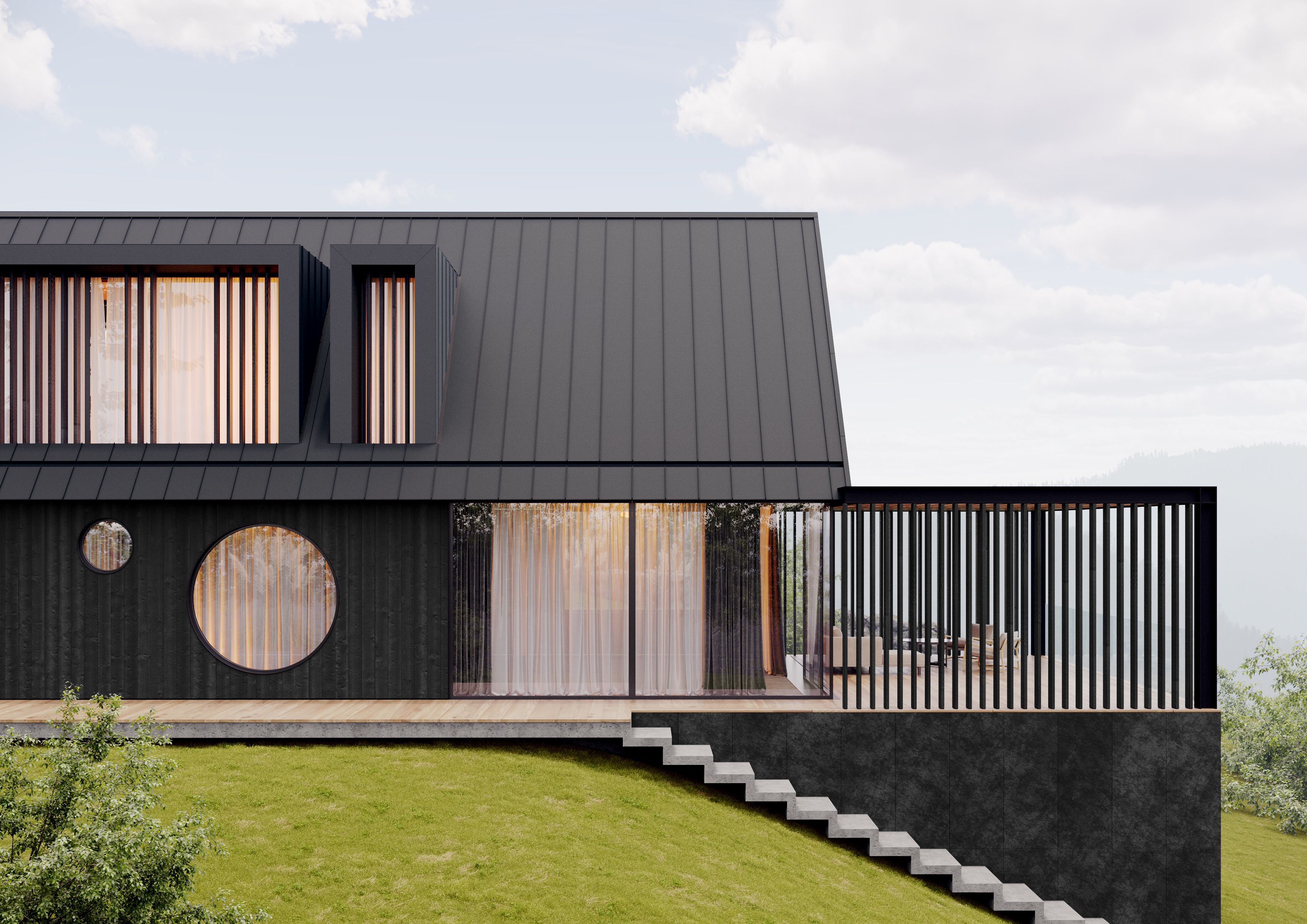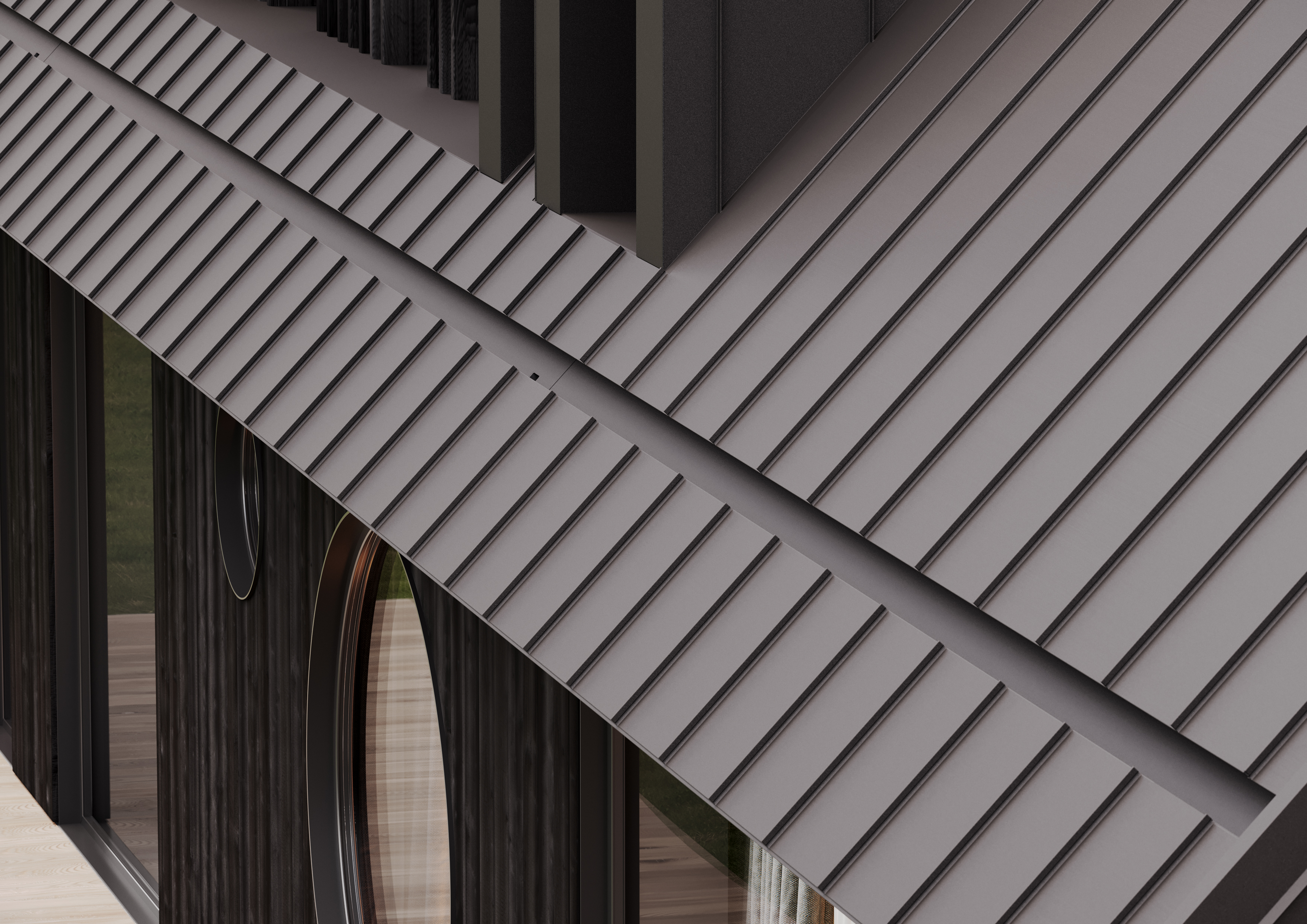 W ramach tego innowacyjnego projektu zastosowano system dachowy DACHRYNNA firmy Galeco, który doskonale wpisuje się w ideę minimalizmu i dbałości o detale. Ten zintegrowany system 2w1 łączy panel dachowy montowany „na click” z ukrytym systemem rynnowym, dzięki czemu elementy rynien są praktycznie niewidoczne, co znacząco wpływa na estetykę budynku i komponuje się z otoczeniem. Zastosowanie DACHRYNNY pozwoliło zachować czystość formy dachu i usunąć z krajobrazu wizualny chaos, podkreślając tym samym nowoczesną, a jednocześnie spójną z naturą architekturę Domu Słowiańskiego.