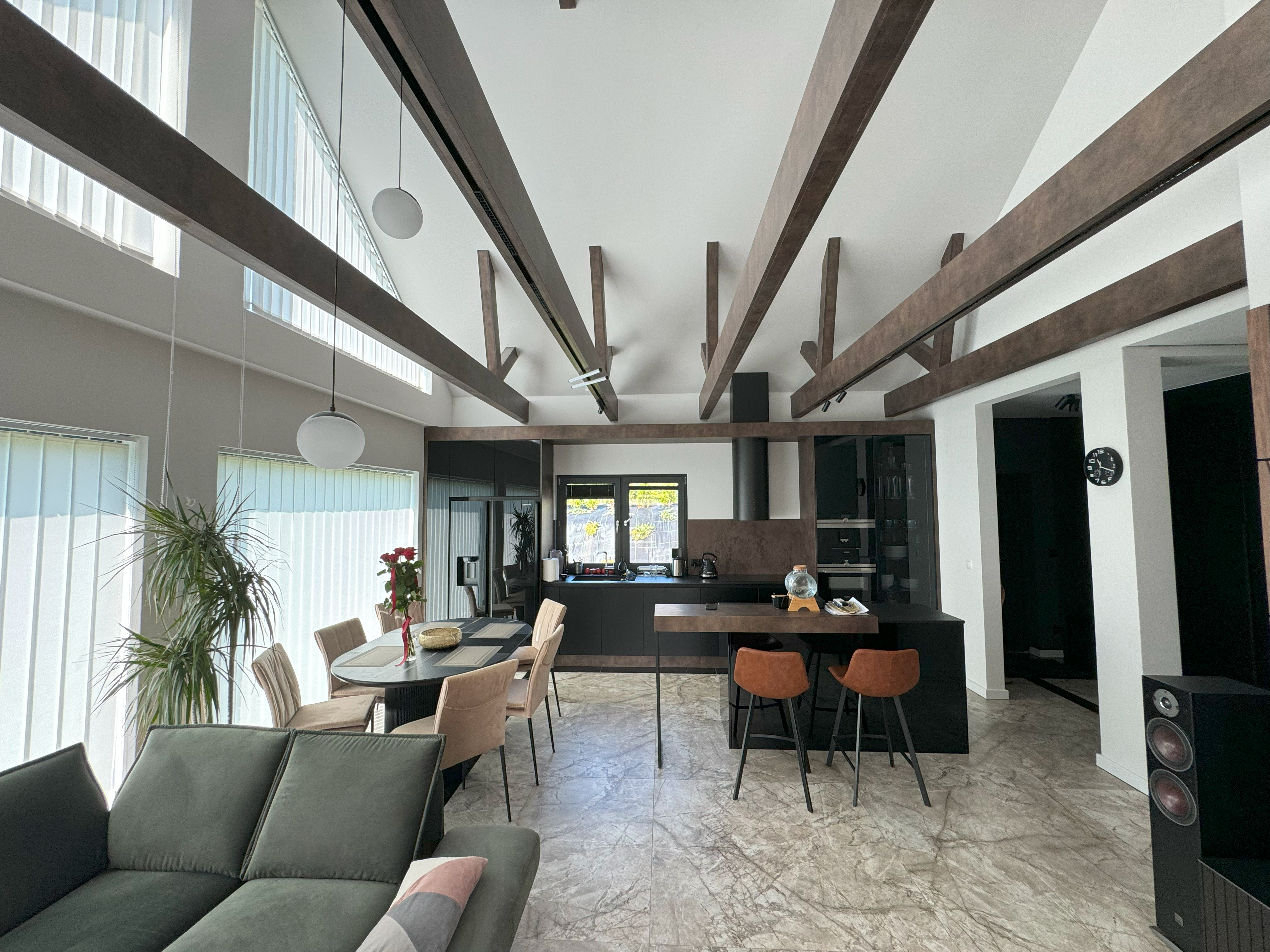 Wnętrza tej energooszczędnej stodoły zostały zaprojektowane z niezwykłą dbałością o ergonomię i komfort użytkowników. Przemyślany układ funkcjonalny umożliwia optymalne wykorzystanie przestrzeni, integrując strefę dzienną i prywatną w spójną całość. Panoramiczne przeszklenia zapewniają wnętrzom maksymalne doświetlenie naturalnym światłem, a jednocześnie umożliwiają nieustanny kontakt z otaczającą przyrodą, nadając wnętrzom nowoczesny charakter.
