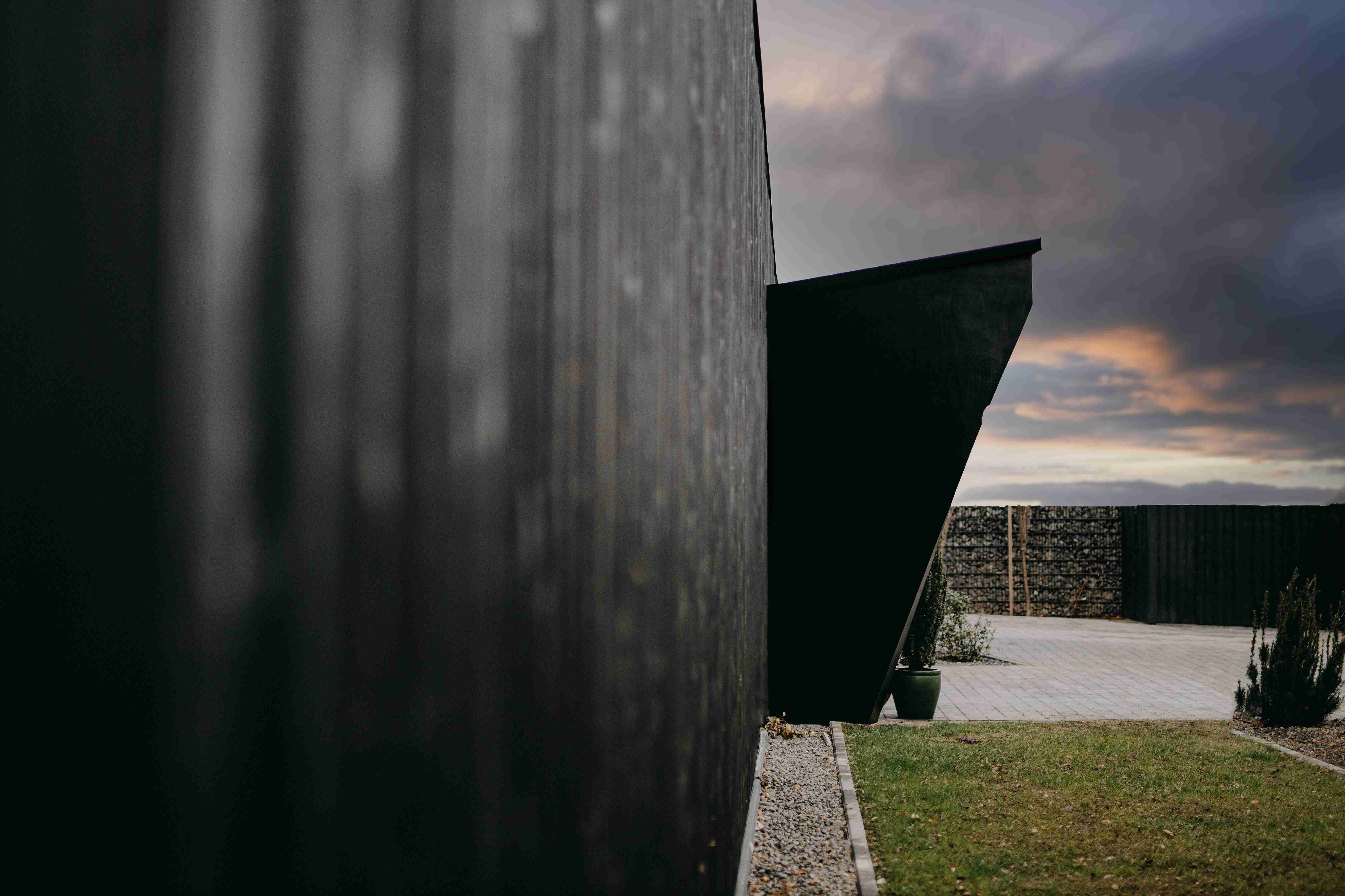 Zachowując spójną stylistykę w aranżacji przestrzeni wokół domu zastosowano materiały użyte do wykończenia elewacji. Pełny płot z drewnianych opalanych desek Wood of Fire skutecznie izoluje posesję, a jednocześnie zachwyca bezpretensjonalnym wdziękiem. Drewno daje ogromne możliwości kształtowania linii, stopnia prześwitu i faktury ogrodzenia. Ogrodzenie, wykonane z tego samego materiału, to długowieczny produkt, niewymagający okresowej konserwacji. Zaletą ogrodzenia z opalanych desek jest wytrzymałość na warunki pogodowe, a także miły dla oka estetyczny wygląd. Te wszystkie spójnie połączone ze sobą elementy tworzą bardzo ciekawie prezentującą się całość.