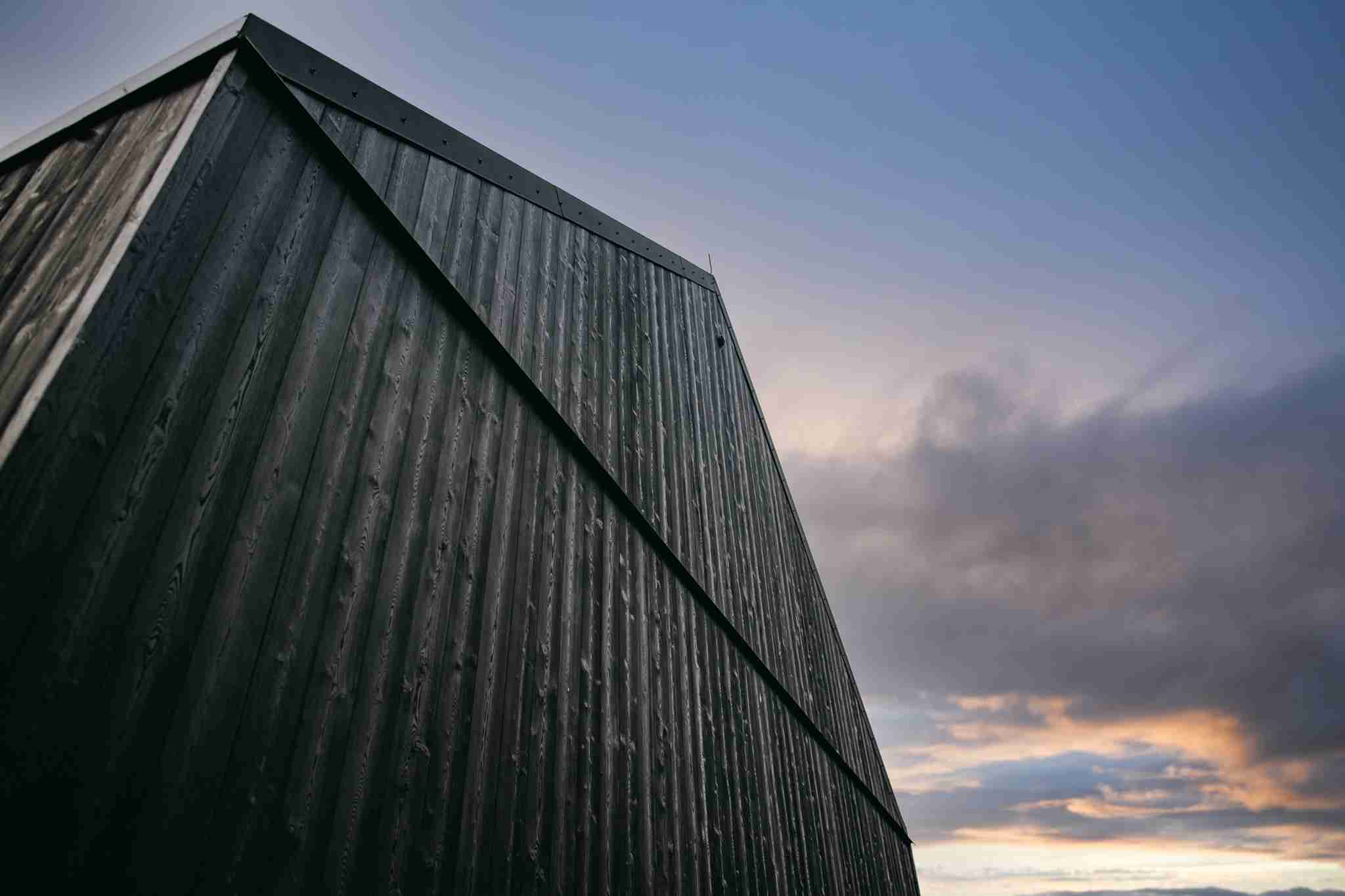 Pomysł na surową, „naturalną” formę budynku przejawia się w wykończeniu elewacji pokrytej deskami z modrzewia syberyjskiego od producenta opalanych desek Wood of Fire. Elewacja została wykonana w całości z drewna opalanego tradycyjną japońską techniką Shou Sugi Ban. Metoda ta polega przede wszystkim na naturalnym zabarwieniu desek na czarno, oraz konserwacji drewna poprzez opalanie. Wspominany proces sprawia, że drewno jest bardziej trwałe oraz wydobywa z niego również jego walory estetyczne. W pierwotnym założeniu deski konserwowane techniką Shou Sugi Ban miały zastosowanie wyłącznie przy budowie domów. Obecnie wykańcza się nimi elewacje, wznosi ogrodzenia, pergole i trejaże, dekoruje ściany, buduje tarasy, układa ogrodowe posadzki.