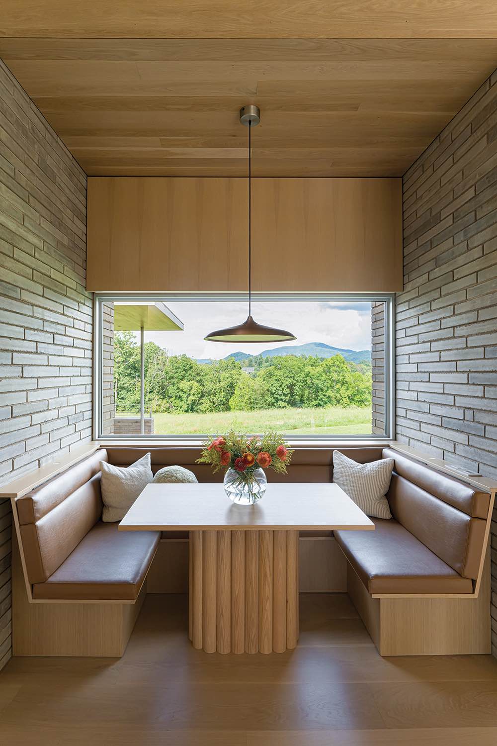 W domu znalazło się również miejsce na przytulny kącik śniadaniowy, w którym cegła architektoniczna Arriscraft przenika z zewnątrz do wnętrza, podkreślając spójność całej koncepcji. Tapicerowana ławka z wegańskiej skóry i dębowy stół tworzą miejsce codziennych spotkań przy kawie.