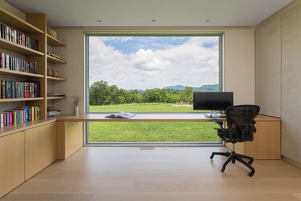 Biuro, w którym para pracuje razem, jest zupełnym przeciwieństwem ich dawnego gabinetu w Buffalo – ciasnego i pozbawionego okna. Teraz duże przeszklenia otwierają się na łąkę, a ręcznie wykonane biurko i półki zapewniają funkcjonalność bez zakłócania widoków.