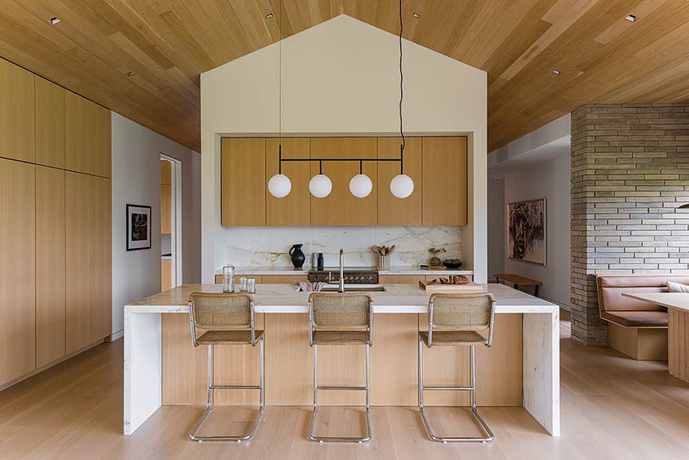 We wnętrzach króluje biały dąb – na podłogach, sufitach i meblach. Jego naturalna faktura łagodzi chłód szkła i podkreśla powiązanie z naturą. Kluczowym punktem projektu stała się wyspa kuchenna z marmuru Cremo Delicato, której delikatne żyłkowanie zainspirowało całą paletę materiałową.