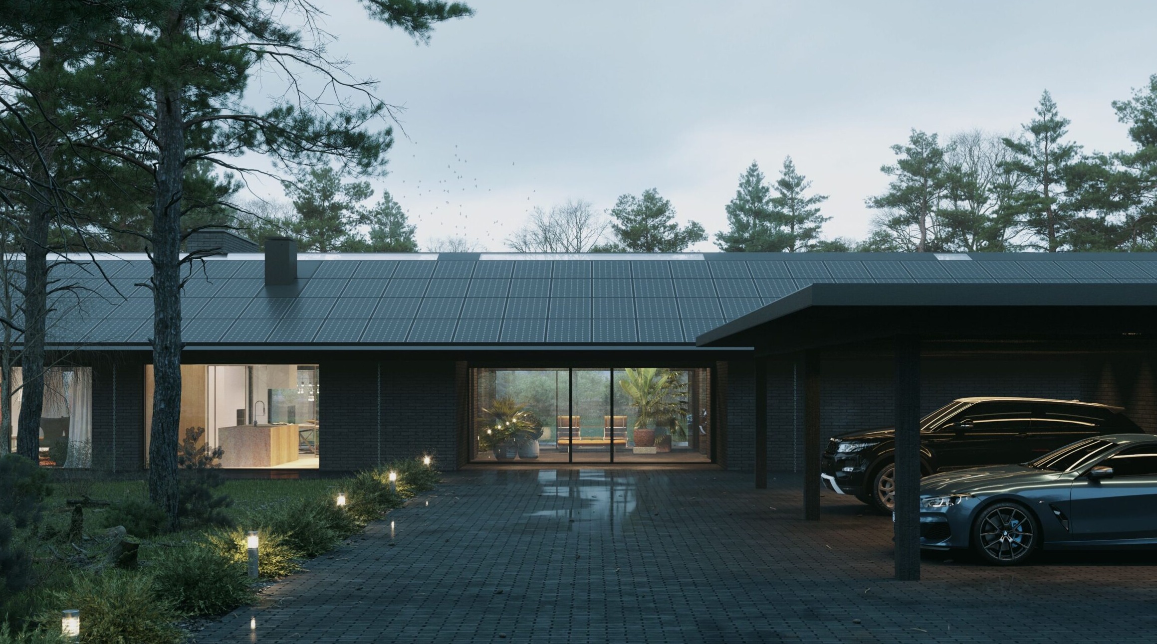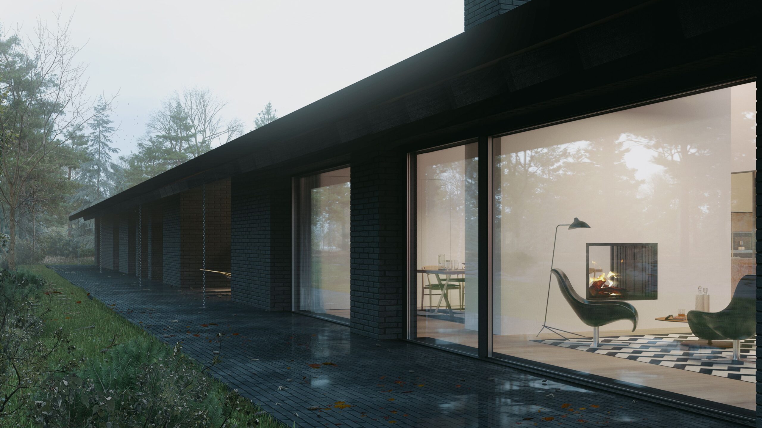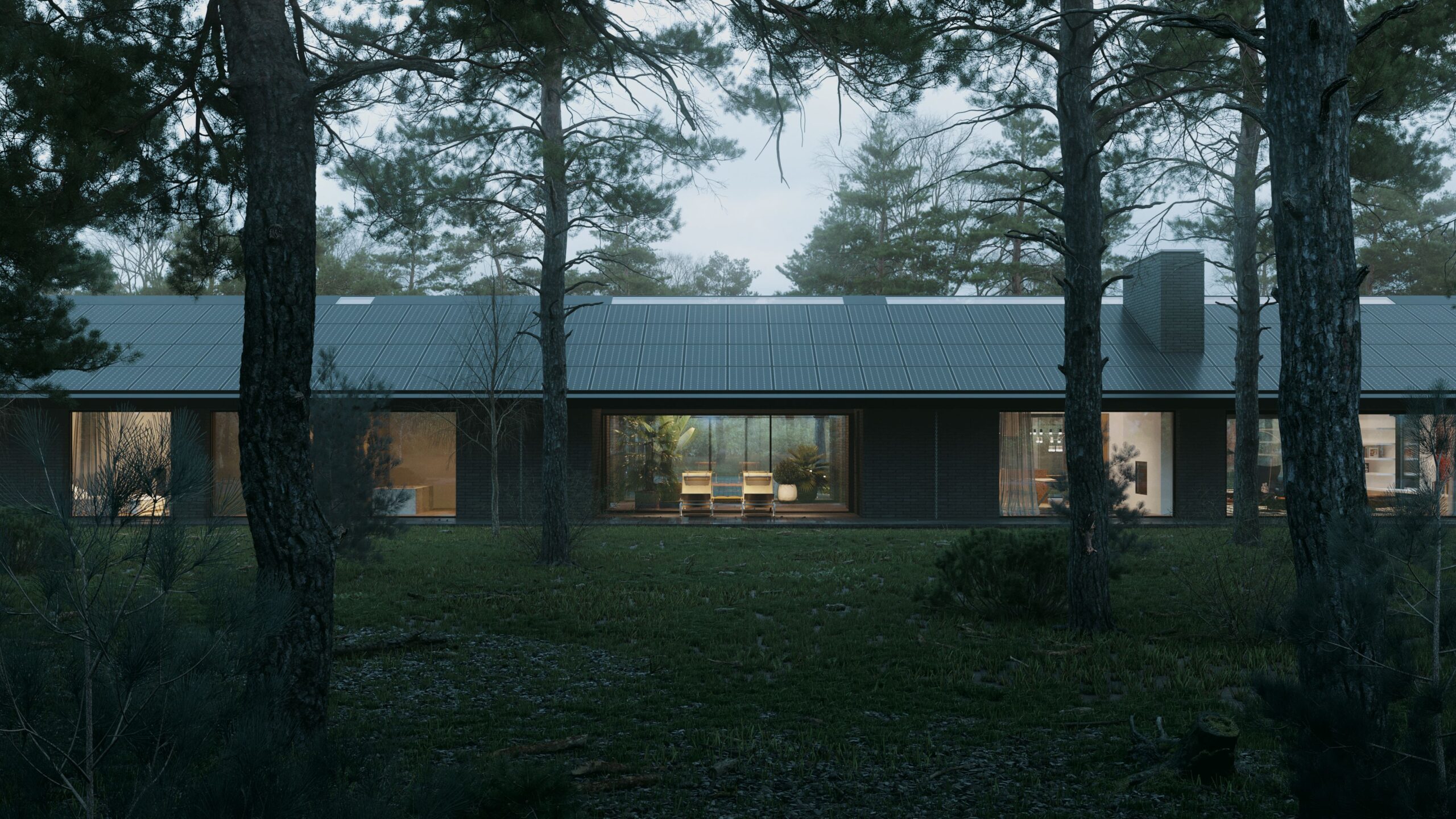 Elewacja budynku została zaprojektowana jako bezpośrednia konsekwencja układu wnętrz i otwarcia na las. Charakterystycznym elementem są wielkoformatowe przeszklenia od podłogi do sufitu, które w części dziennej dominują nad pełnymi ścianami, tworząc rytm przypominający leśne światłocienie. Ciemnoszara cegła elewacyjna, opalane drewno, aluminiowa stolarka i panele fotowoltaiczne kontrastują z otaczającą zielenią. Dom jest jednocześnie wysokoenergooszczędny i niemal samowystarczalny — dachy pokryto panelami PV, zastosowano wodę ze studni oraz przydomową oczyszczalnię ścieków. To przykład nowoczesnej architektury jednorodzinnej, w której technologia, materiały i natura tworzą spójną całość.