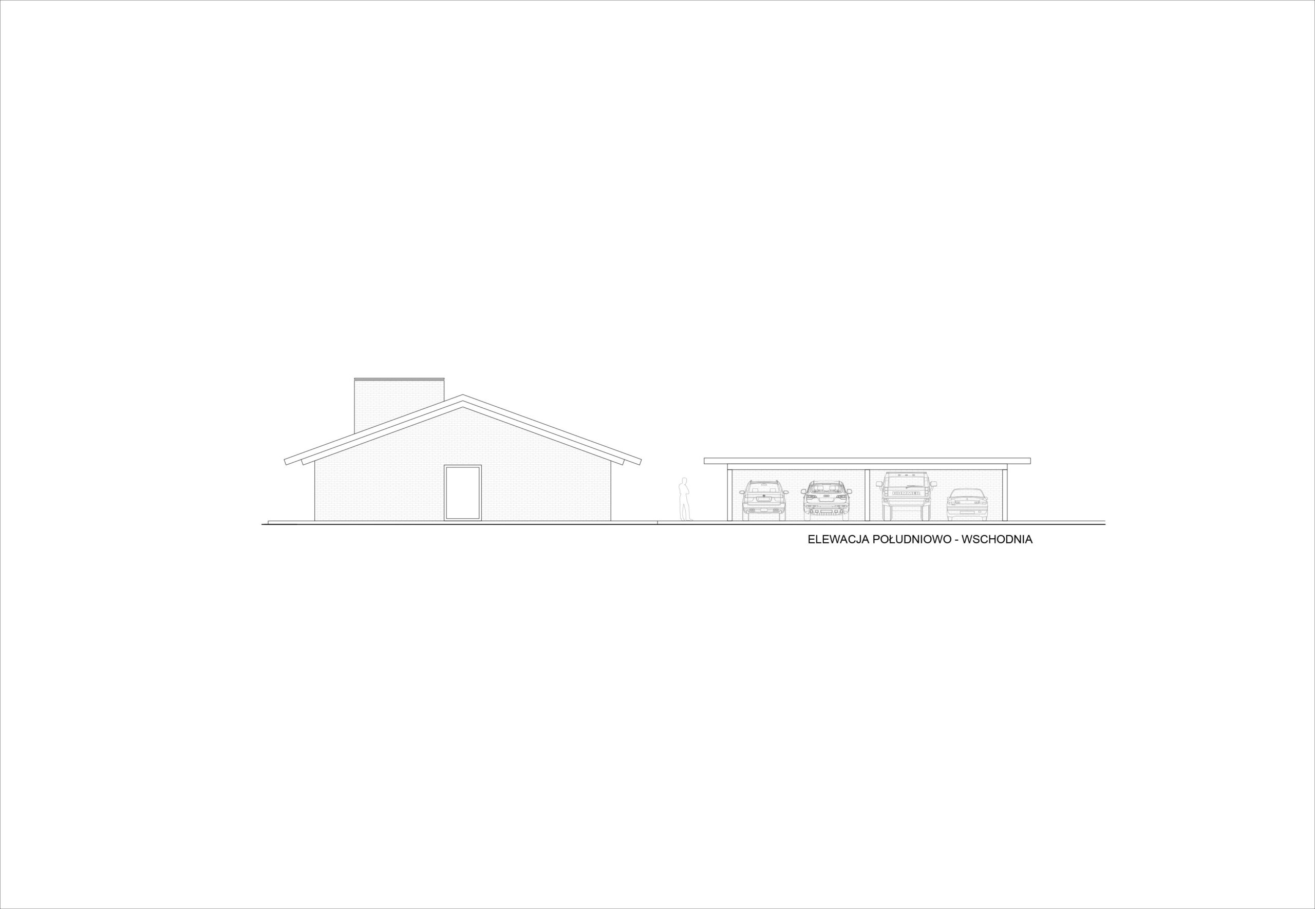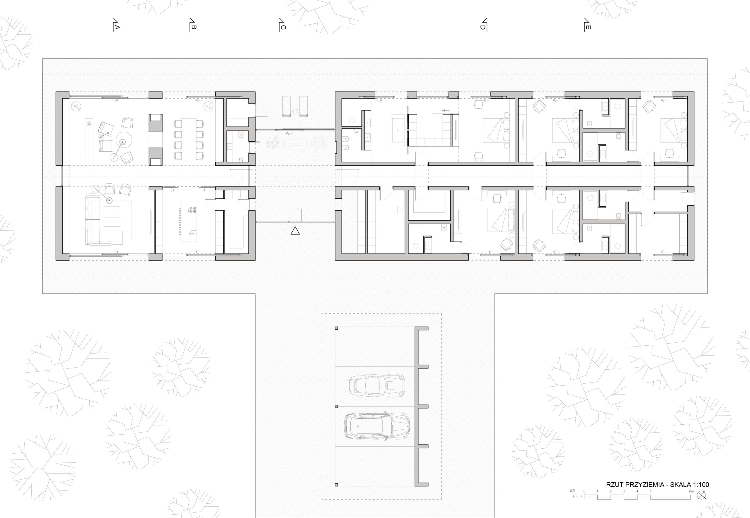 Parterowy dom o powierzchni 400 m² zaprojektowano dla małżeństwa, z myślą o wizytach dorosłych dzieci i wnuków. Układ funkcjonalny został podzielony na wyraźną strefę dzienną i nocną, połączone centralną sienią wejściową. Sercem części dziennej jest przestronny salon z dwustronnym kominkiem, który subtelnie oddziela go od kuchni i jadalni. W części nocnej znajdują się cztery niezależne sypialnie, każda z własną łazienką, a całość uzupełniają garderoba, spiżarnia i pomieszczenie gospodarcze. Prosta, linearna bryła oraz czytelny układ przestrzenny przywodzą na myśl ideę, jaką we współczesnym projektowaniu reprezentuje nowoczesna stodoła — funkcjonalną, oszczędną w formie i silnie związaną z krajobrazem.