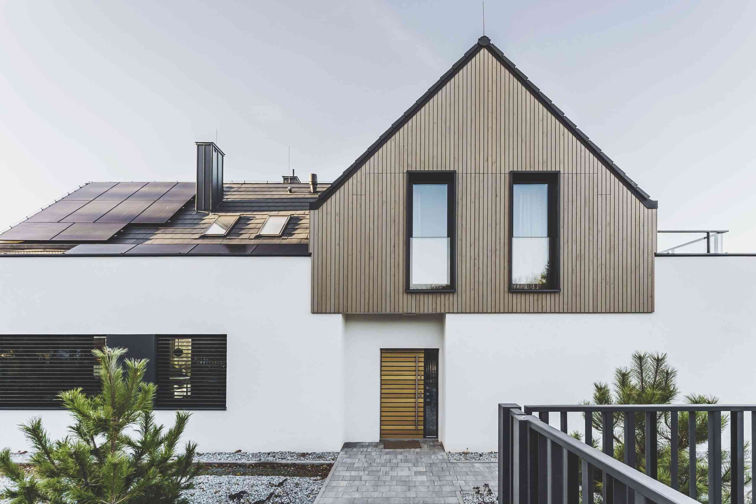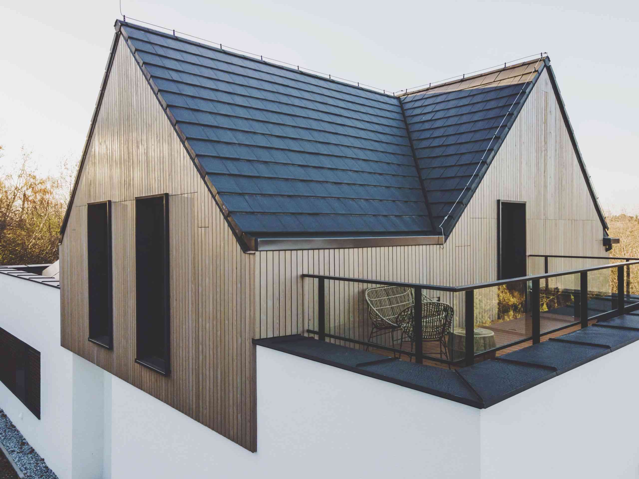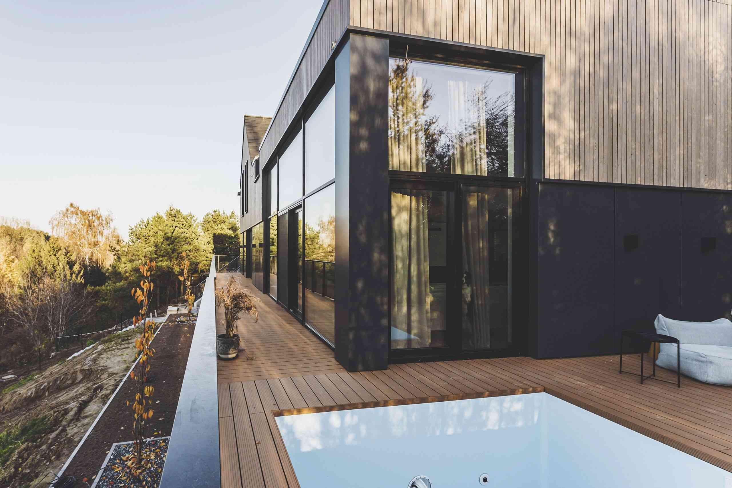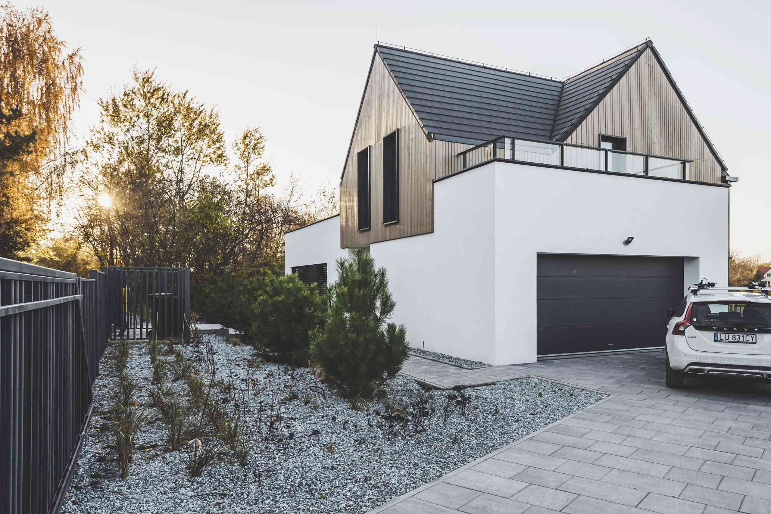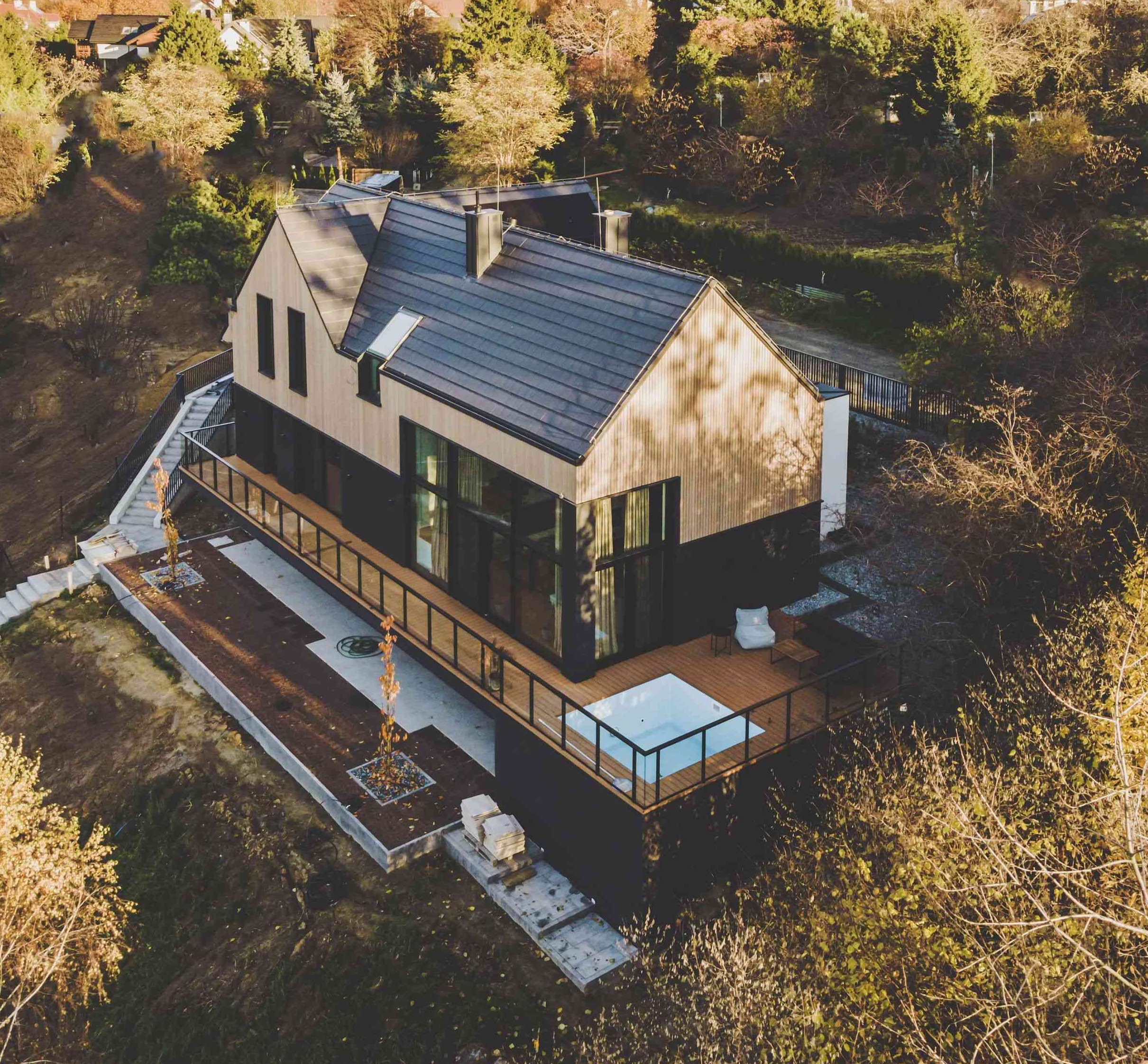 Jednym z najbardziej efektownych elementów domu jest taras z basenem, wyniesiony ponad poziom gruntu, z którego domownicy mogą podziwiać panoramę lasu i zażywać kąpieli „w koronach drzew”. W kondygnacji podziemnej zaprojektowano strefę rozrywki z wyjściem do ogrodu, tworząc idealne miejsce do wypoczynku i spotkań z rodziną. Do wykończenia elewacji wykorzystano deski z modrzewia syberyjskiego, zestawione z białym tynkiem i czarnymi panelami, co nadało bryle elegancki, stonowany charakter. Ten projekt udowadnia, że nowoczesna stodoła może stać się równocześnie luksusowym, przytulnym i ekologicznym domem w zgodzie z naturą.