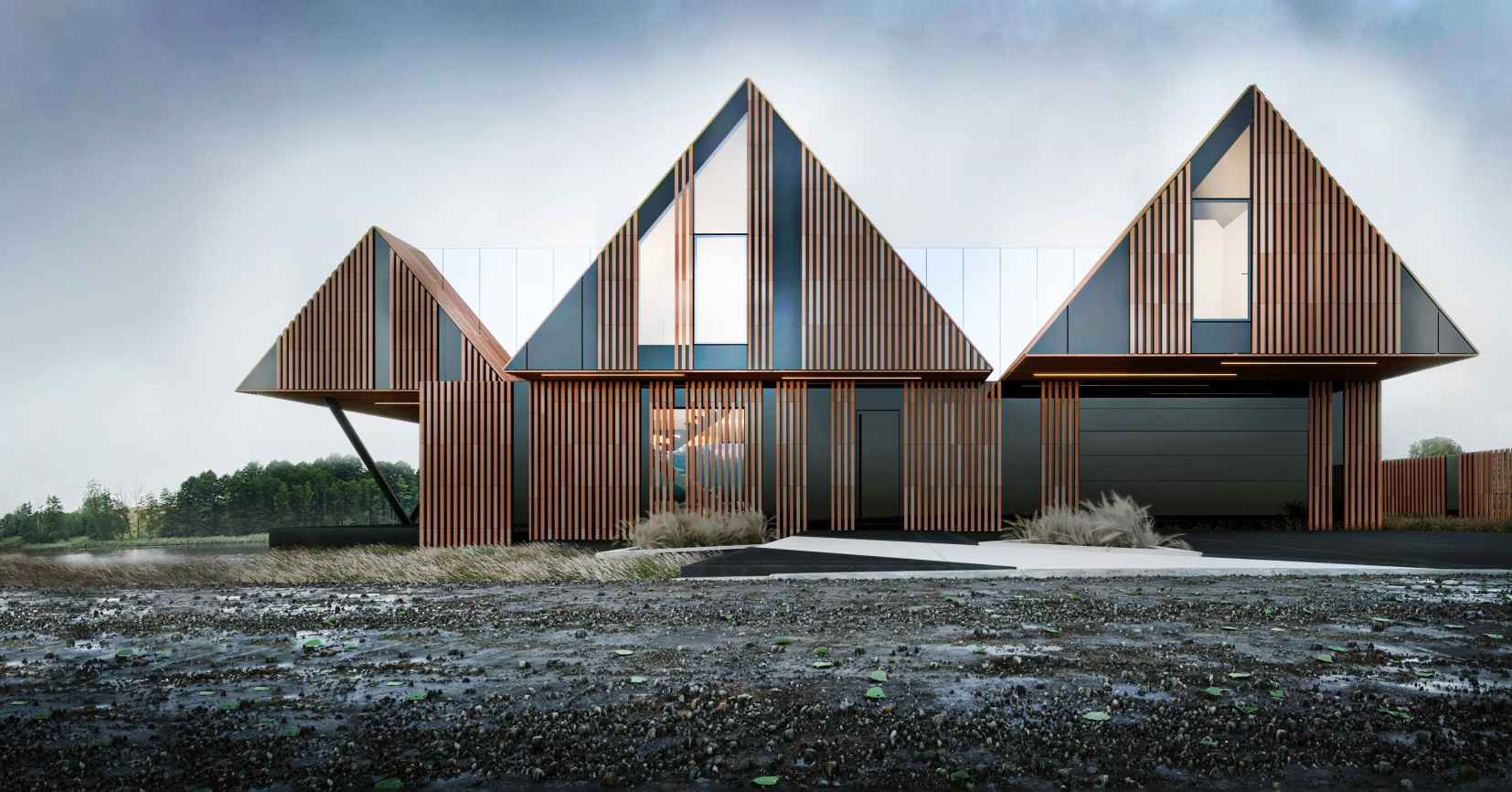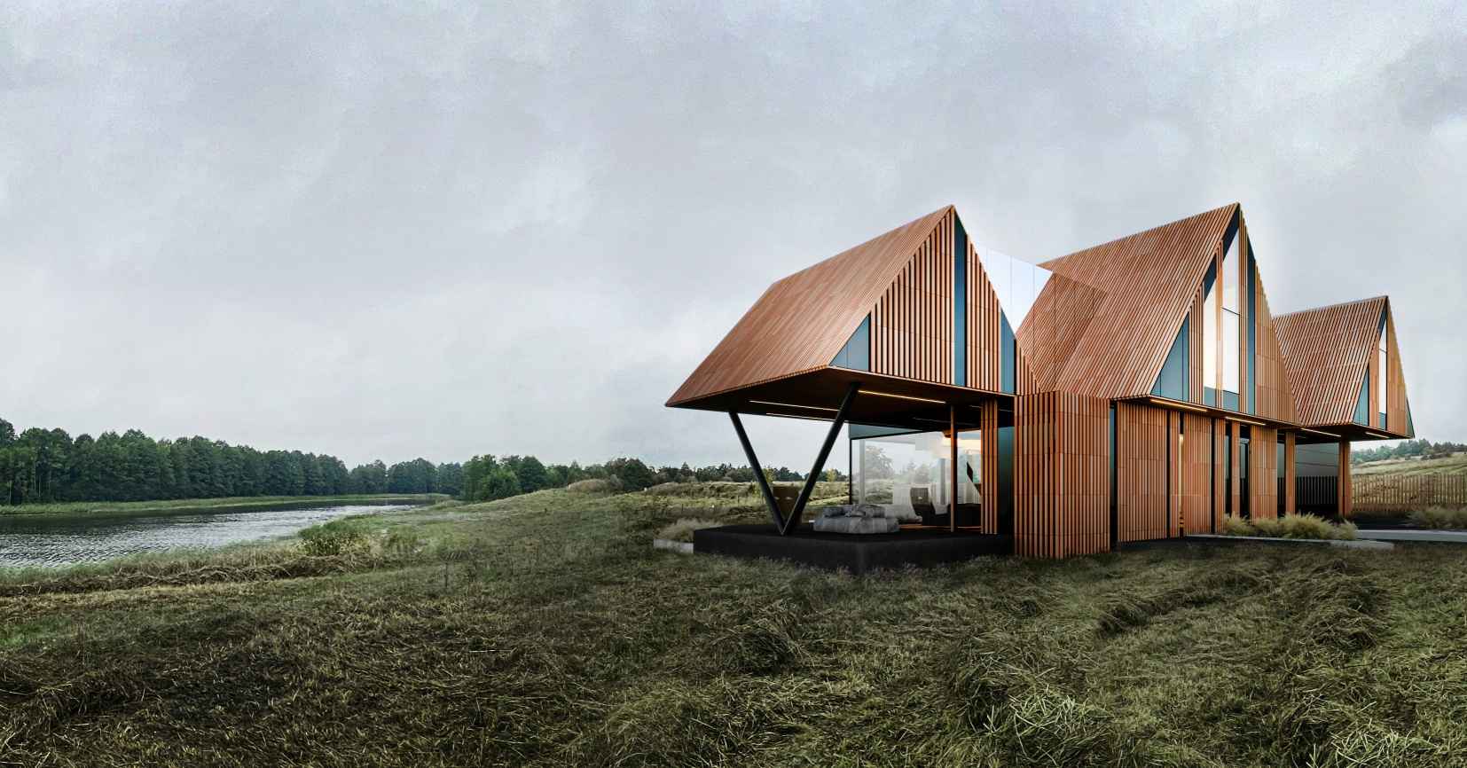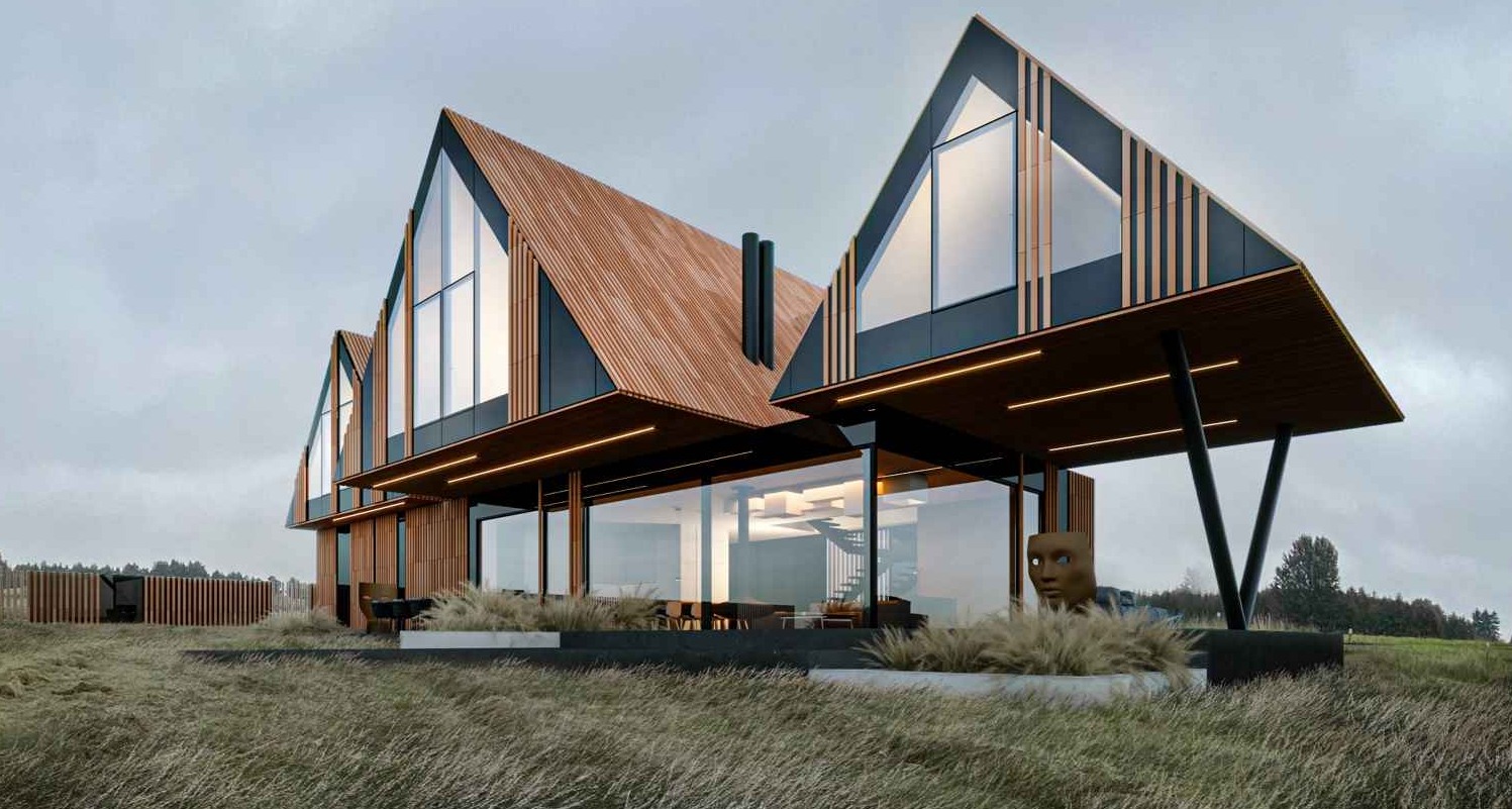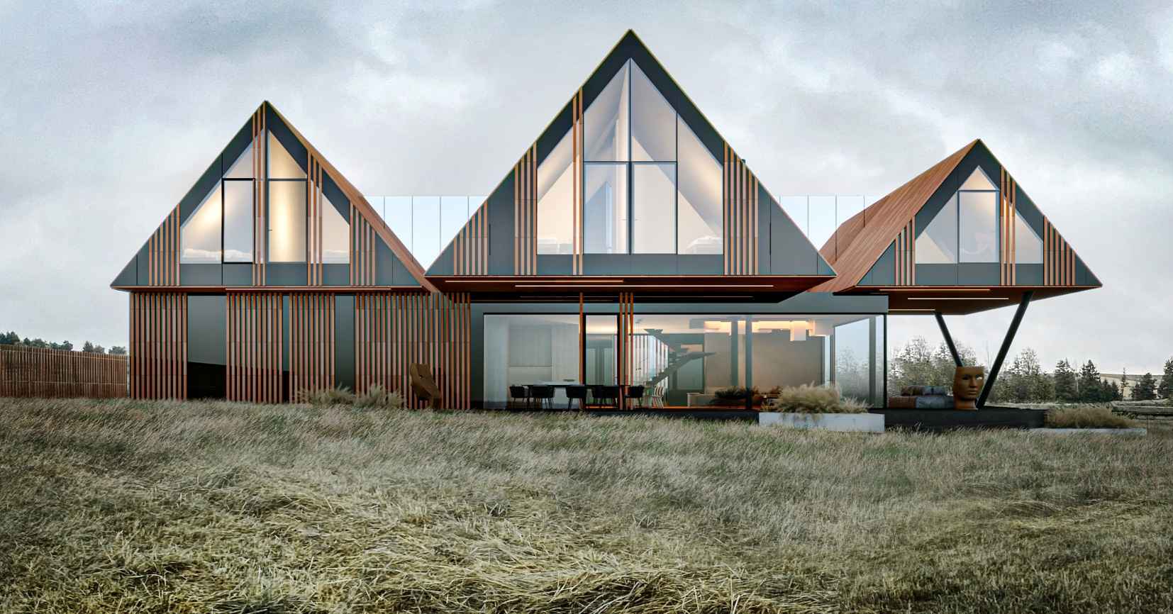 Bryła domu została zaprojektowana jako trzy trójkątne formy inspirowane kultowymi domkami letniskowymi typu Brda, osadzone na prostopadłościennej podstawie. Każda z brył pełni odrębną funkcję – prywatną strefę dla rodziców, syna oraz gości – co zapewnia komfort i niezależność domowników. Trójkątne moduły połączono lustrzanymi łącznikami z allucobondu, które z zewnątrz stapiają się z krajobrazem Mazur, a wewnątrz tworzą funkcjonalne korytarze. Układ przestrzenny domu odpowiada współczesnym potrzebom, łącząc ideę domu wakacyjnego z całoroczną rezydencją.