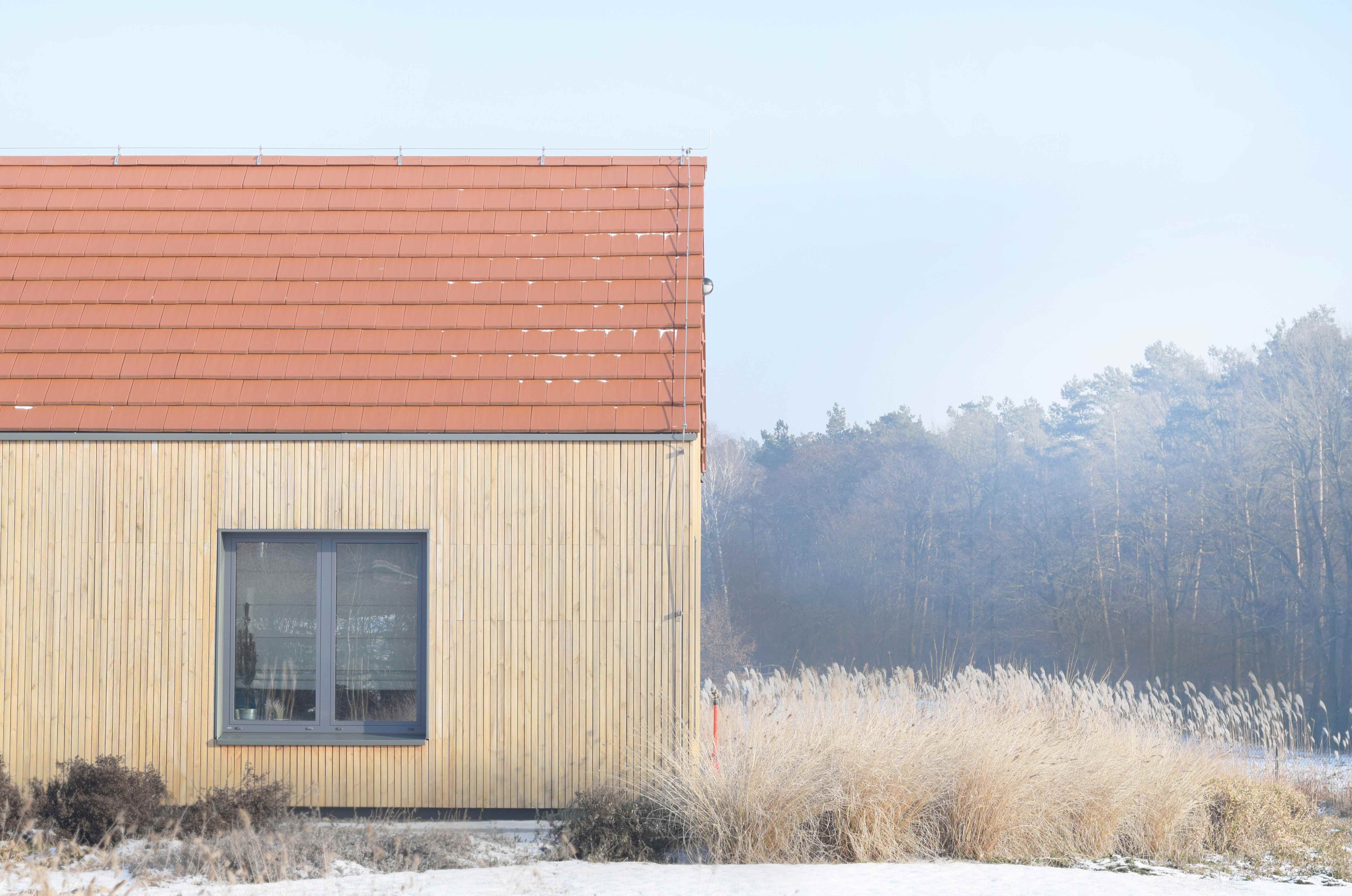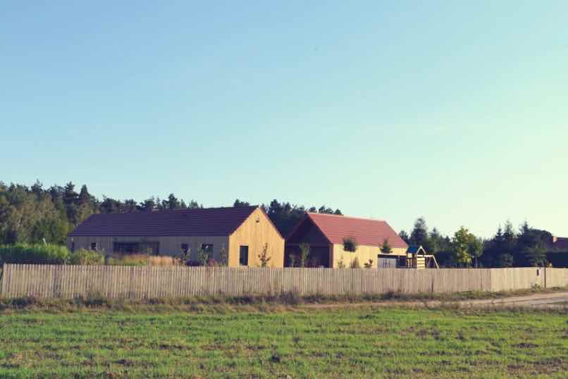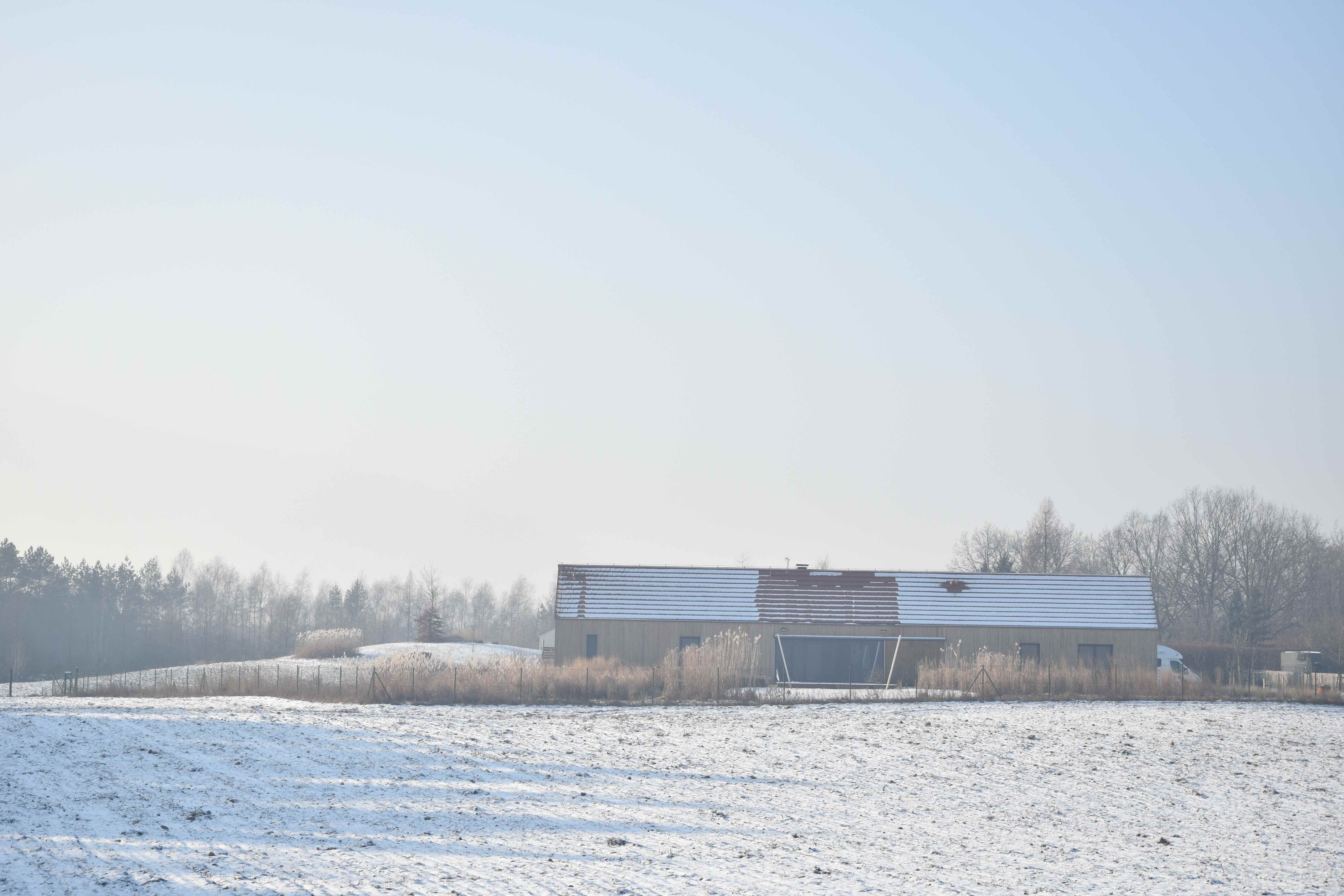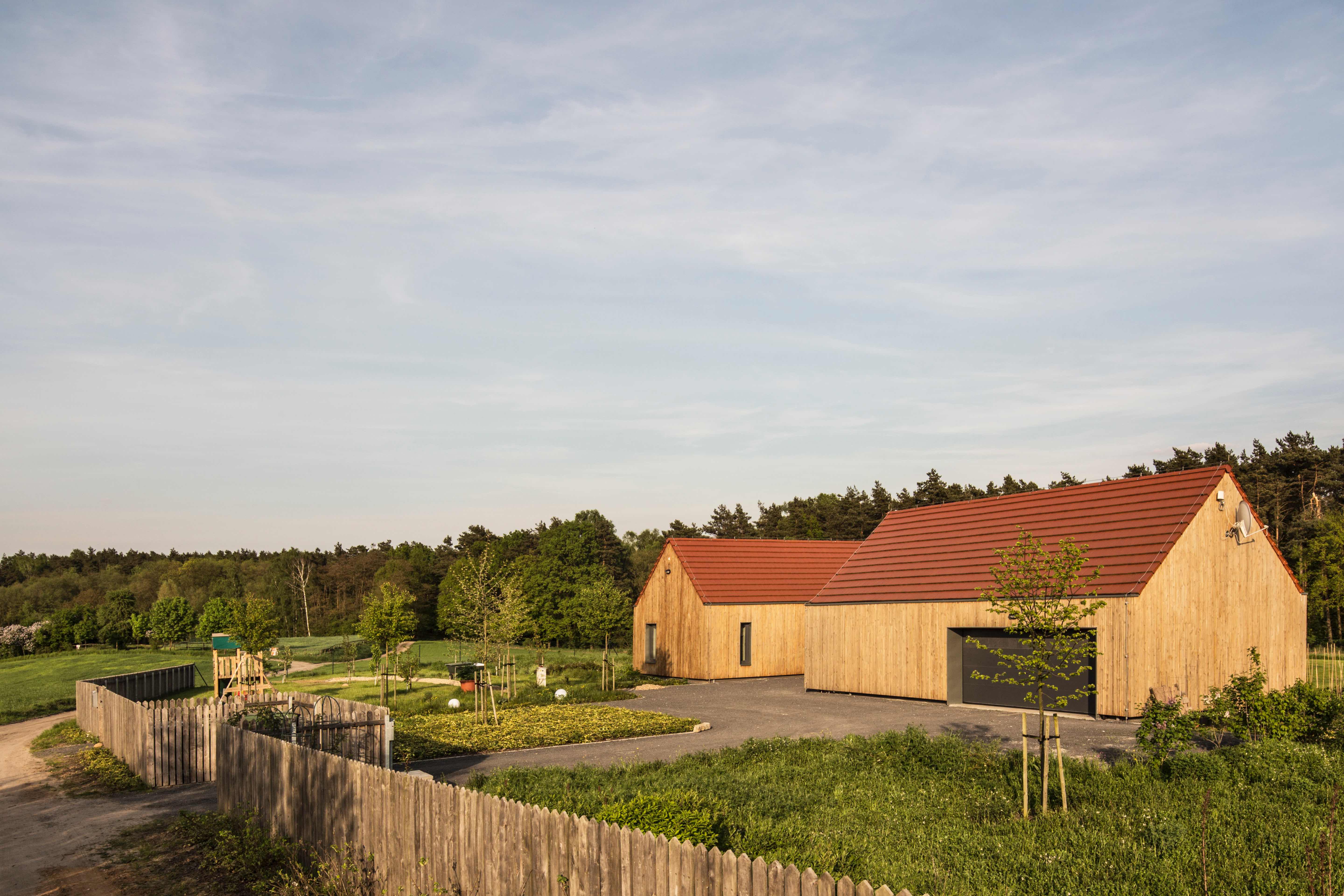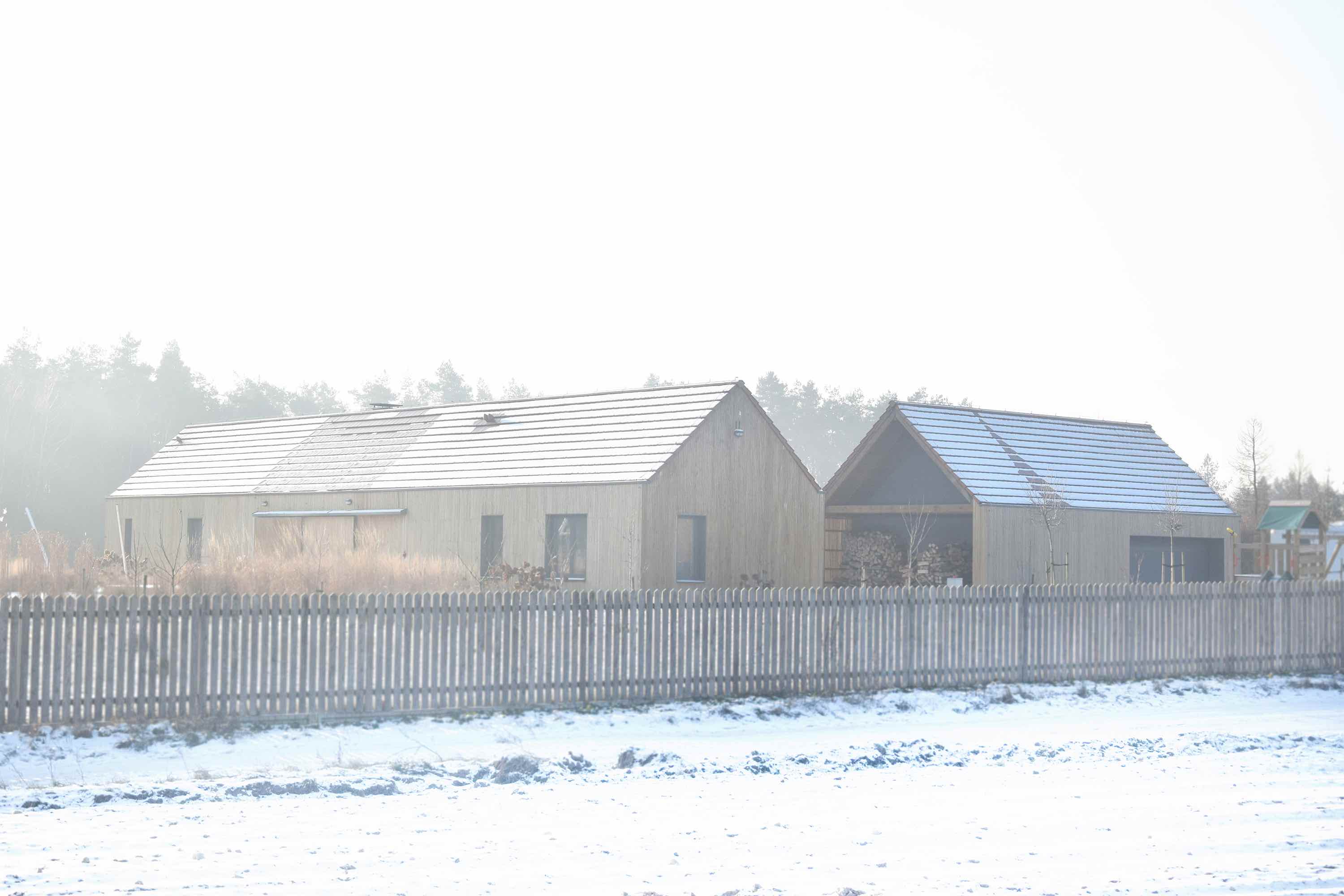 Bryła mieszkalna i budynek gospodarczy zostały umieszczone w centralnej części działki, tworząc kompozycję przypominającą dawną zagrodę wiejską. Dwie prostopadle ustawione względem siebie bryły wyznaczają czytelną przestrzeń, której orientacja względem stron świata zapewnia najlepsze możliwe doświetlenie pomieszczeń oraz widoki rozciągające się na otaczające tereny.