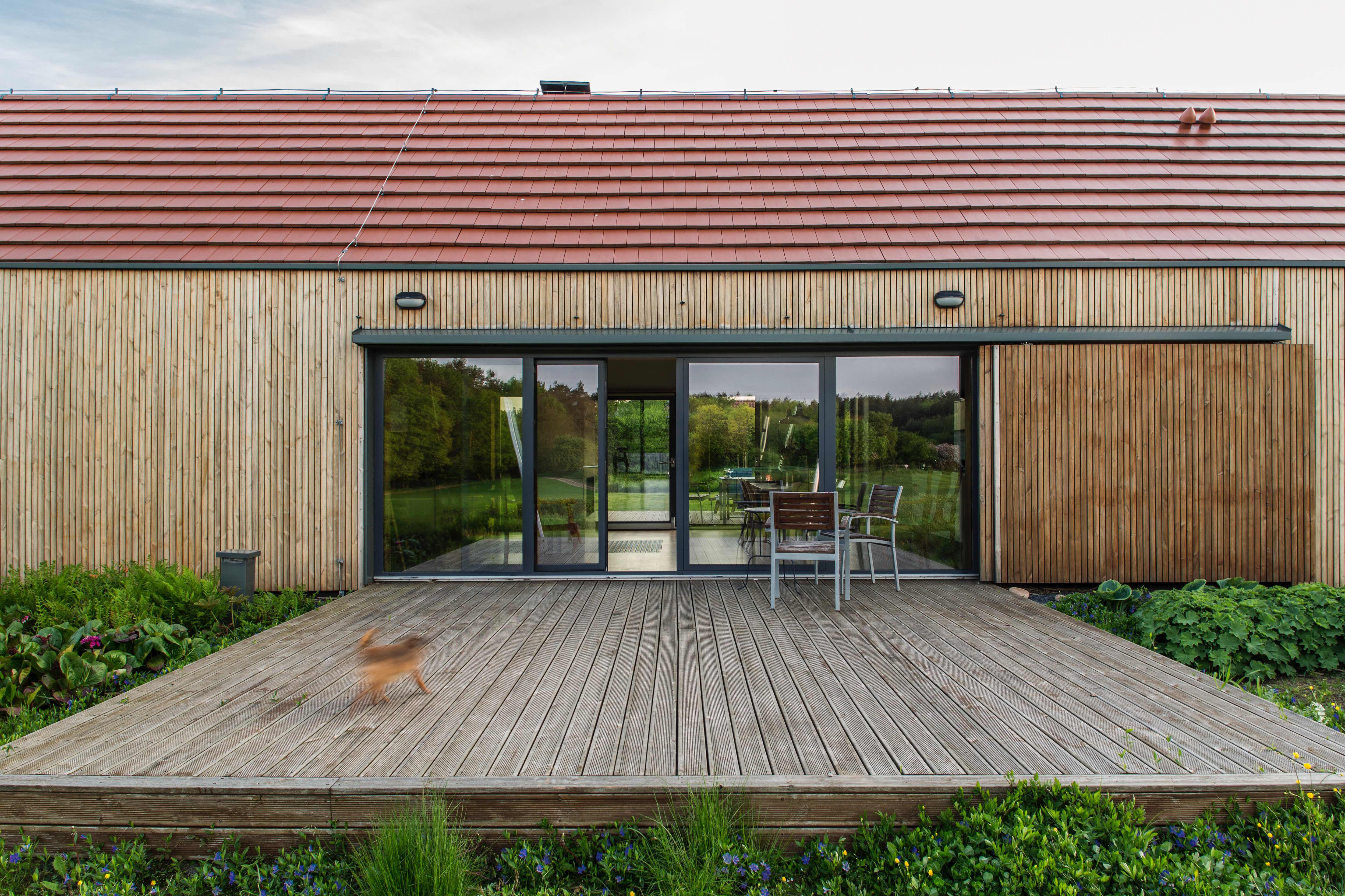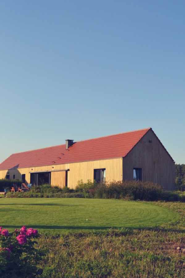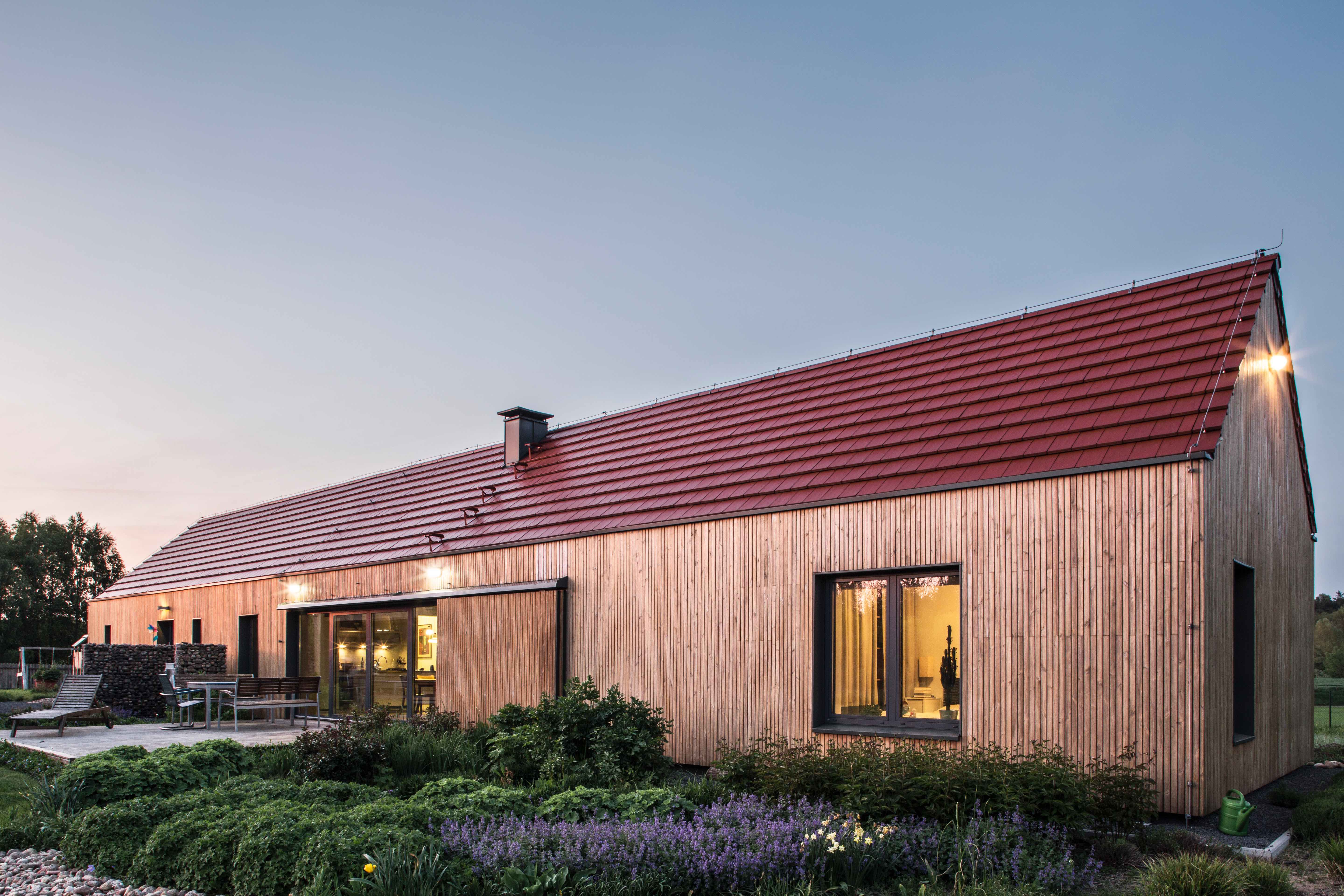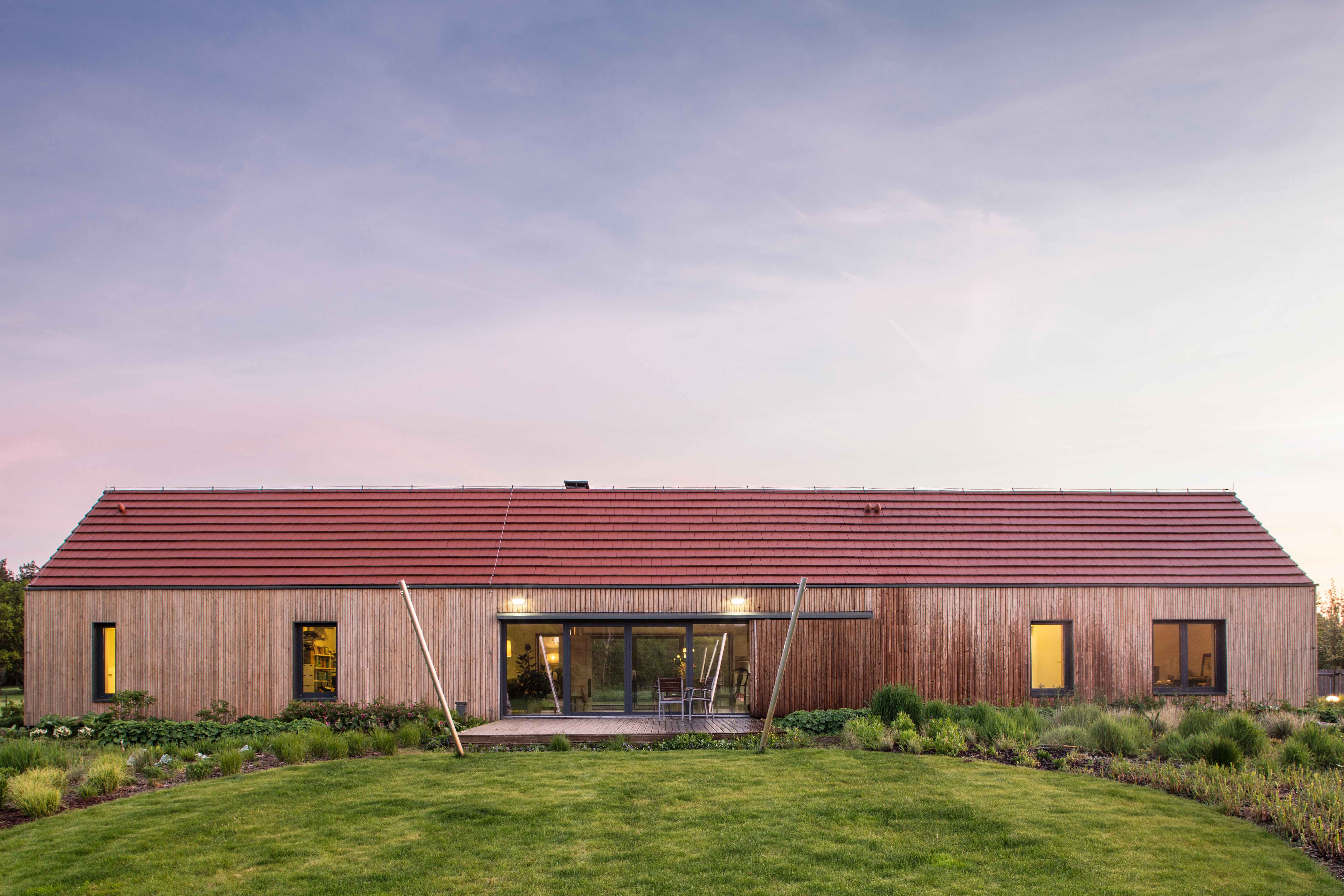 Bryła mieszkalna i budynek gospodarczy zostały umieszczone w centralnej części działki, tworząc kompozycję przypominającą dawną zagrodę wiejską. Dwie prostopadle ustawione względem siebie bryły wyznaczają czytelną przestrzeń, której orientacja względem stron świata zapewnia najlepsze możliwe doświetlenie pomieszczeń oraz widoki rozciągające się na otaczające tereny.
