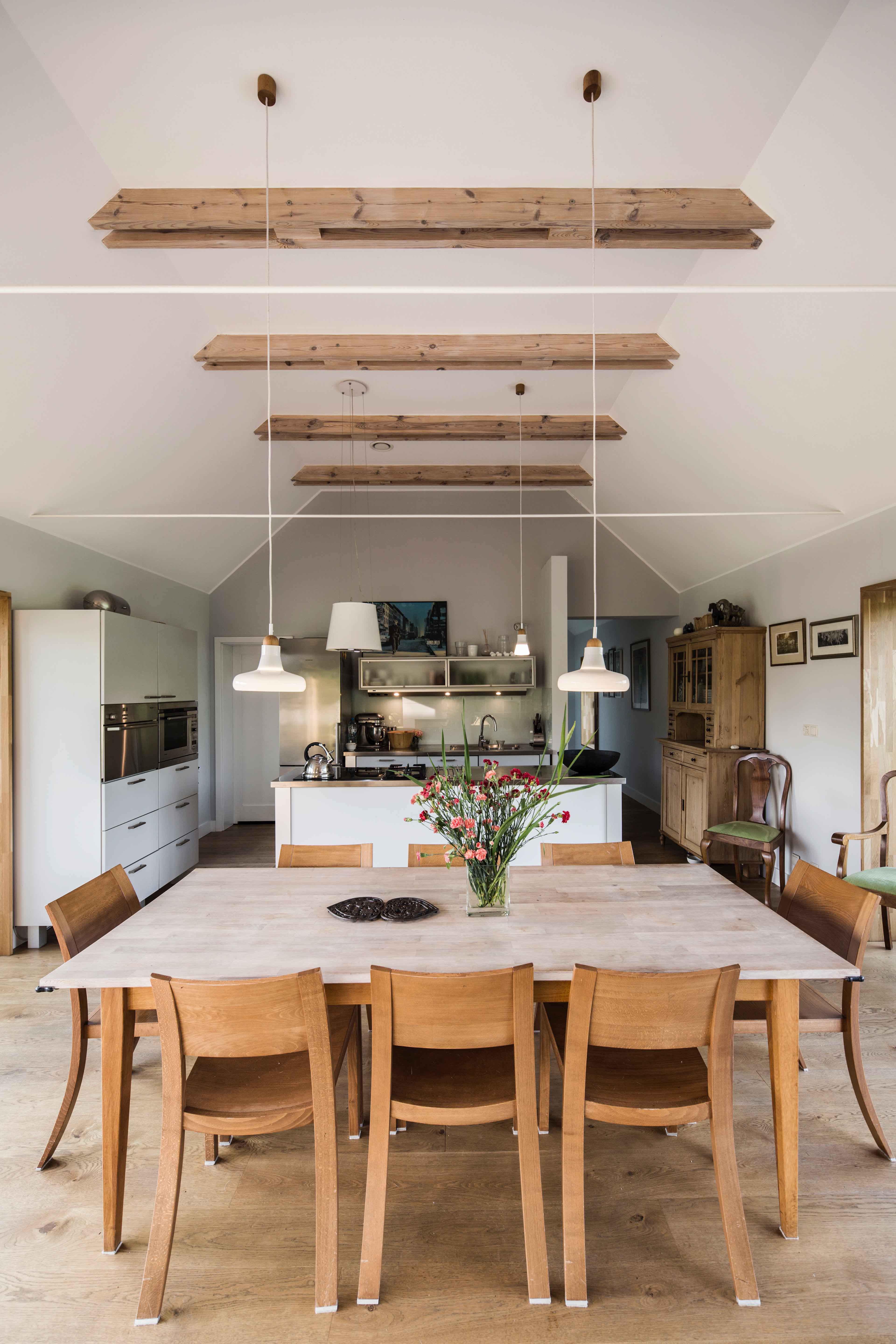 Latem, przy otwartych oknach i zasuniętych drewnianych okiennicach, dom tworzy przyjemnie zacienioną, dobrze wentylowaną strefę dzienną. Zimą okiennice zapewniają poczucie prywatności, jednocześnie filtrując światło wpadające do wnętrz.
