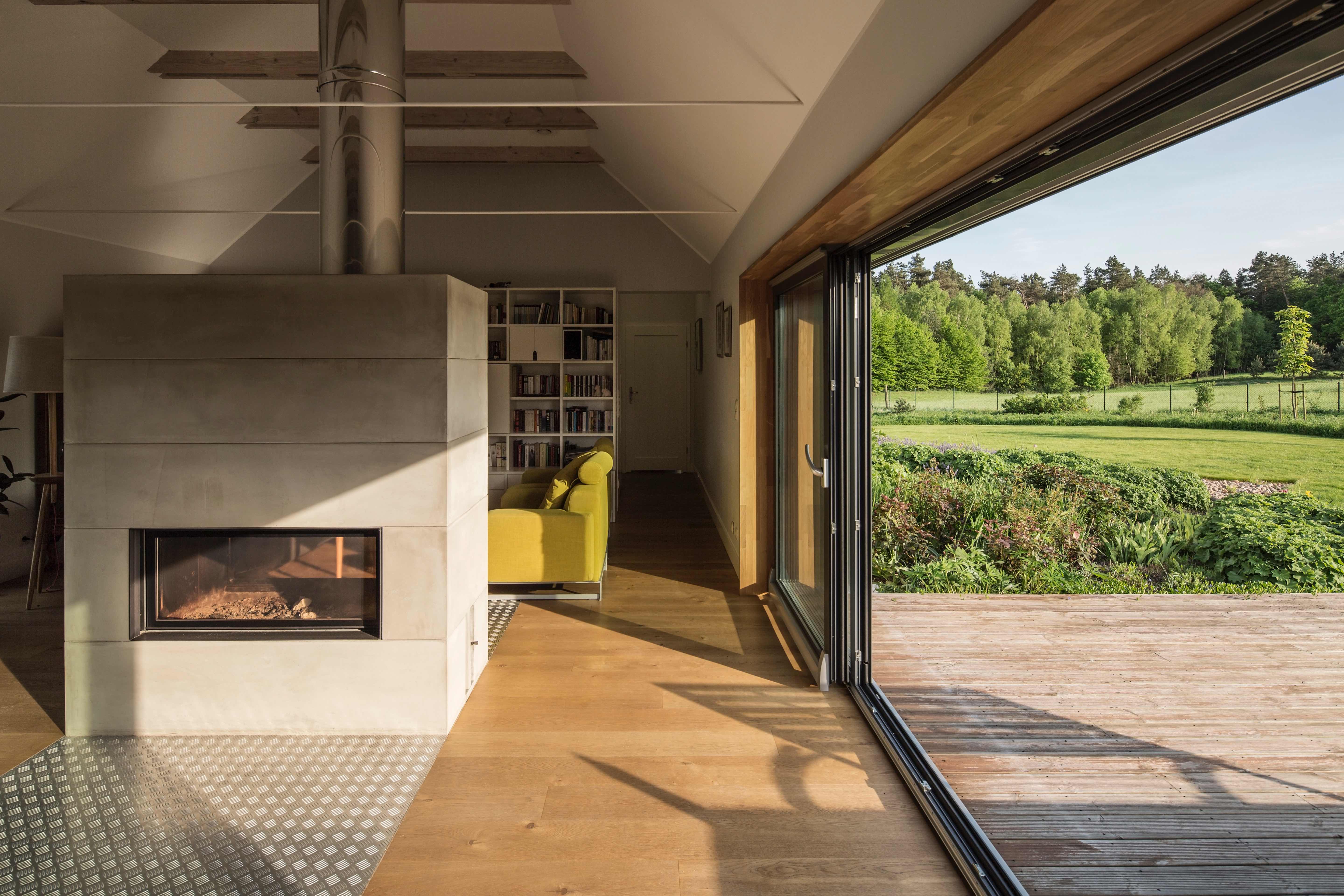 Wszystkie okna rozmieszczono tak, aby otwierały się na najpiękniejsze fragmenty krajobrazu. Wewnętrzne drewniane ramy tworzą naturalne „obrazy”, a szerokie parapety na wysokości siedziska pozwalają przysiąść i patrzeć w stronę ogrodu. Wnętrza cechuje prostota i naturalność – tak jak cały dom, zostały pomyślane jako przestrzeń, w której codzienność staje się lżejsza.