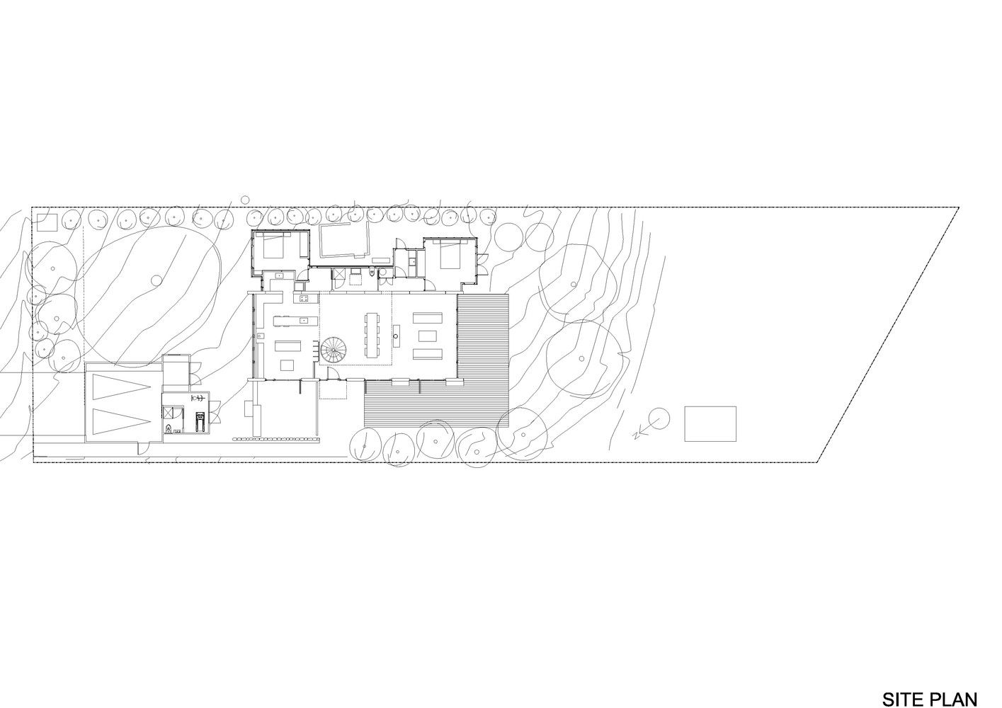 Pomysł na tę nowoczesną stodołę opierał się na stworzeniu dużej, centralnej przestrzeni, którą otaczają mniejsze pomieszczenia – tak jak kościół stojący w centrum małej wioski. Powierzchnie na antresoli, znajdujące się na obu końcach, mieszczą sypialnie oraz przestrzeń do pracy. Na górę wchodzi się po pięknych, spiralnych schodach, które swym wyglądem przypominają rzeźbę. Obie ściany końcowe są w pełni przeszklone. Rozmieszczenie konstrukcji na działce tworzy „alejkę”, która dopasowuje się do starego, kamiennego muru znajdującego się na sąsiedniej działce. Alejka biegnie do dużych, frontowych drzwi prowadzących do przestrzeni głównej domu. Drzwi bezpośrednio sąsiadują ze schodami i znajdują się pod przejściem łączącym obie platformy antresoli. Wchodząc do domu od razu zauważa się ogromną przestrzeń o podwójnej wysokości.