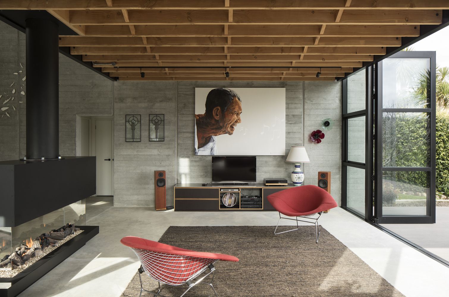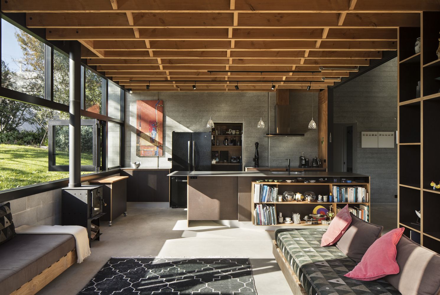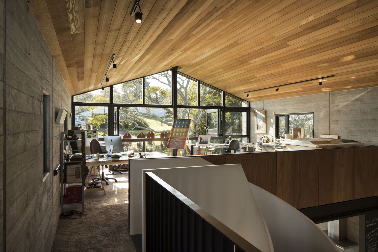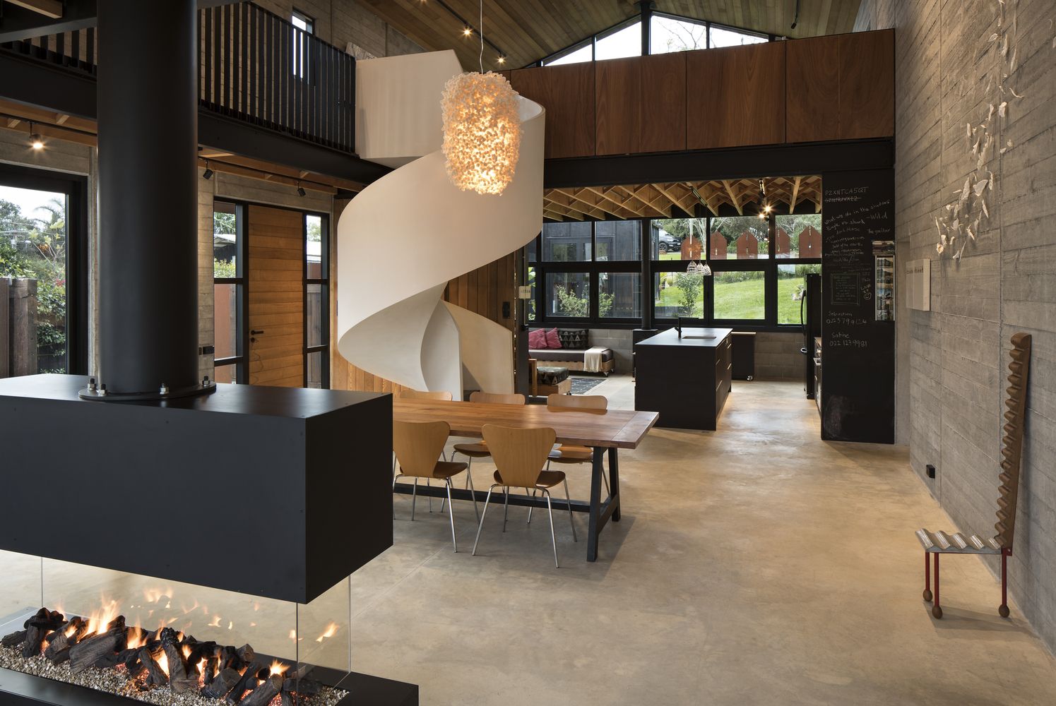 Architekci zdecydowali się na wykorzystanie lekkich, betonowych paneli Litecrete, które mają odpowiednie właściwości termoizolacyjne, dzięki czemu mogą pozostać odsłonięte z dwóch stron. Świetnie pasują też do stalowych belek i drewnianych podłóg, nadając wnętrzu spójny wygląd. Przestrzenie niższe na parterze tworzą pomieszczenia dla gości oraz przestrzenie dodatkowe o charakterze pomocniczym.
