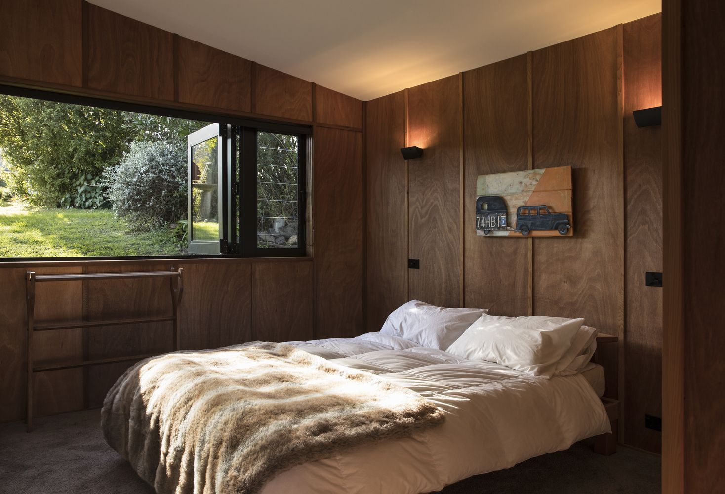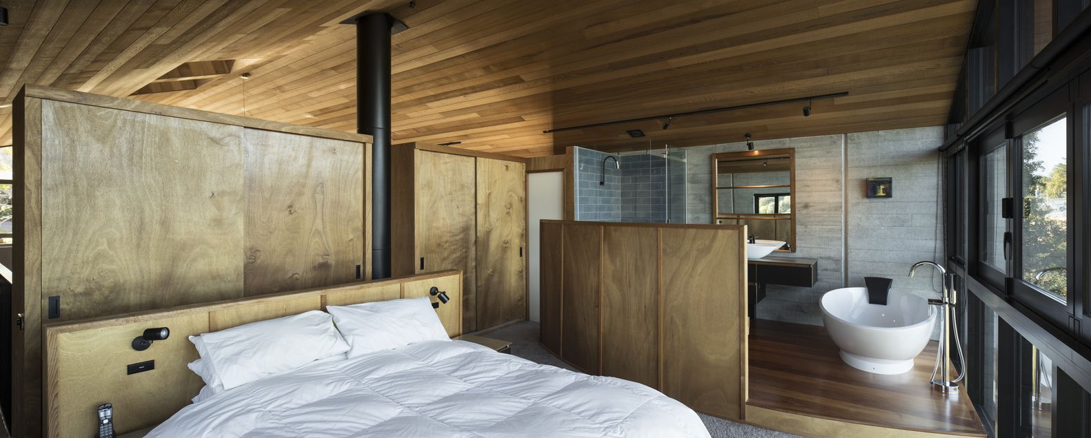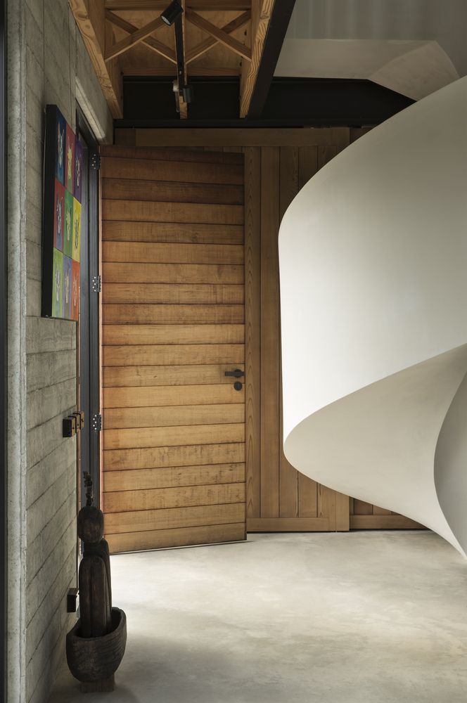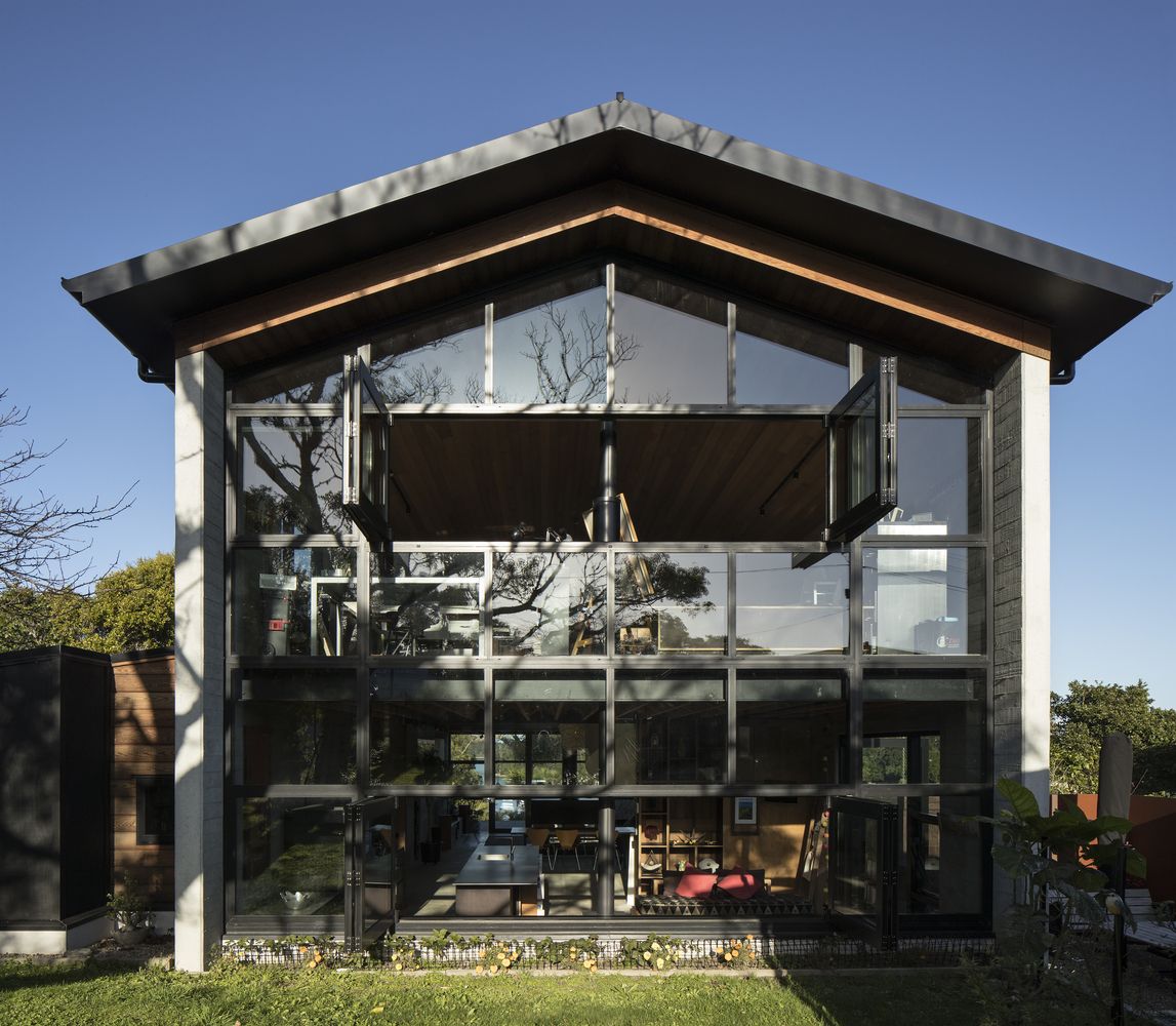 Architekci zdecydowali się na wykorzystanie lekkich, betonowych paneli Litecrete, które mają odpowiednie właściwości termoizolacyjne, dzięki czemu mogą pozostać odsłonięte z dwóch stron. Świetnie pasują też do stalowych belek i drewnianych podłóg, nadając wnętrzu spójny wygląd. Przestrzenie niższe na parterze tworzą pomieszczenia dla gości oraz przestrzenie dodatkowe o charakterze pomocniczym.