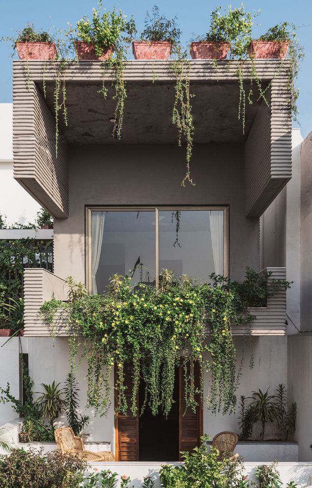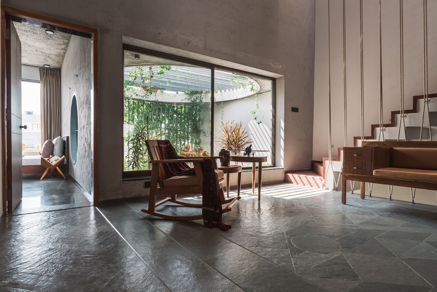 Funkcje domu zostały rozplanowane pionowo — półprywatne przestrzenie umieszczono na parterze, natomiast strefy prywatne na wyższych kondygnacjach. Centralnym elementem budynku jest dziedziniec o podwójnej wysokości, porośnięty roślinami pnącymi i płożącymi, który pełni rolę zielonego bufora oraz naturalnej wentylacji. Forma domu nawiązuje do Shikhara, tradycyjnej architektury hinduskiej świątyni, działając jak tunel wiatrowy i pasywny system chłodzenia. Okrągłe okna w sypialniach kadrują konkretne widoki, a naturalne materiały i faktury harmonijnie współgrają z roślinnością, podkreślając ekologiczny i zrównoważony charakter projektu.