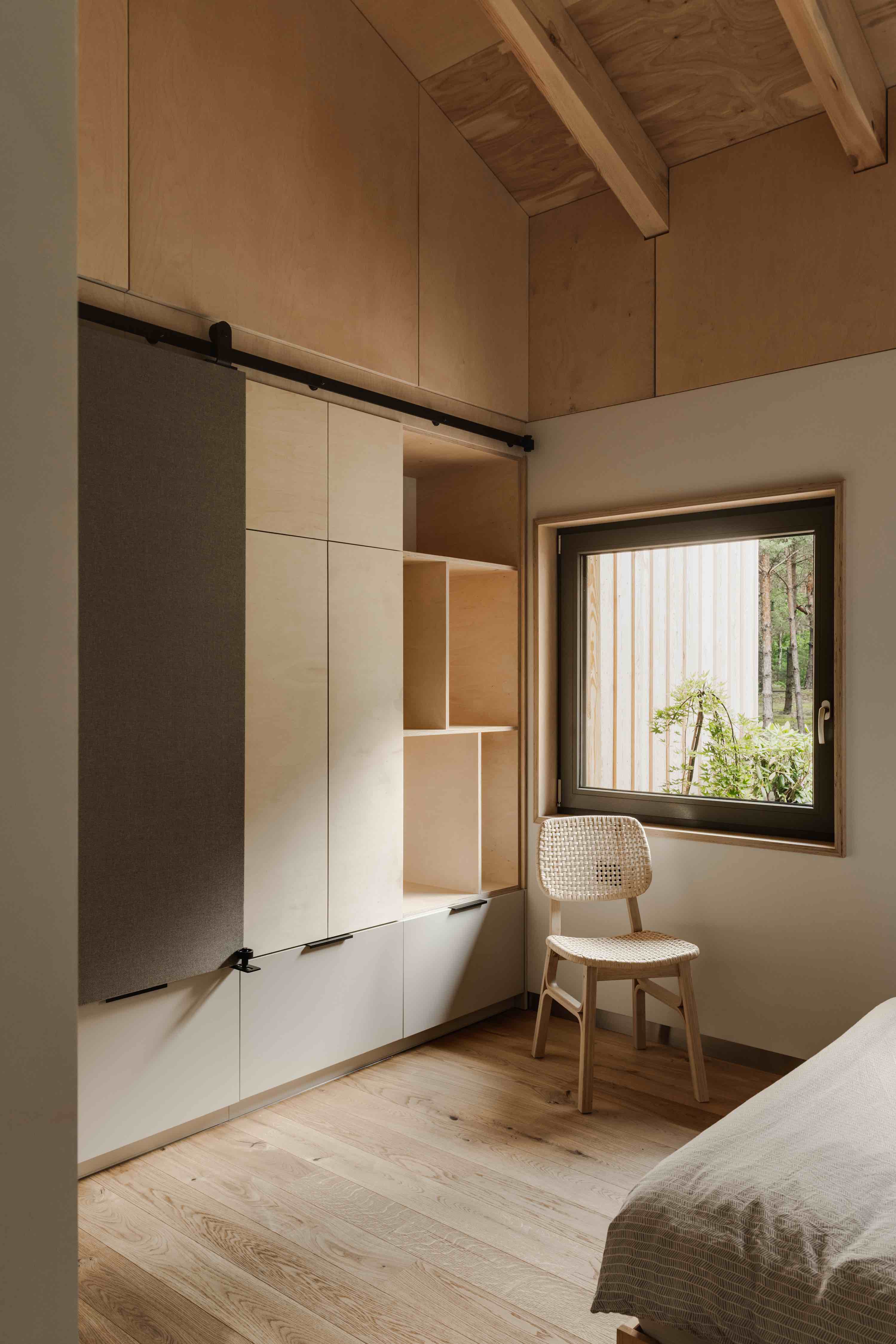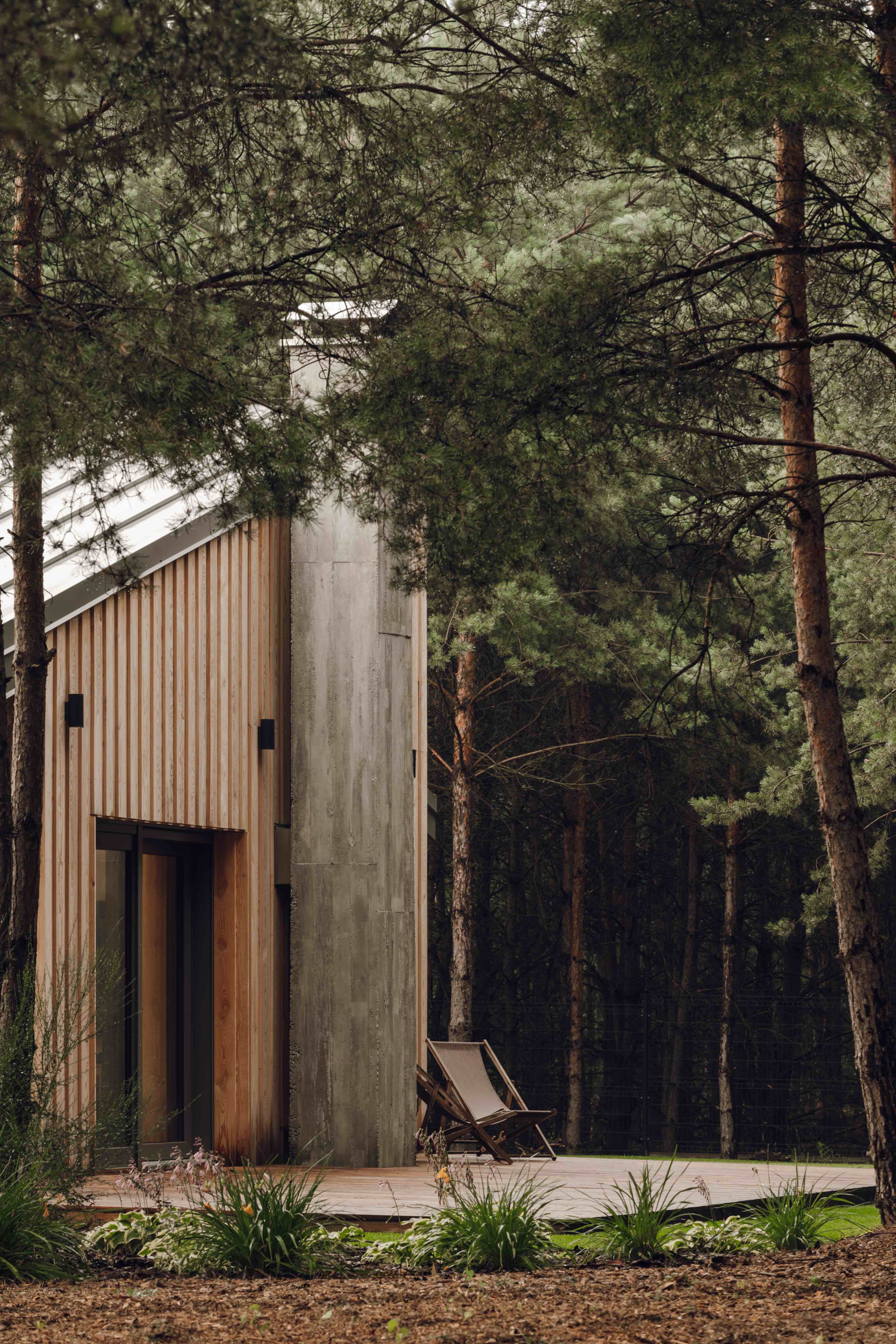 Tłem dla domu jest młody sosnowy las, który będzie się zmieniał przez kolejne dekady – nieprzewidywalnie, organicznie i poza kontrolą człowieka. Projekt wykorzystuje ten potencjał: nieregularnie rozrzucone między drzewami fragmenty bryły, a przede wszystkim duże otwory okienne sprawiają, że światło filtrujące przez las staje się integralną częścią wnętrz. Okna zaprojektowano tak, by w sposób kontrolowany kadrowały widoki i wprowadzały naturę do środka, tworząc efekt „żywych obrazów”.