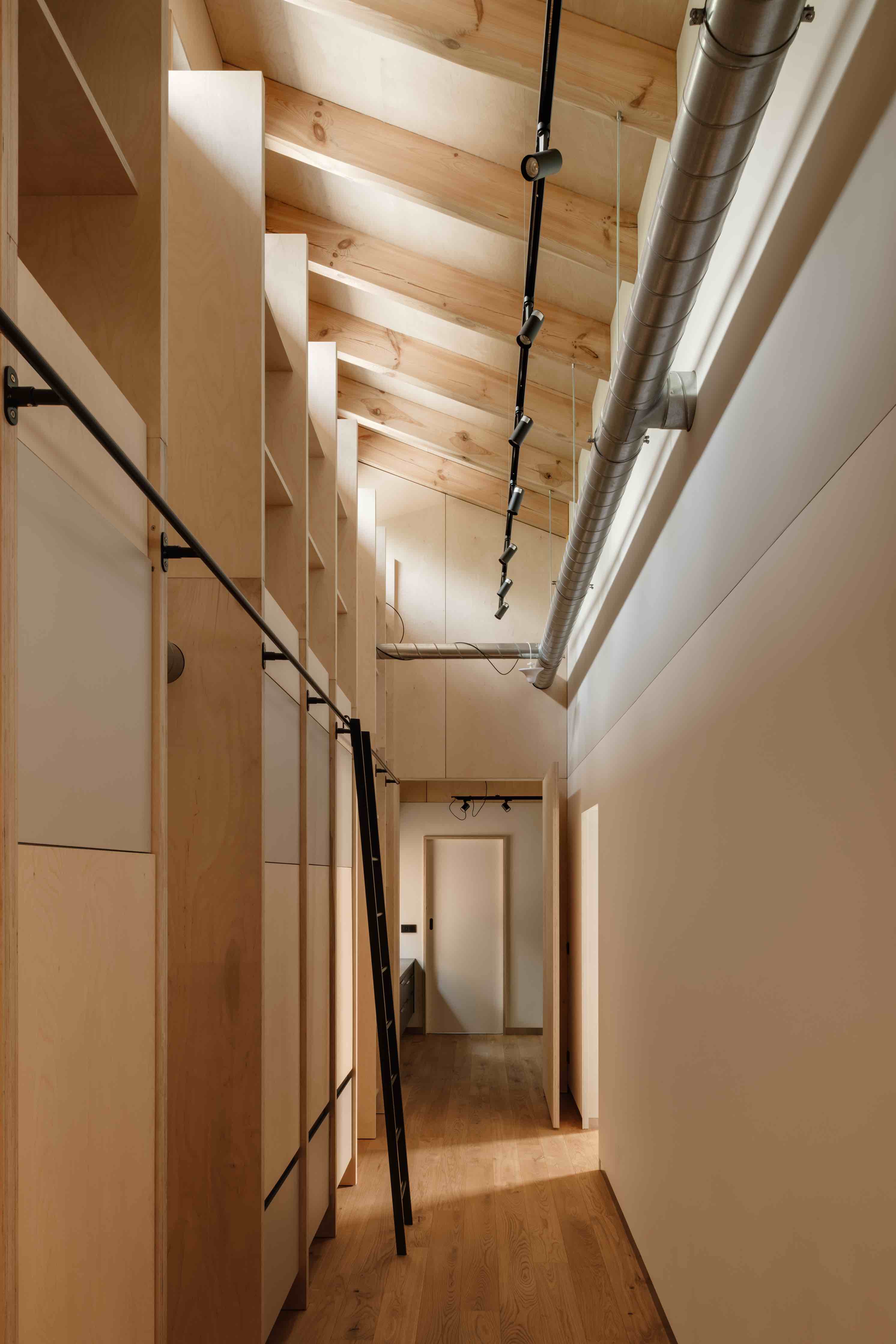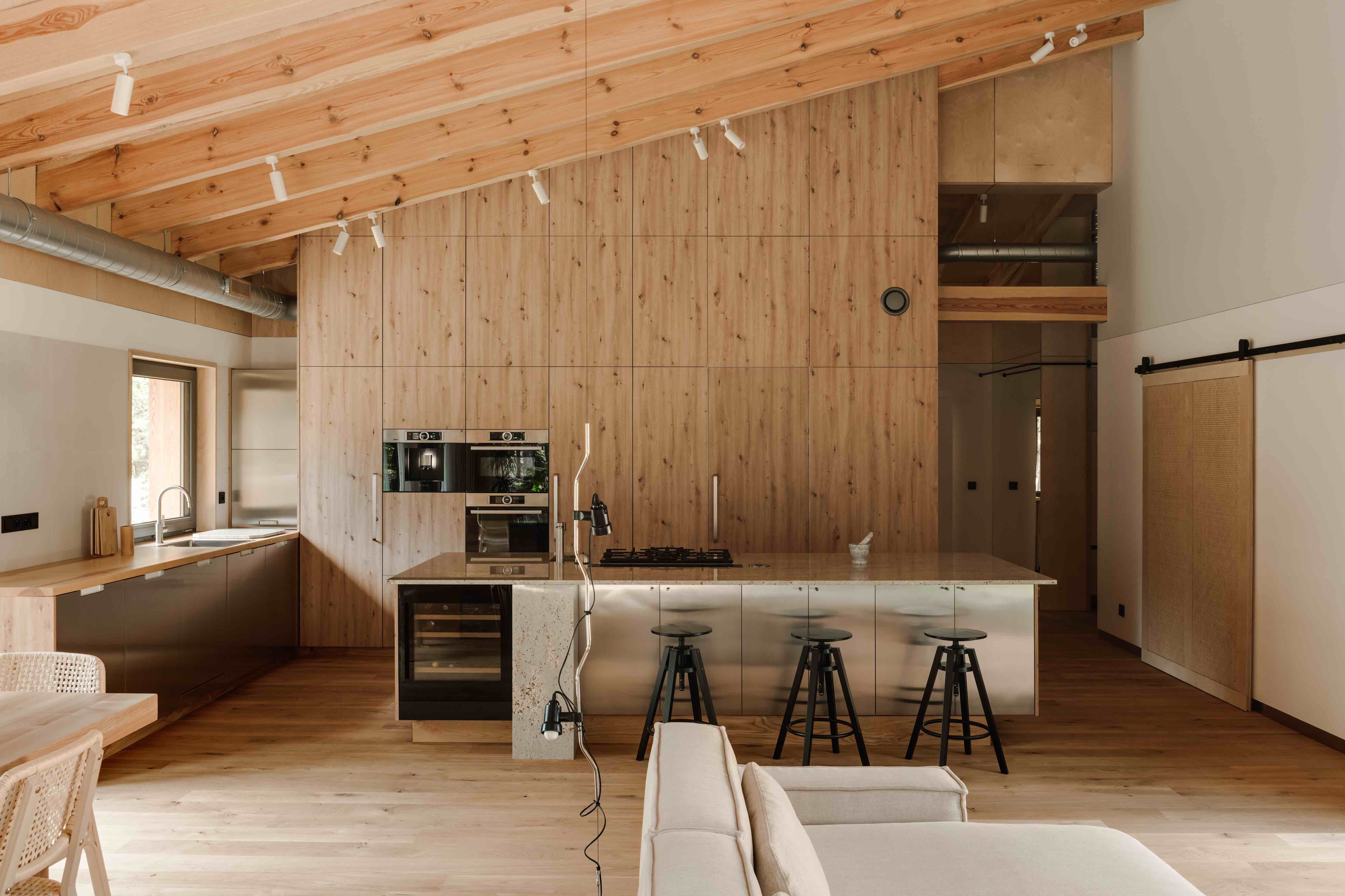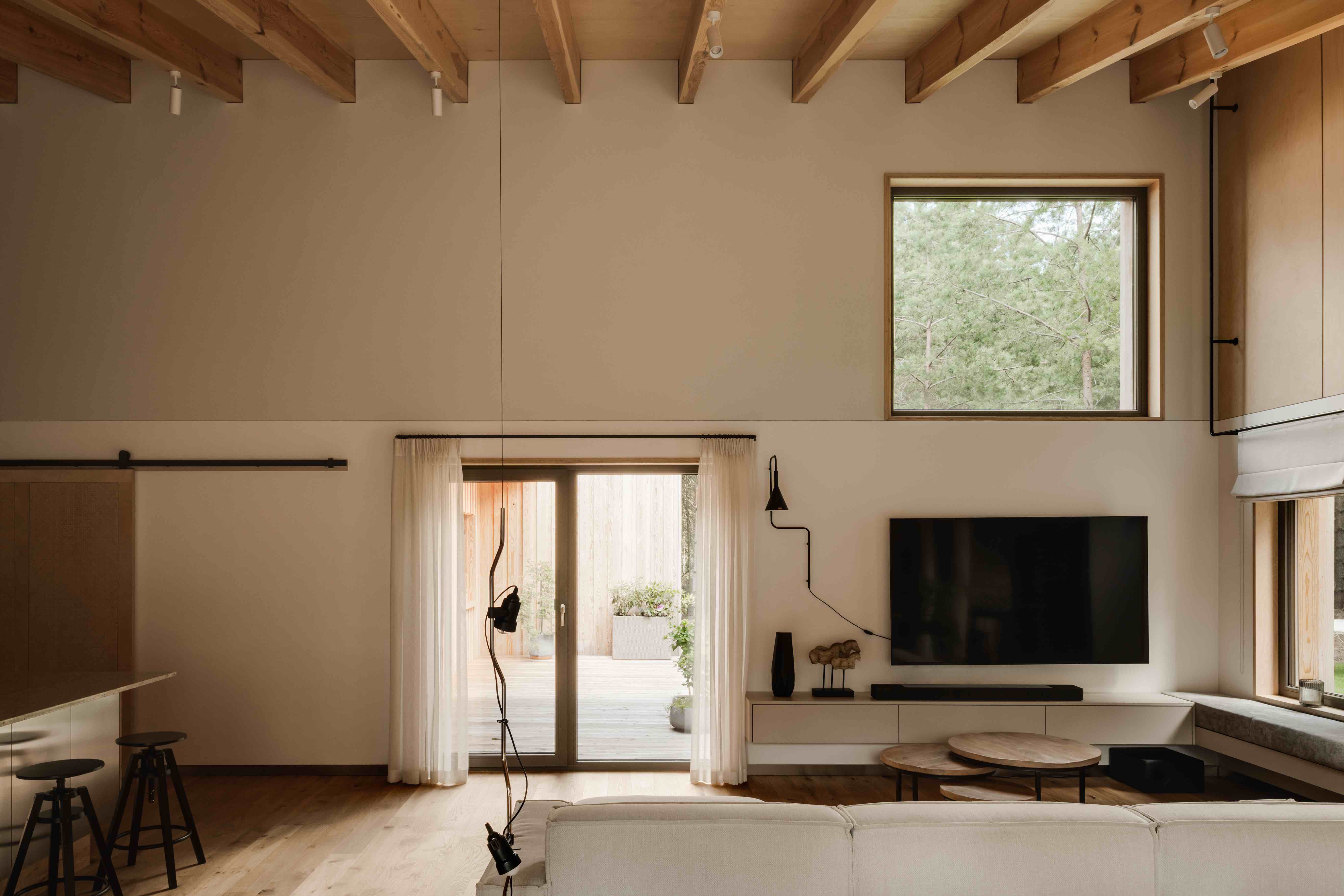 Dom zaprojektowano w technologii szkieletowej, wykorzystując drewno zarówno jako materiał konstrukcyjny, jak i wykończeniowy. Wnętrza w dużej mierze tworzy sklejka liściasta, która pełni funkcję dekoracyjną, ociepla przestrzeń i buduje spójny charakter domu. Z niej powstały również elementy zabudowy meblowej, dzięki czemu całość zachowuje minimalistyczną, ale przyjazną i naturalną estetykę.