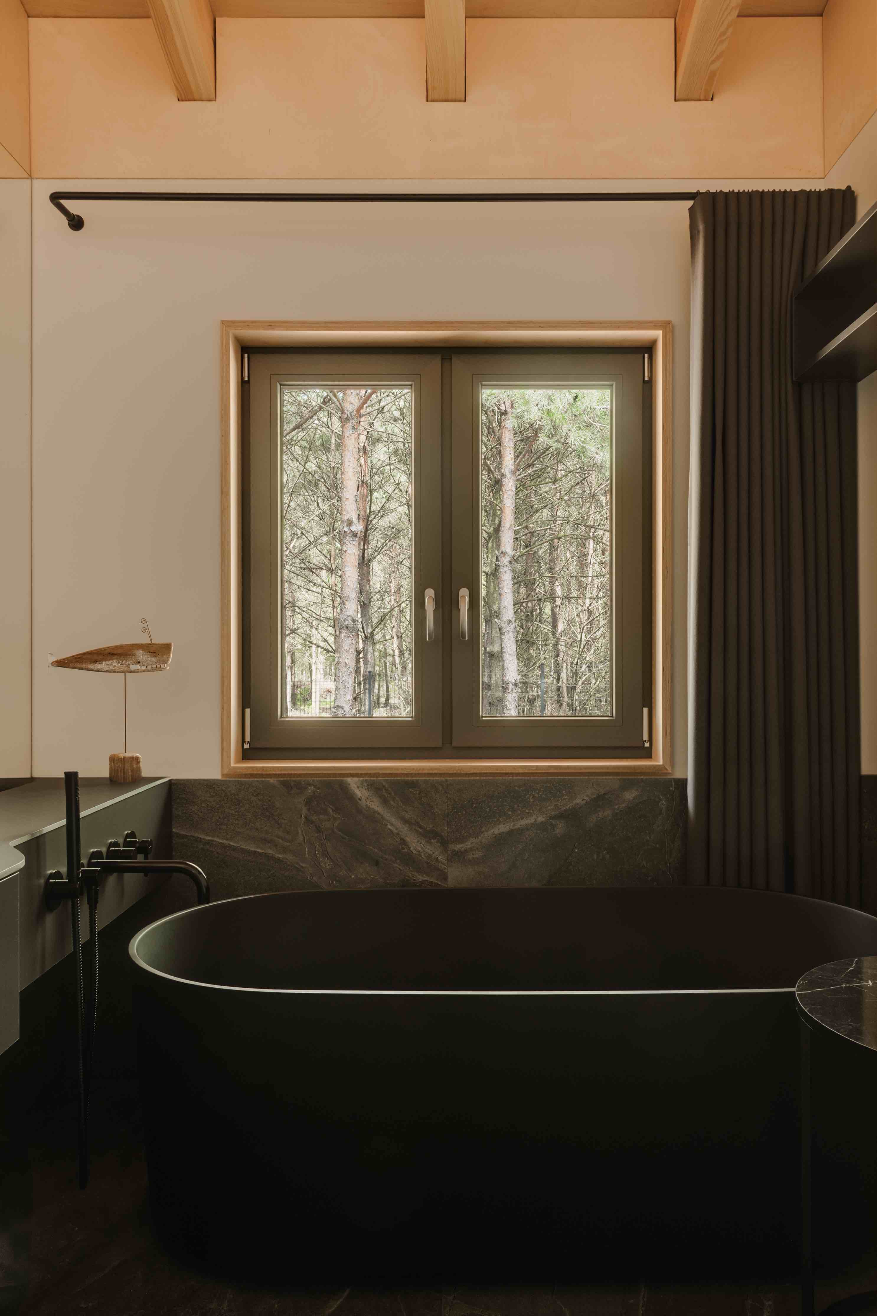 Szczególnie ważne było zaprojektowanie okien w sposób, który nie tylko zapewnia dobre doświetlenie, ale również tworzy relację z otaczającym lasem. Każde okno ma swój sens i cel – kadruje konkretne fragmenty krajobrazu, prowadzi wzrok na korony drzew lub w stronę smug światła przenikających między pniami. To natura wprowadza kolor, rytm i atmosferę do wnętrza.