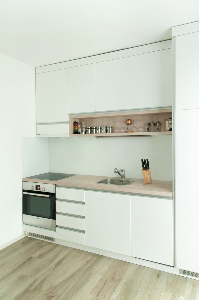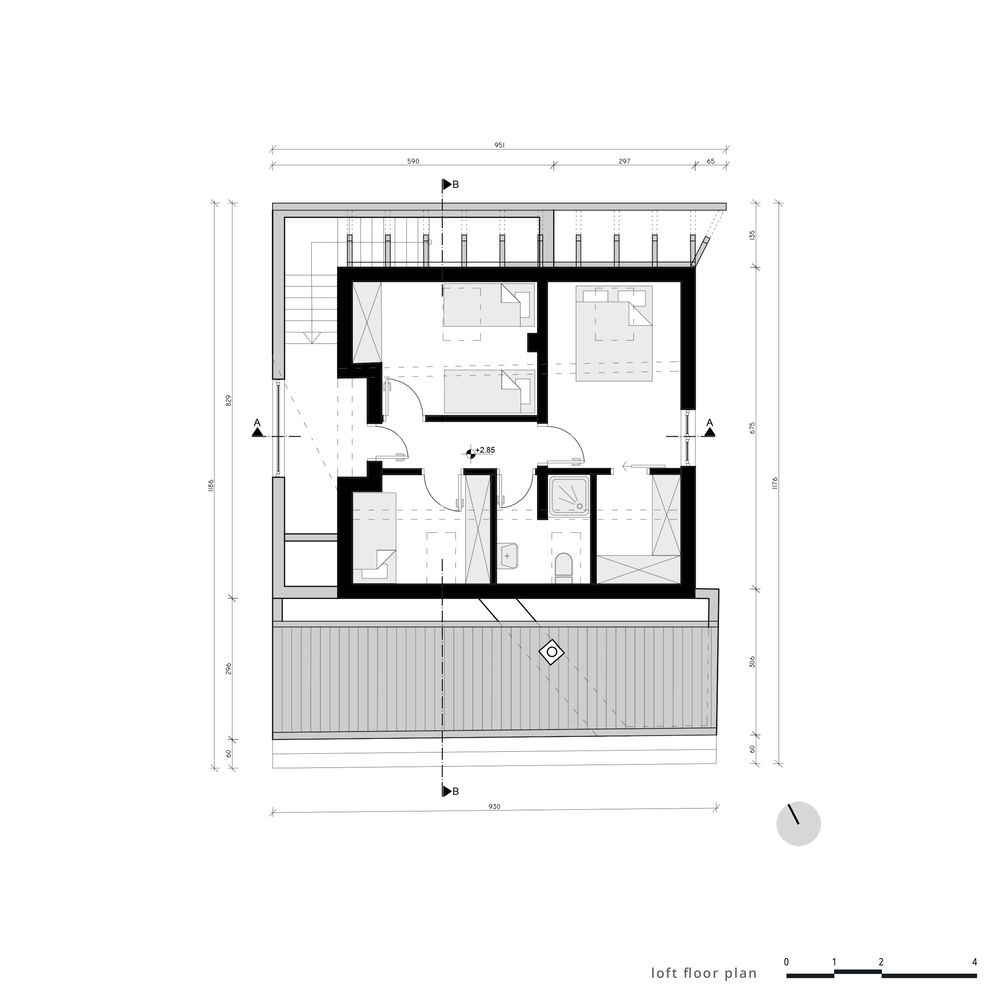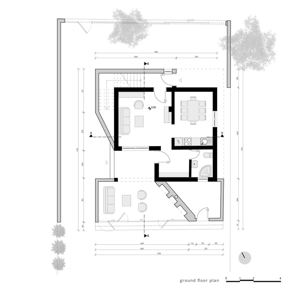 Funkcjonalnie dom został podzielony na dwa poziomy. Parter mieści salon, kuchnię z jadalnią oraz taras, a na strychu znajdują się trzy sypialnie i łazienka. Wszystko zaprojektowane zgodnie z uwielbianym przez właścicielki minimalizmem. Wejście do domu znajduje się po stronie północnej, a po stronie południowej istniejący dom powiększono i zakończono go tarasem, który tworzy przestrzeń przejściową między wnętrzem i ogrodem.