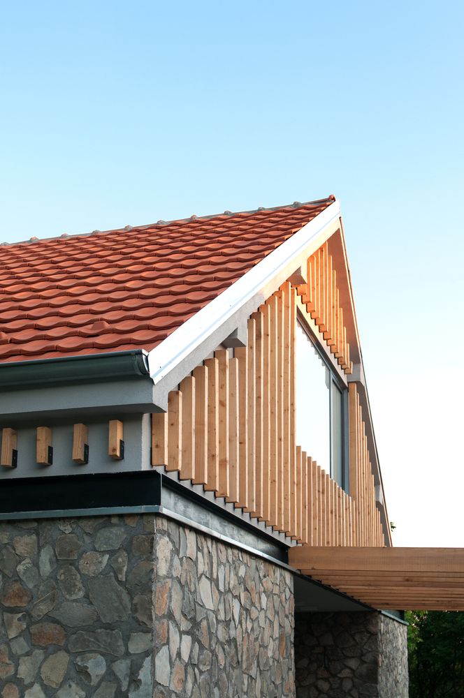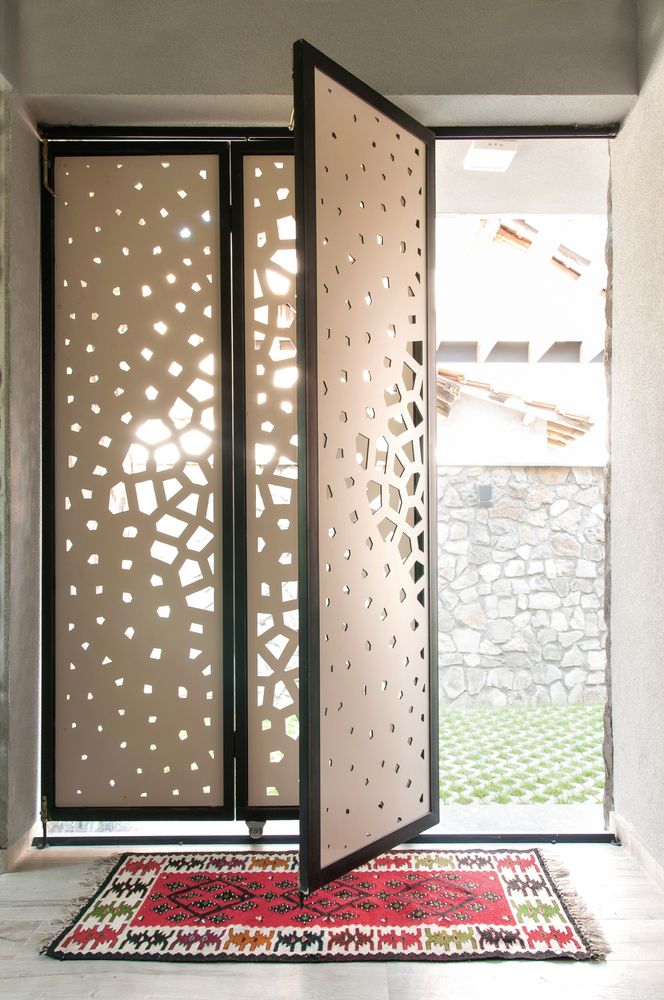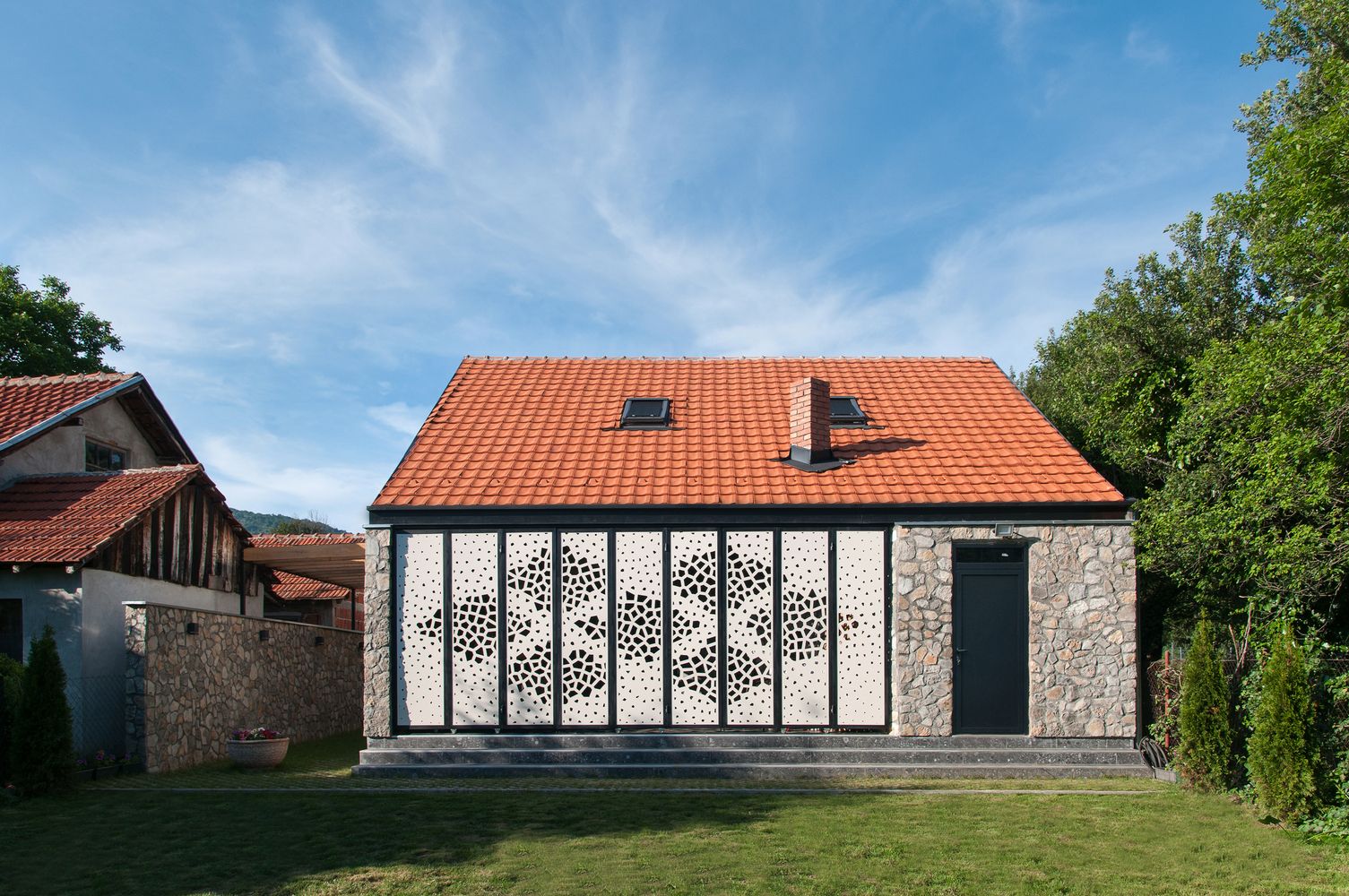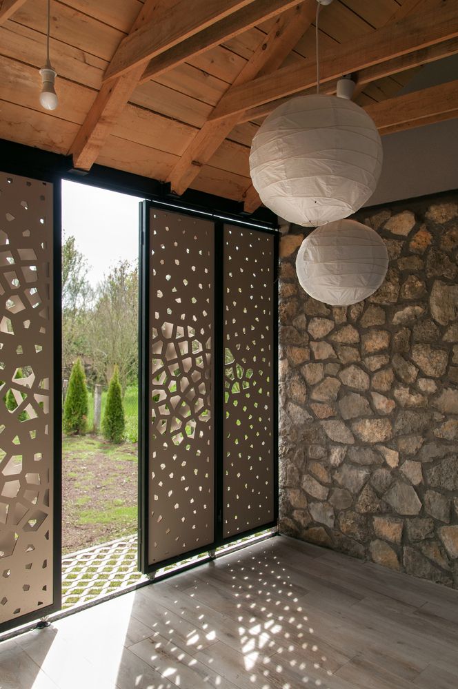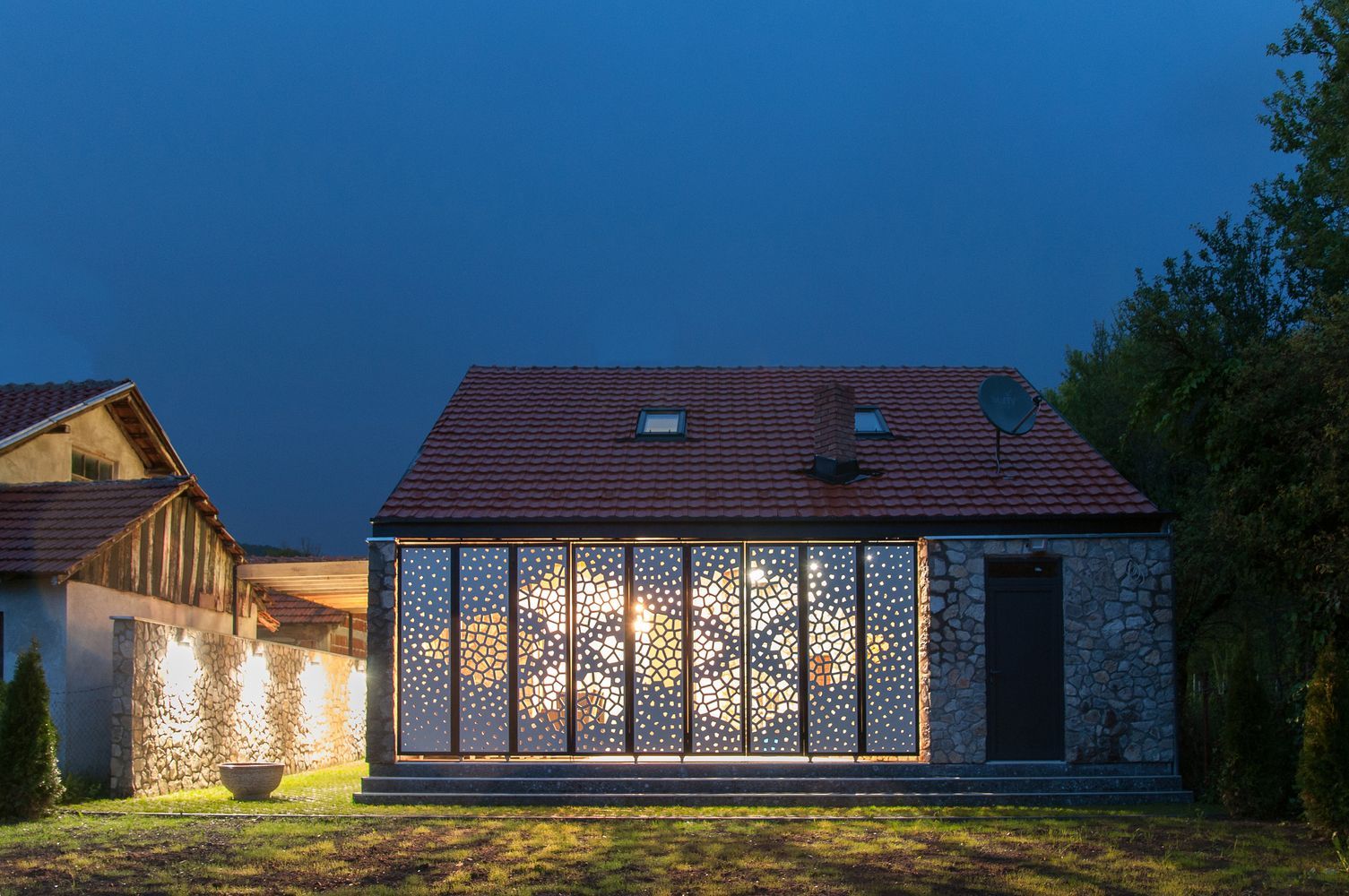 Po stronie końcowej tarasu umieszczono przesuwne, perforowane panele, które chronią wnętrze przed słońcem. Panele zostały wykonane w oparciu o cyfrowy projekt i inspirowane są geometrycznymi motywami znanymi z ćilimu, tradycyjnego dywanu ze wschodniej Serbii. Dzięki otworom pojawia się w środku wyjątkowa gra światła i cienia, tworząc różne efekty świetlne na przestrzeniach wewnętrznych.
