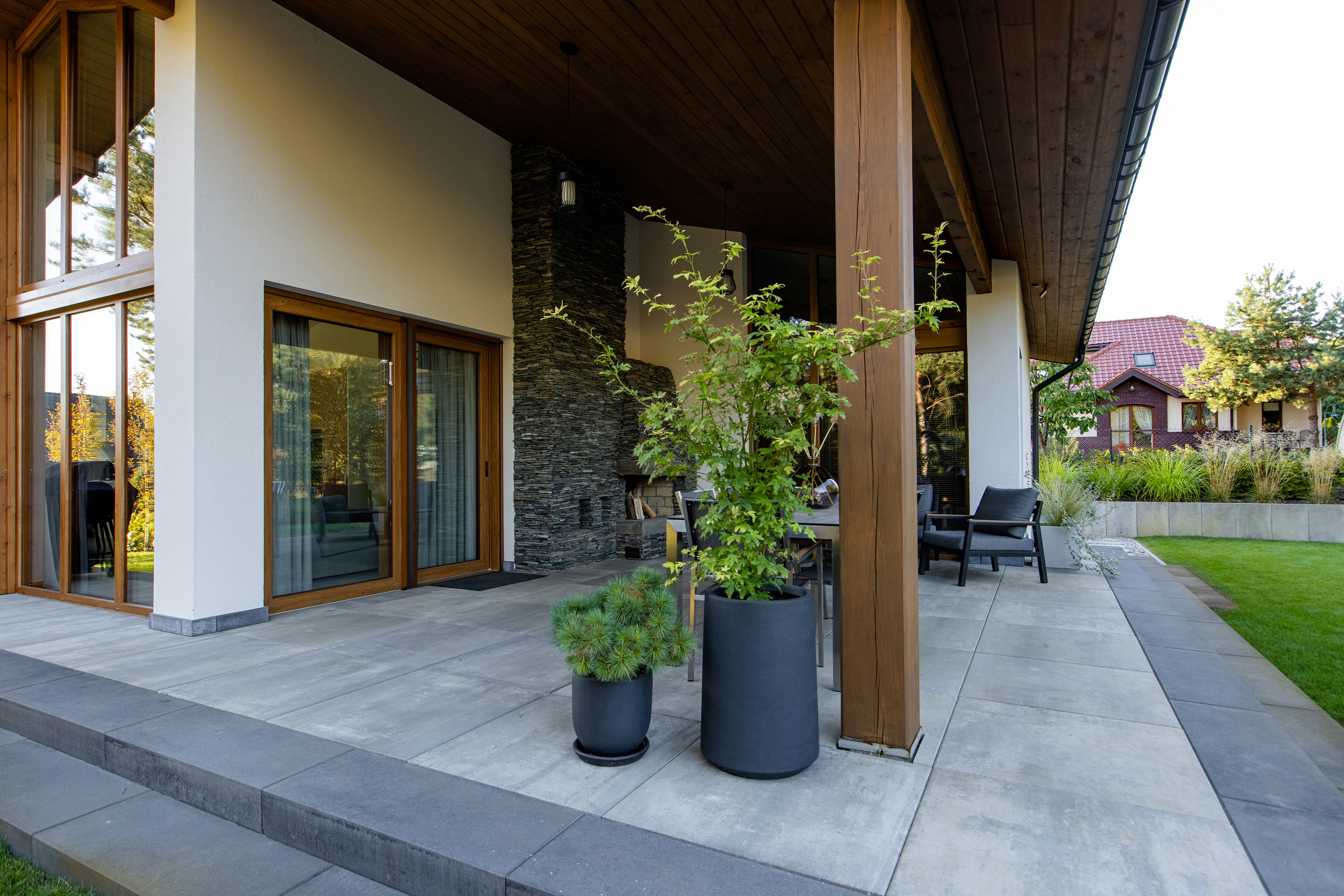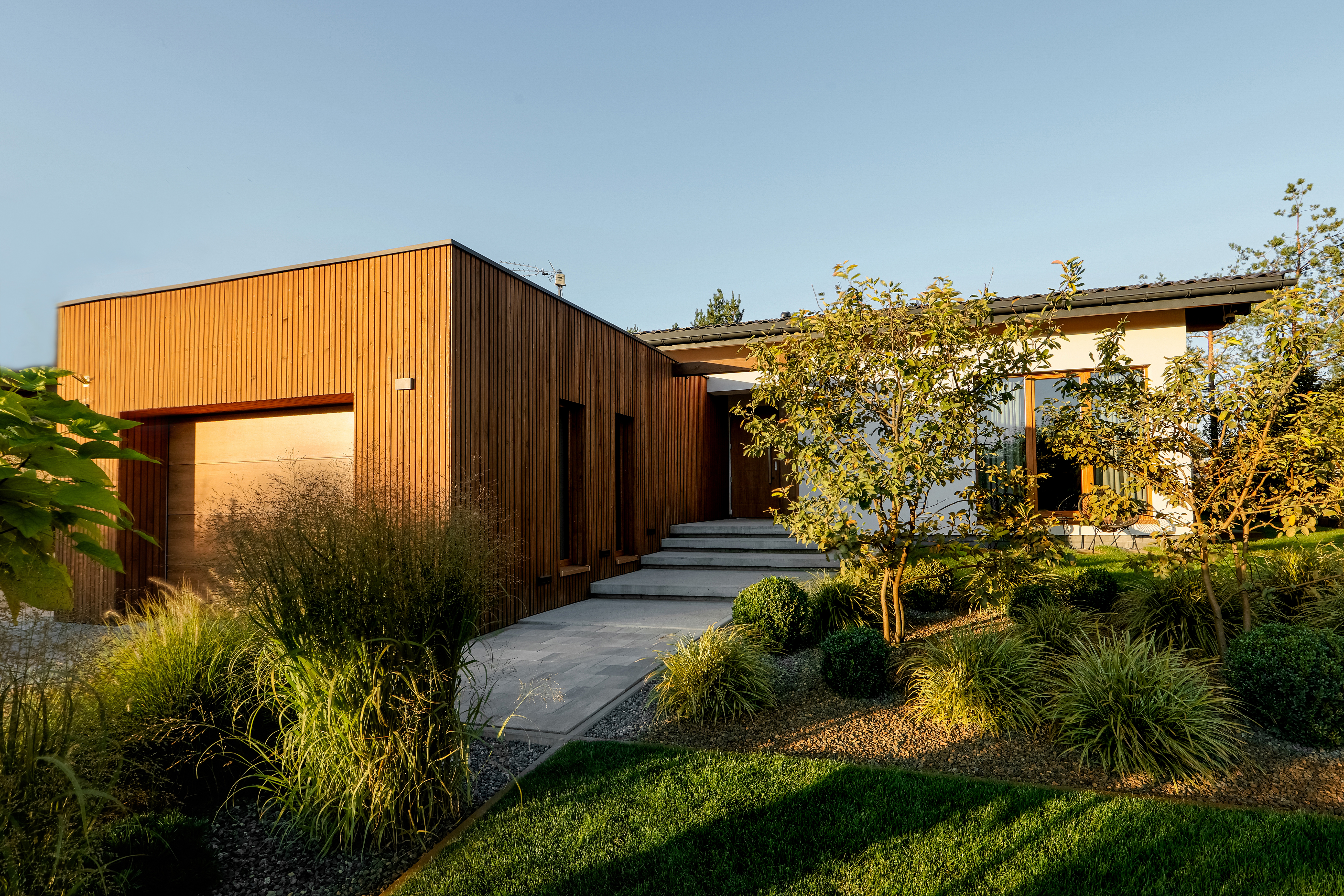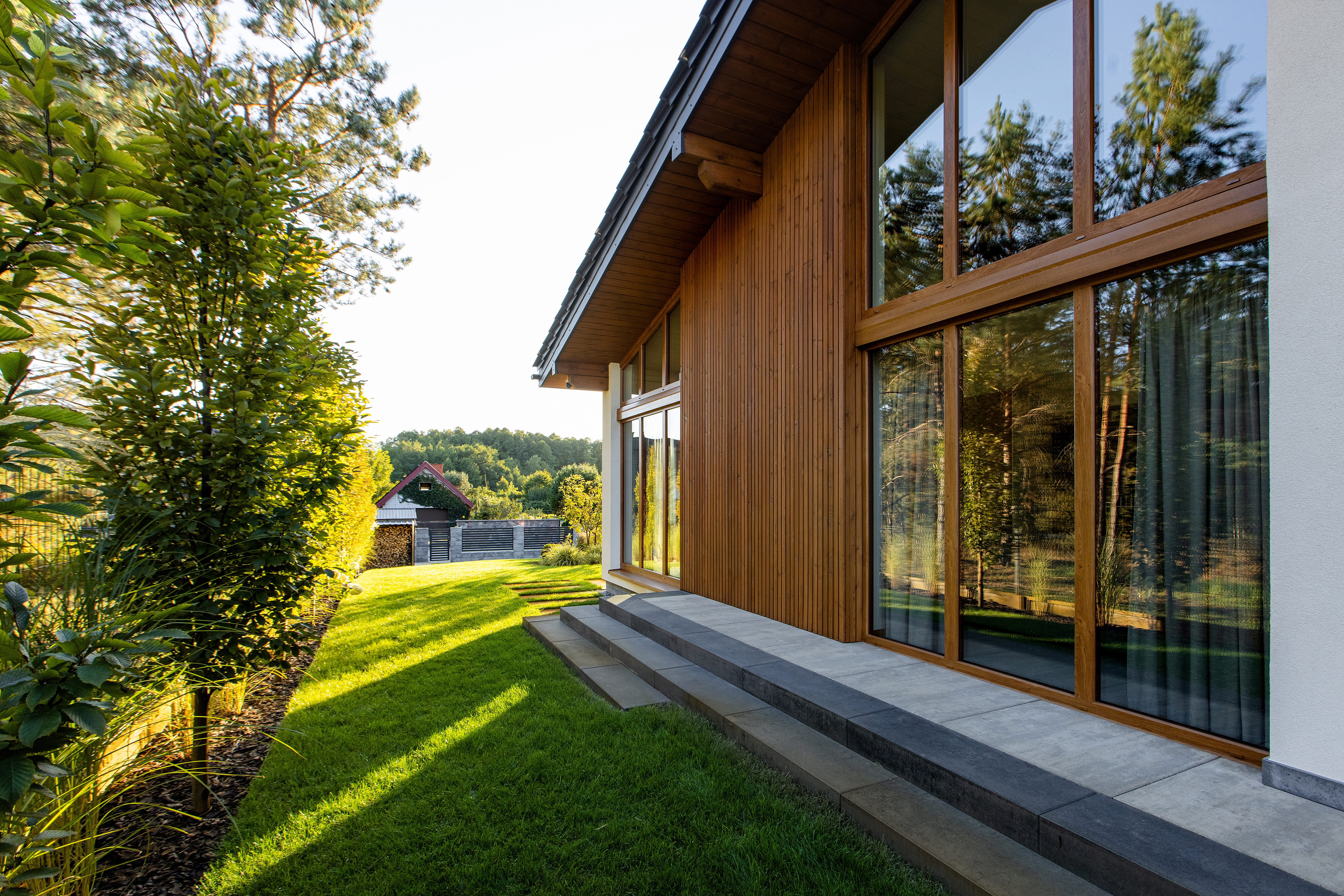 Wykorzystane naturalne materiały, jak drewno i kamień, oddają ciepło oraz elegancję, które doskonale współgrają z nowoczesnymi detalami. To połączenie tworzy przytulną atmosferę, idealną do wypoczynku w otoczeniu natury, zachowując jednocześnie nowoczesny charakter domu.