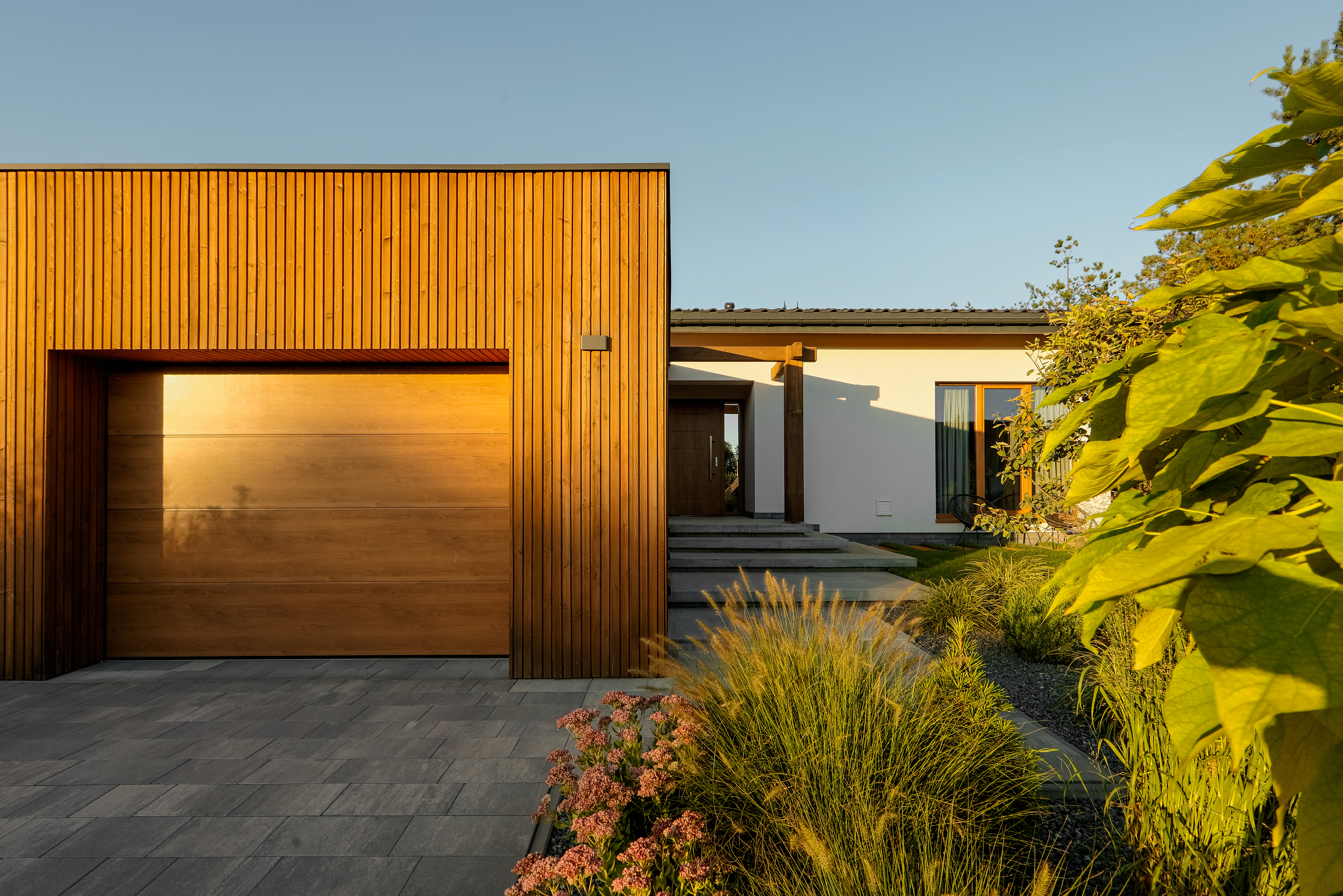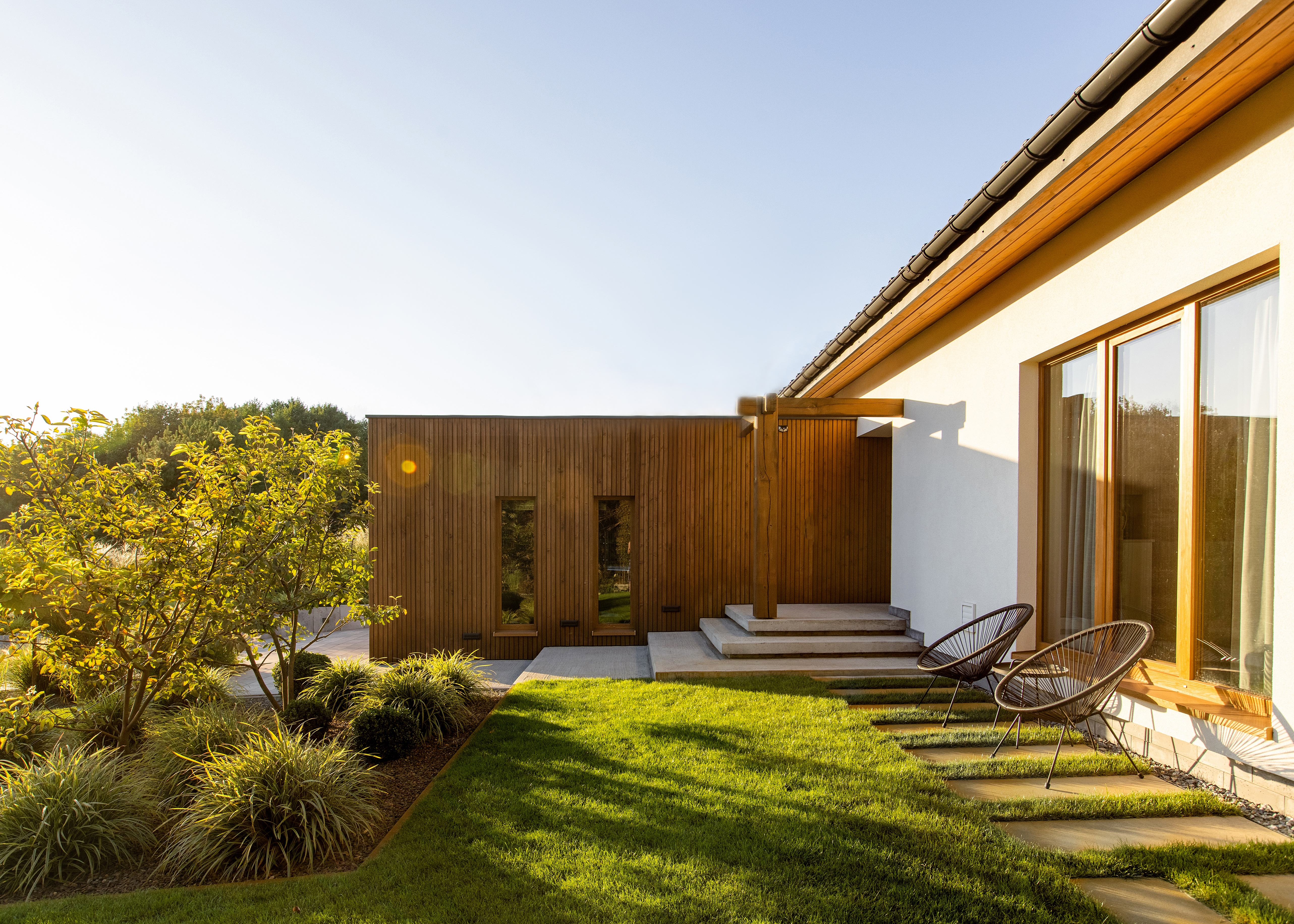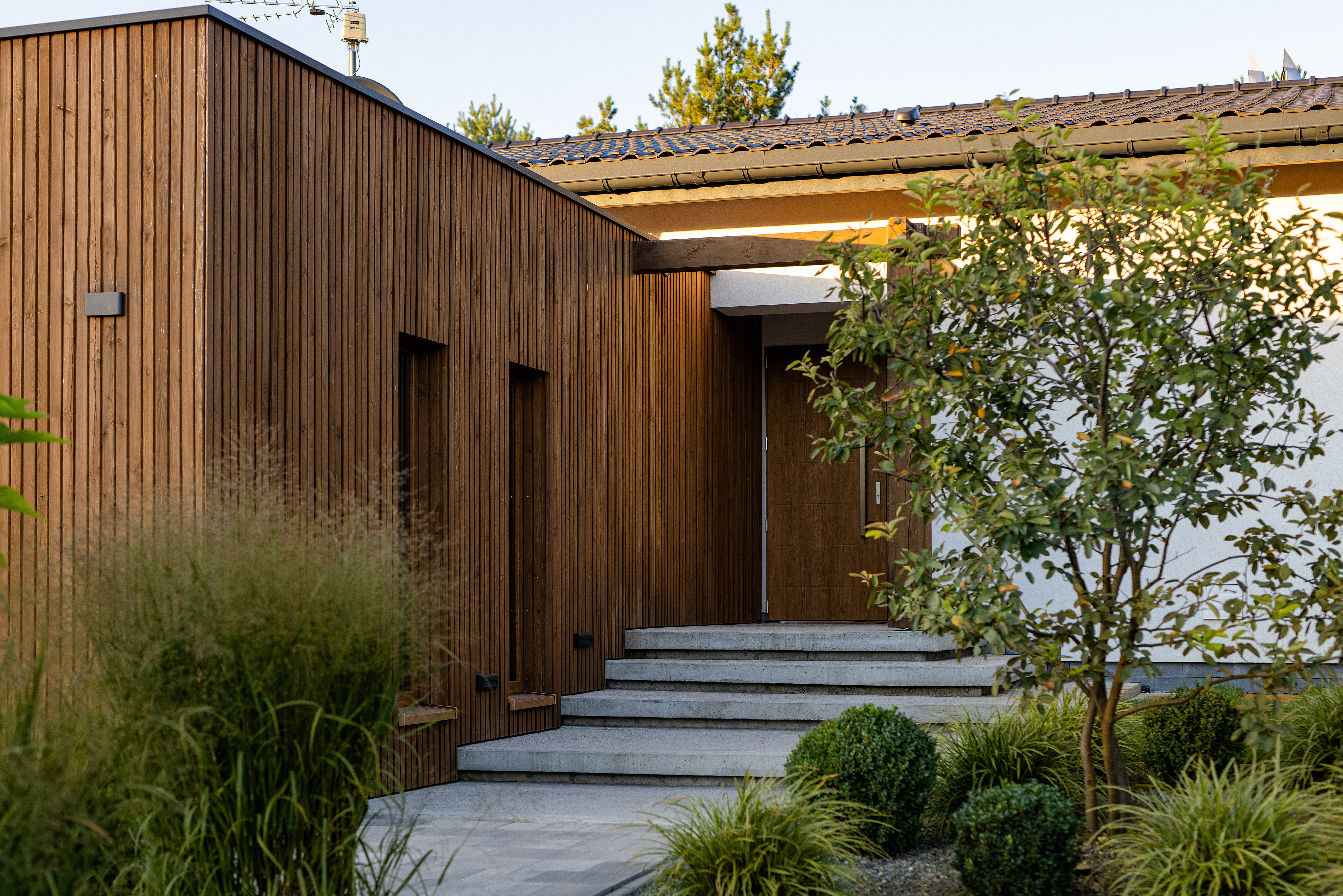 Wykorzystane naturalne materiały, jak drewno i kamień, oddają ciepło oraz elegancję, które doskonale współgrają z nowoczesnymi detalami. To połączenie tworzy przytulną atmosferę, idealną do wypoczynku w otoczeniu natury, zachowując jednocześnie nowoczesny charakter domu.
